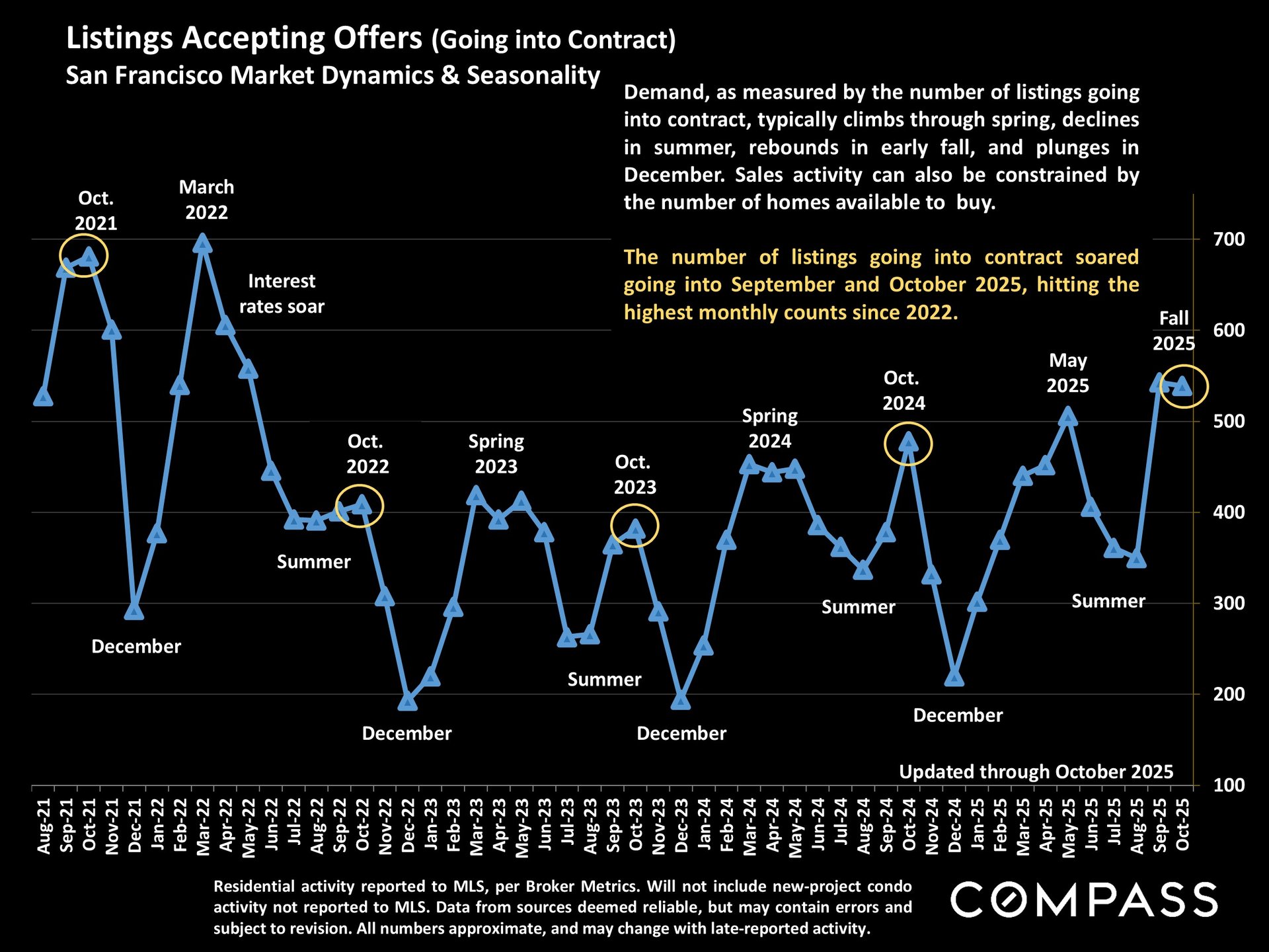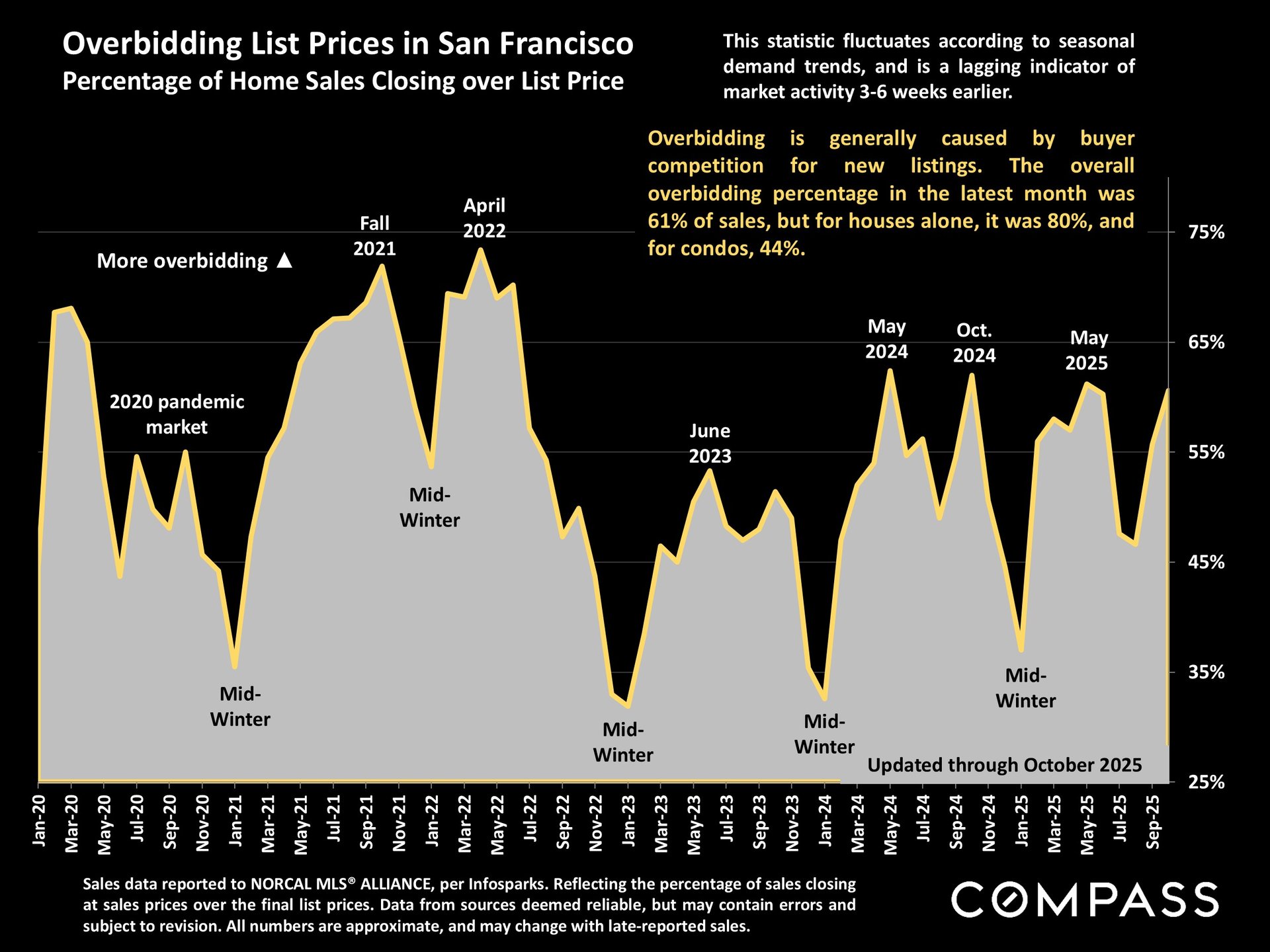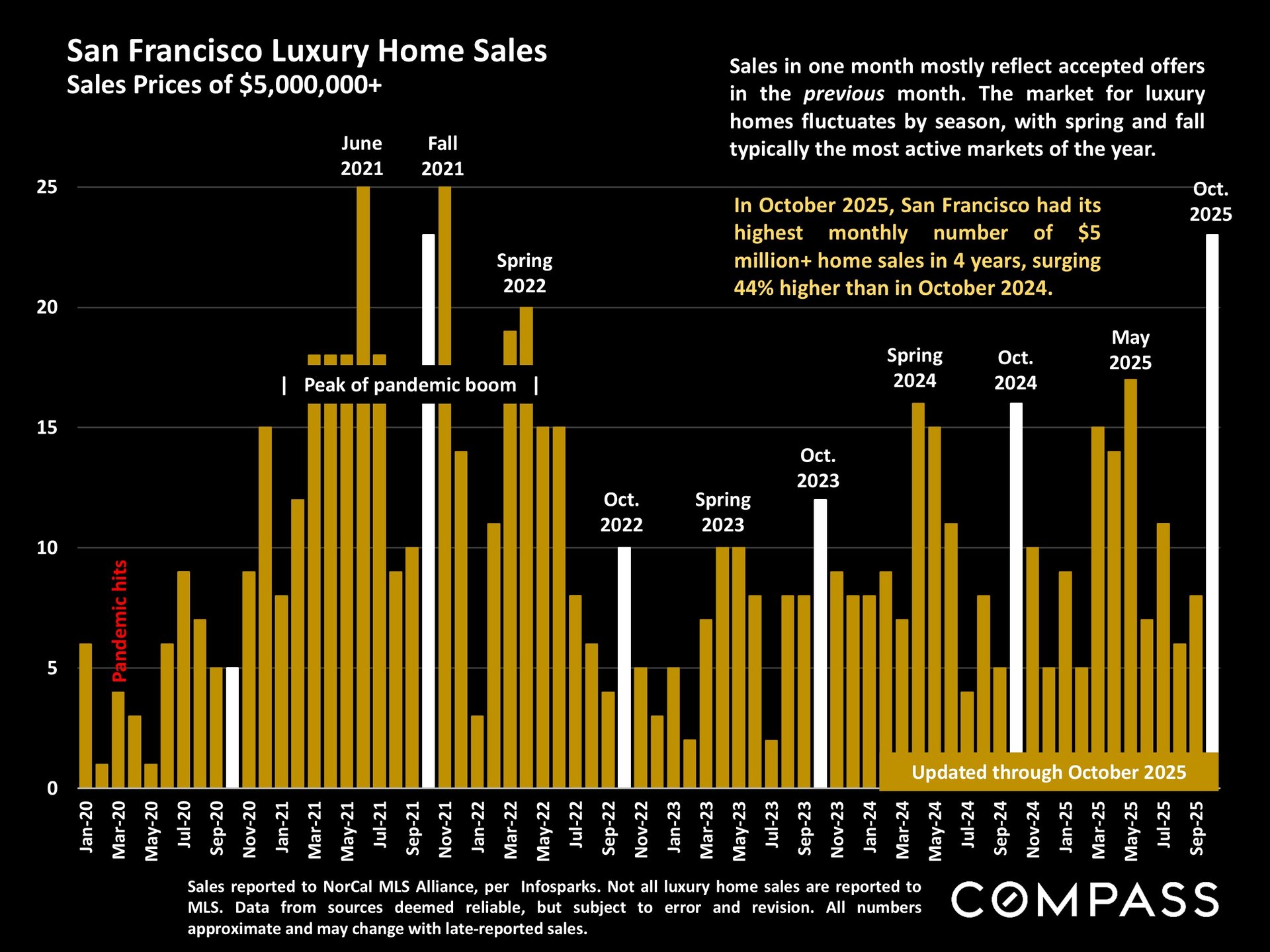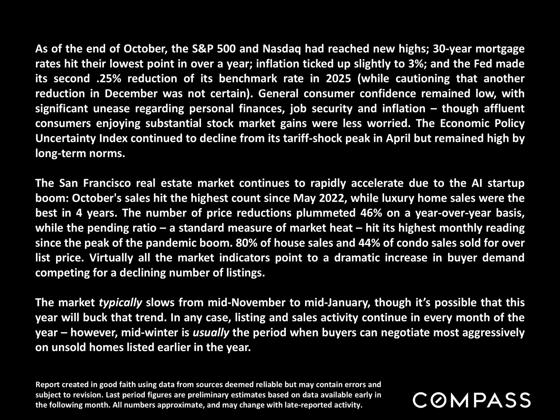 As of the end of October, the S&P 500 and Nasdaq had reached new highs; 30-year mortgage rates hit their lowest point in over a year; inflation ticked up slightly to 3%; and the Fed made its second .25% reduction of its benchmark rate in 2025 (while cautioning that another reduction in December was not certain). General consumer confidence remained low, with significant unease regarding personal finances, job security and inflation – though affluent consumers enjoying substantial stock market gains were less worried. The Economic Policy Uncertainty Index continued to decline from its tariff-shock peak in April but remained high by long-term norms. The San Francisco real estate market continues to rapidly accelerate due to the AI startup boom: October's sales hit the highest count since May 2022, while luxury home sales were the best in 4 years. The number of price reductions plummeted 46% on a year-over-year basis, while the pending ratio – a standard measure of market heat – hit its highest monthly reading since the peak of the pandemic boom. 80% of house sales and 44% of condo sales sold for over list price. Virtually all the market indicators point to a dramatic increase in buyer demand competing for a declining number of listings. The market typically slows from mid-November to mid-January, though it’s possible that this year will buck that trend. In any case, listing and sales activity continue in every month of the year – however, mid-winter is usually the period when buyers can negotiate most aggressively on unsold homes listed earlier in the year.