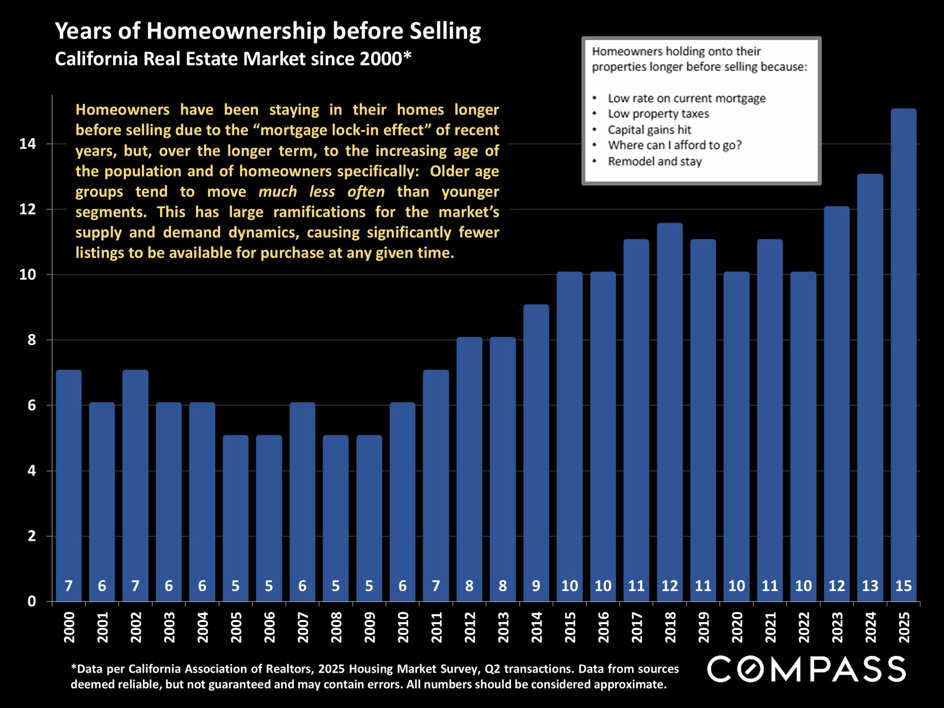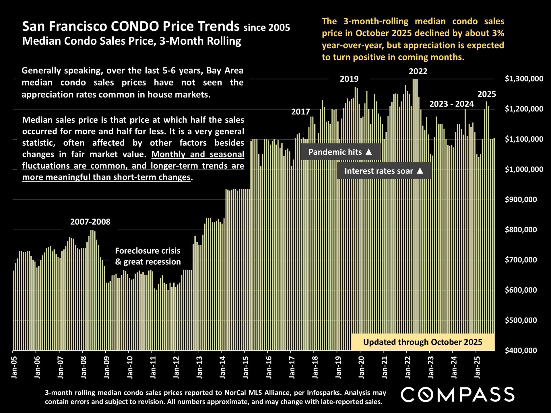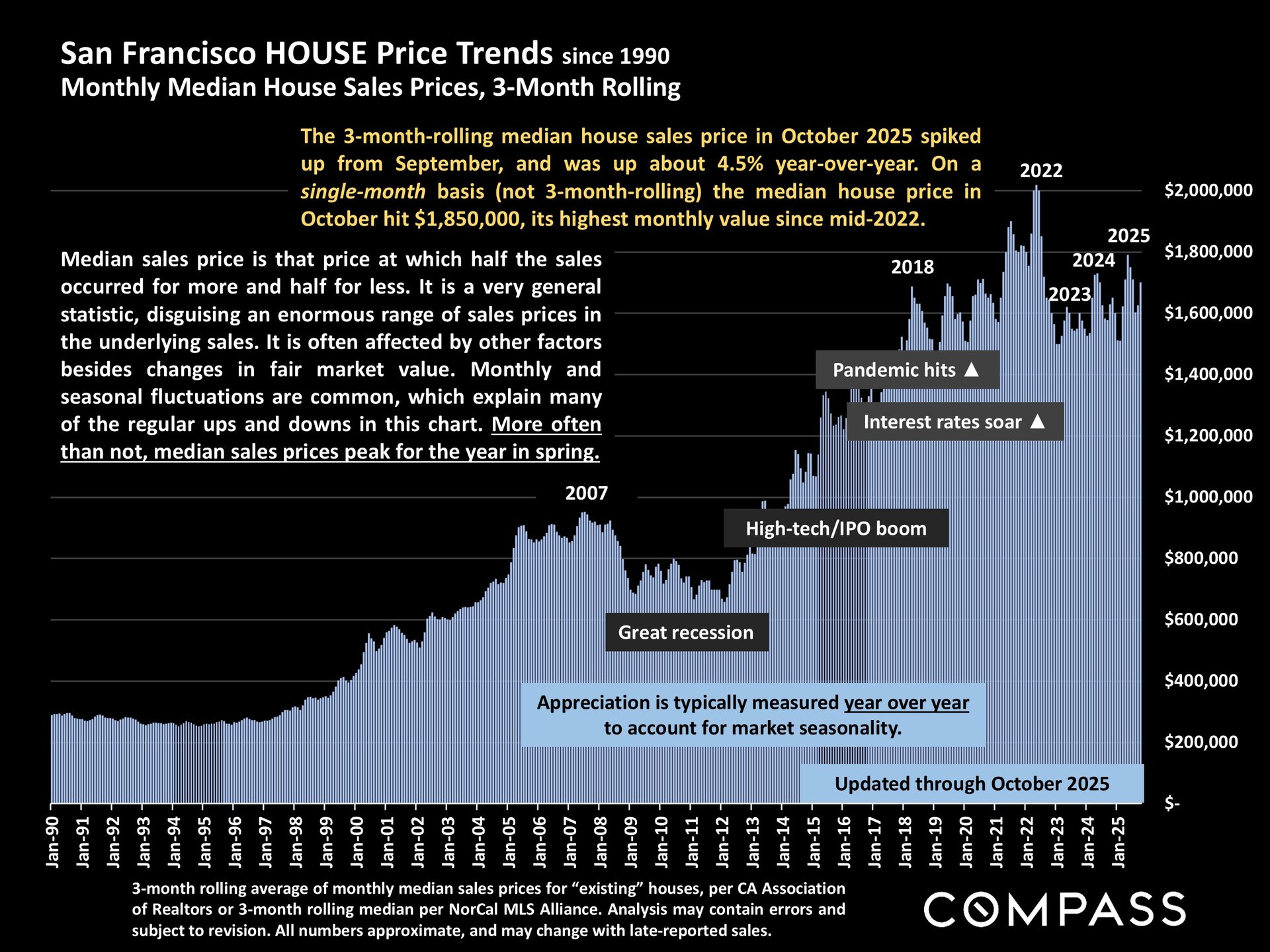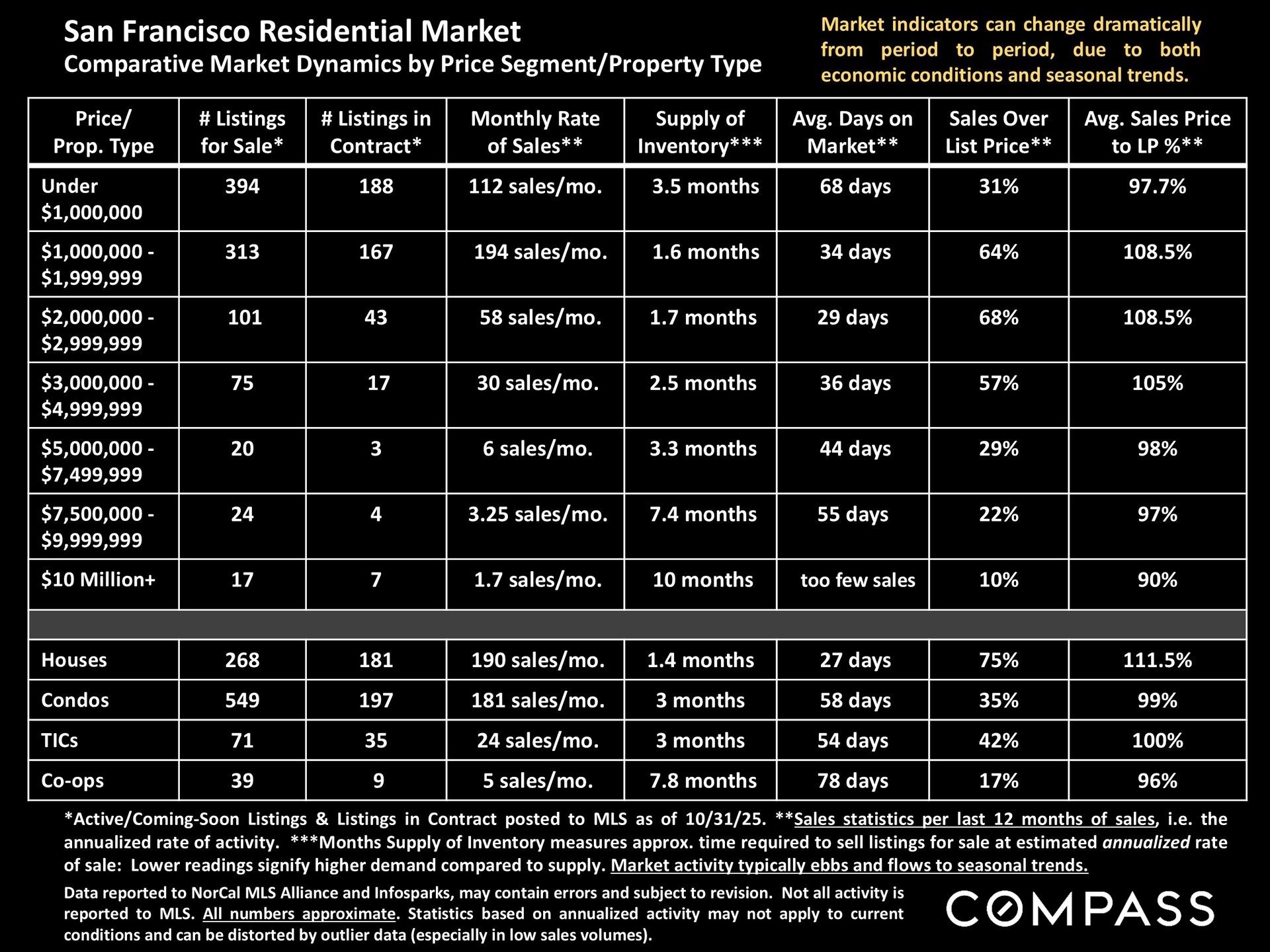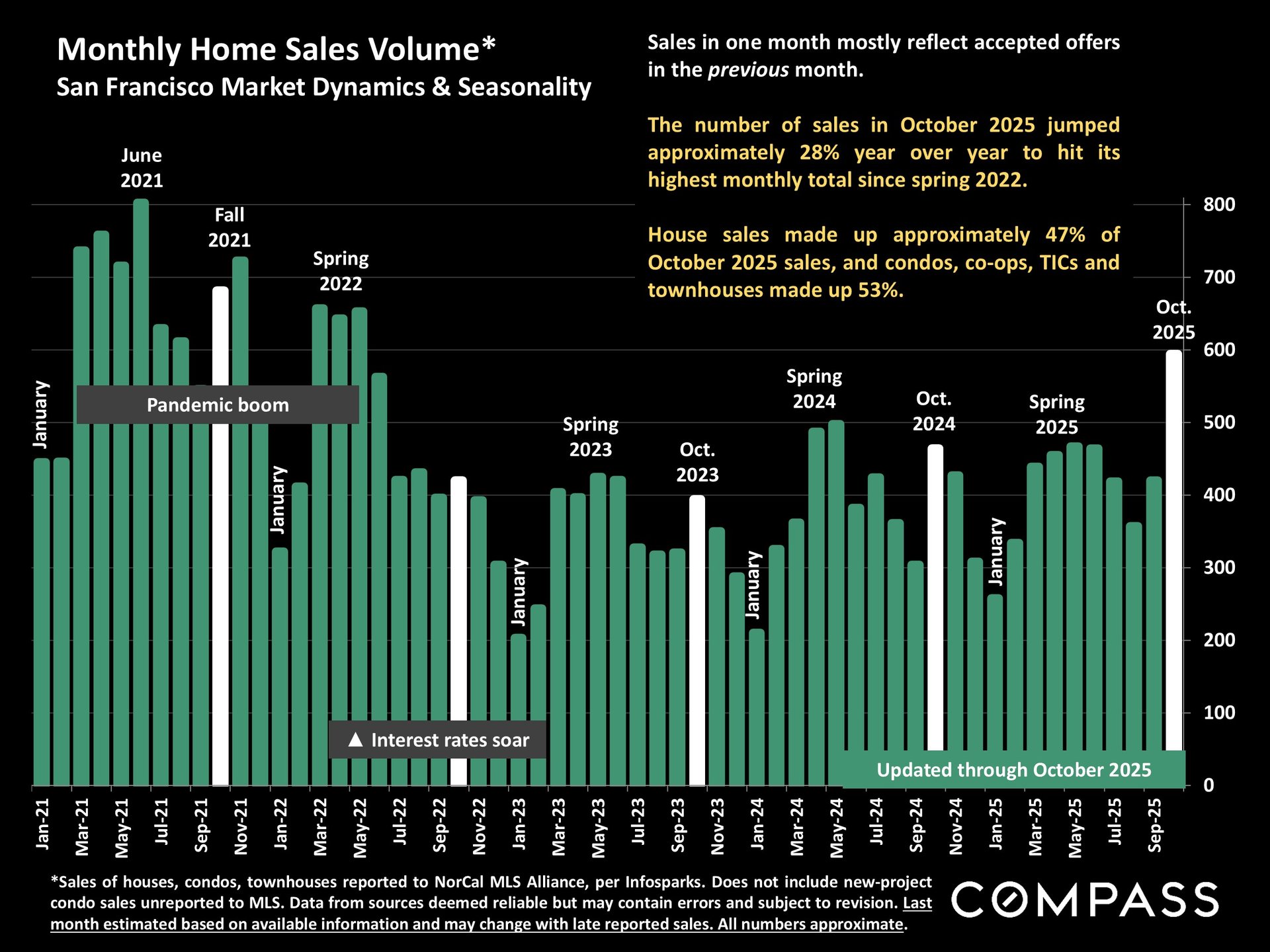 As of the end of October, the S&P 500 and Nasdaq had reached new highs; 30-year mortgage rates hit their lowest point in over a year; inflation ticked up slightly to 3%; and the Fed made its second .25% reduction of its benchmark rate in 2025 (while cautioning that another reduction in December was not certain). General consumer confidence remained low, with significant unease regarding personal finances, job security and inflation – though affluent consumers enjoying substantial stock market gains were less worried. The Economic Policy Uncertainty Index continued to decline from its tariff-shock peak in April but remained high by long-term norms. The San Francisco real estate market continues to rapidly accelerate due to the AI startup boom: October's sales hit the highest count since May 2022, while luxury home sales were the best in 4 years. The number of price reductions plummeted 46% on a year-over-year basis, while the pending ratio – a standard measure of market heat – hit its highest monthly reading since the peak of the pandemic boom. 80% of house sales and 44% of condo sales sold for over list price. Virtually all the market indicators point to a dramatic increase in buyer demand competing for a declining number of listings. The market typically slows from mid-November to mid-January, though it’s possible that this year will buck that trend. In any case, listing and sales activity continue in every month of the year – however, mid-winter is usually the period when buyers can negotiate most aggressively on unsold homes listed earlier in the year.