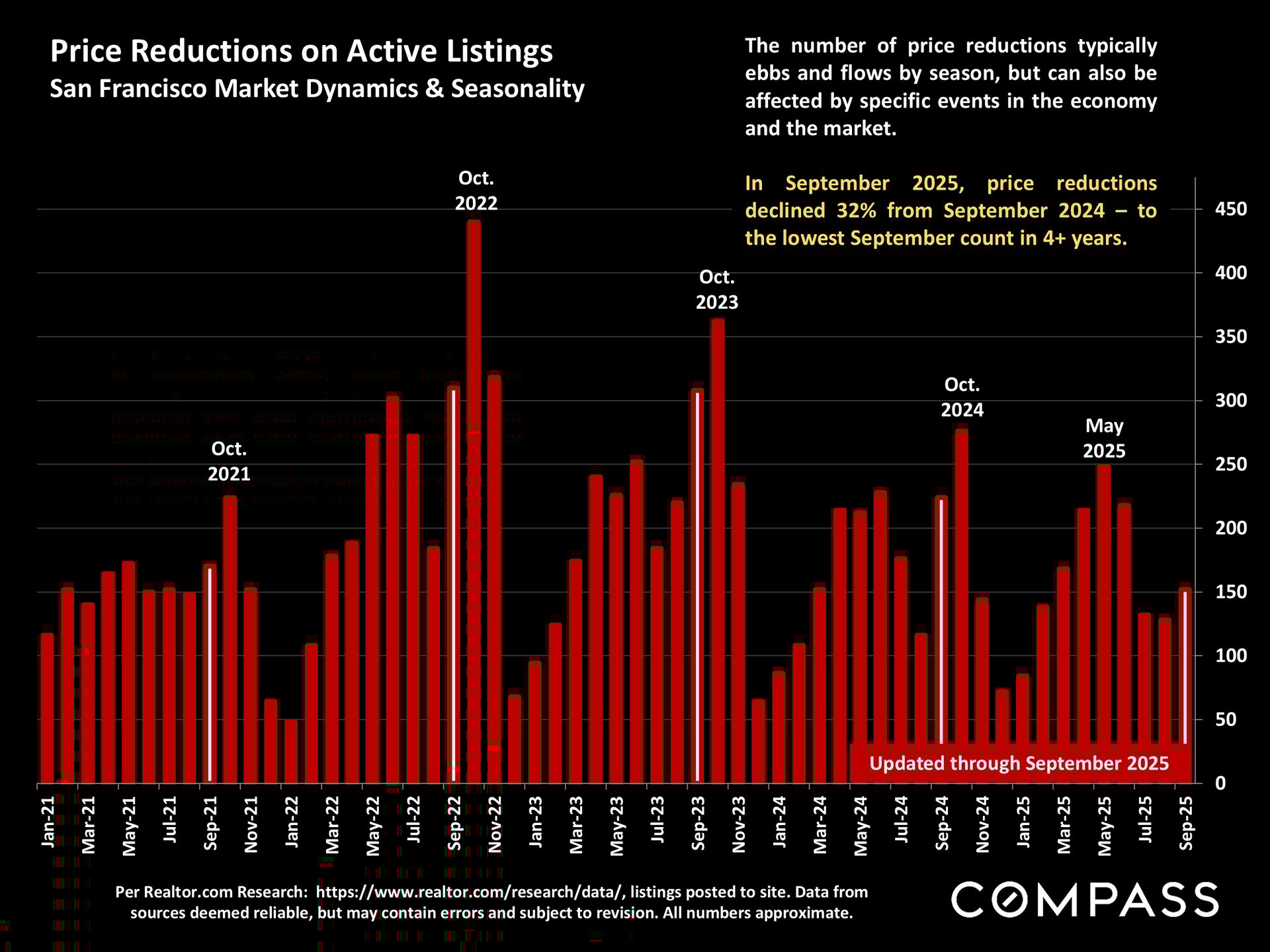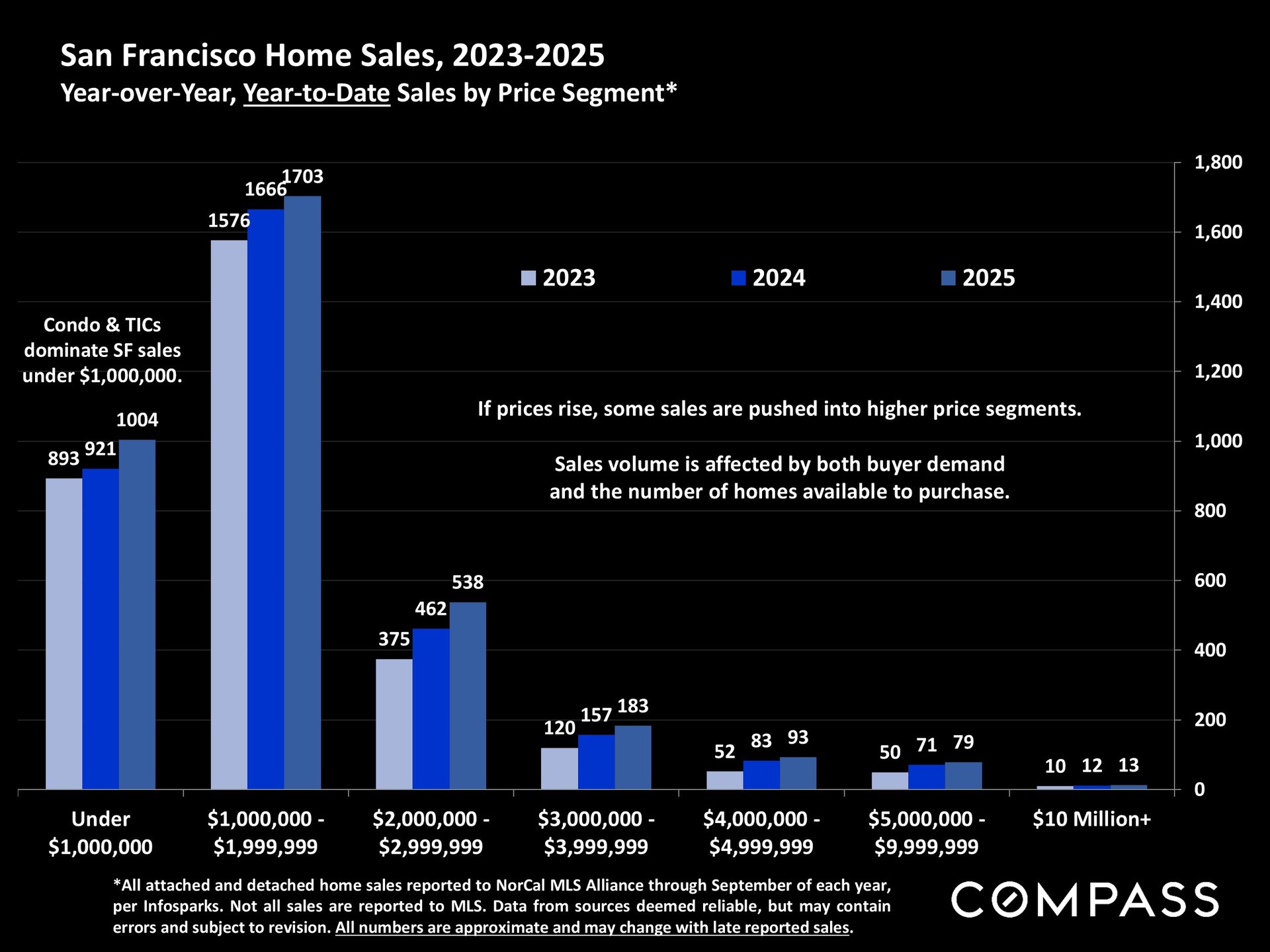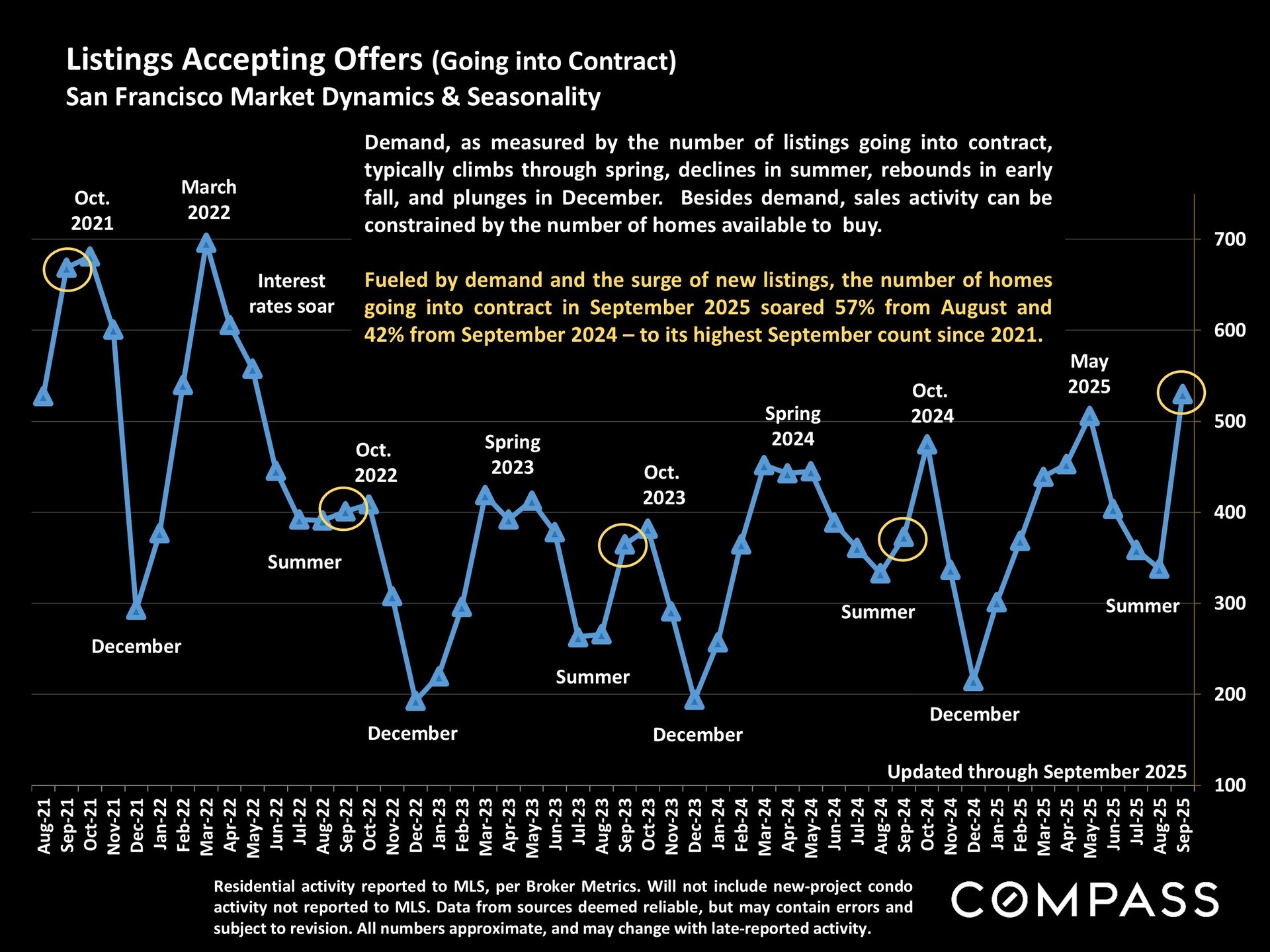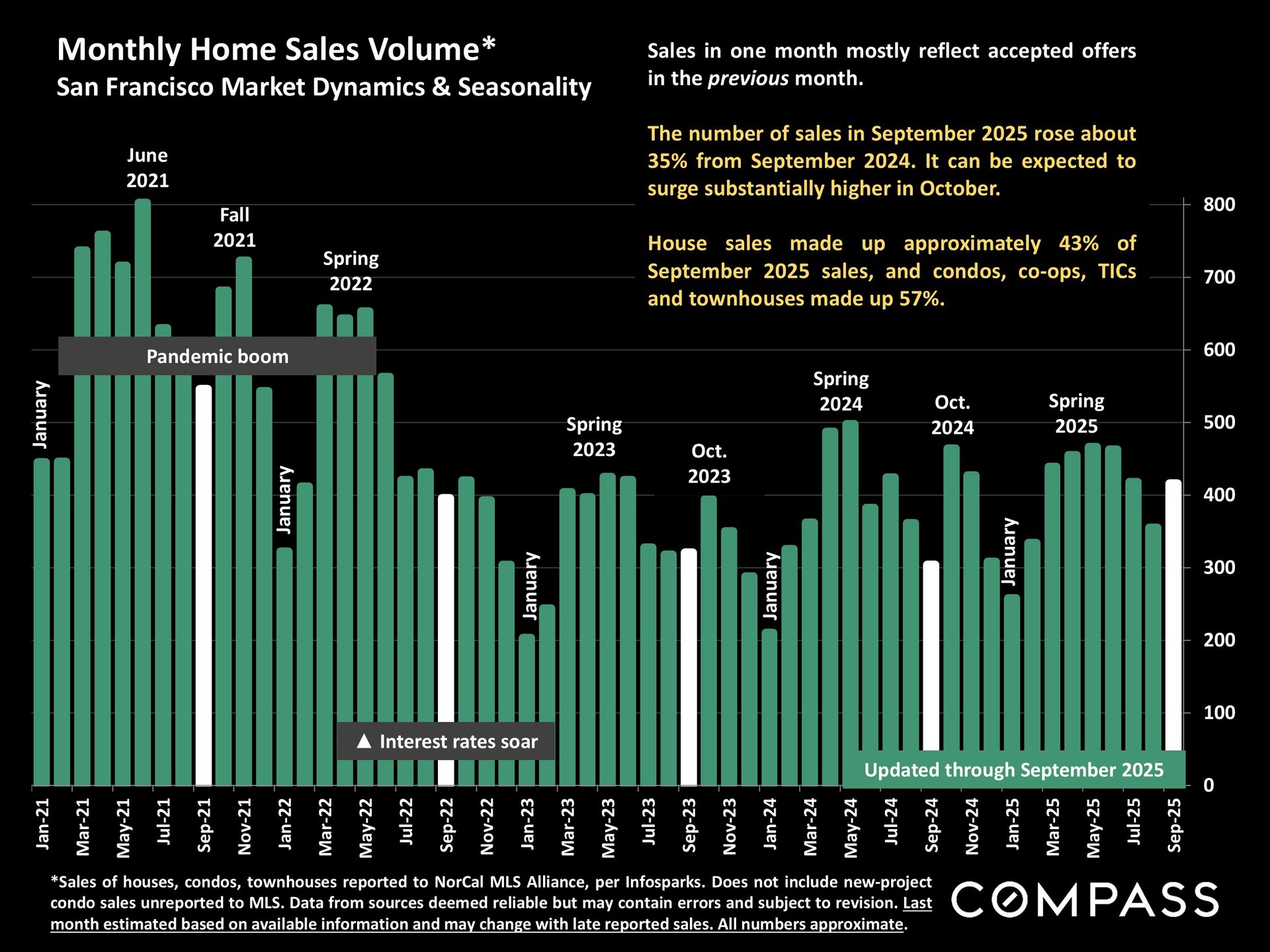 San Francisco has seen an astonishing strengthening of its real estate market in recent months, presumably due to its rapidly accelerating AI start-up boom. Rents are rising at the fastest rate in the country and median sales prices have risen year over year. September sales and luxury home sales, as well the number of listings going into contract, all soared higher than in September 2024. New-listing activity almost doubled from August, but year-over-year, the number of active listings as well as the quantity of price reductions plunged. Increasing demand coupled with declining supply has added enormous pressure to the city’s market. October sales data will give us further insight into the autumn selling season, before activity typically begins to slow down in November for the mid-winter holidays. As of early October, 30-year mortgage rates, at about 6.3%, were essentially unchanged from early September (but well down from 7% in early 2025): The Fed’s first 2025 reduction of its benchmark rate, of .25%, had little effect, though consensus opinion is that further cuts are probably coming before the end of the year. Inflation continued to tick up slightly, while stock markets hit new all-time highs. Nationally, consumer confidence remained low, with significant concerns regarding personal finances, employment and inflation – though affluent consumers deeply invested in stock markets were less concerned than low and middle income segments.