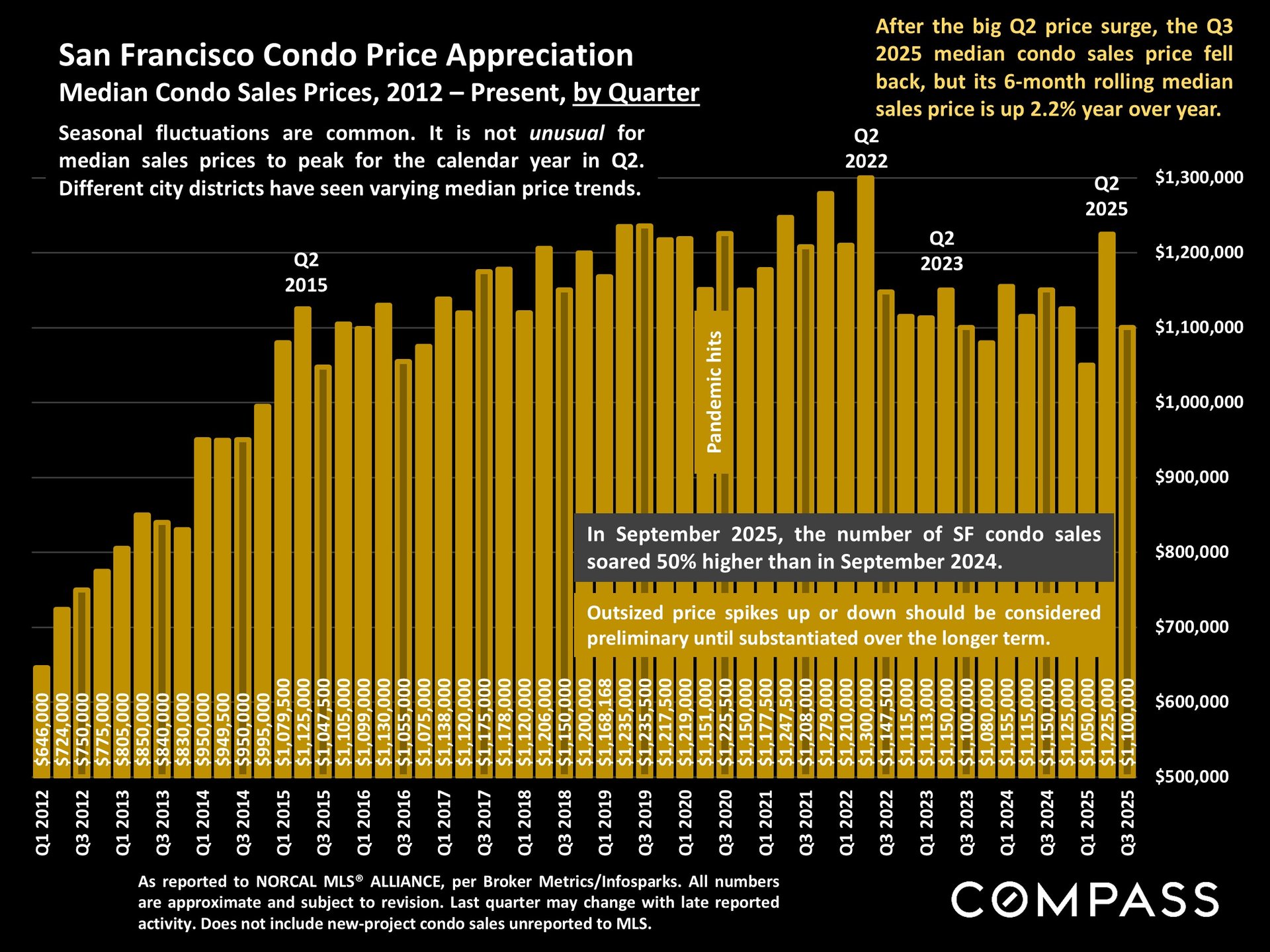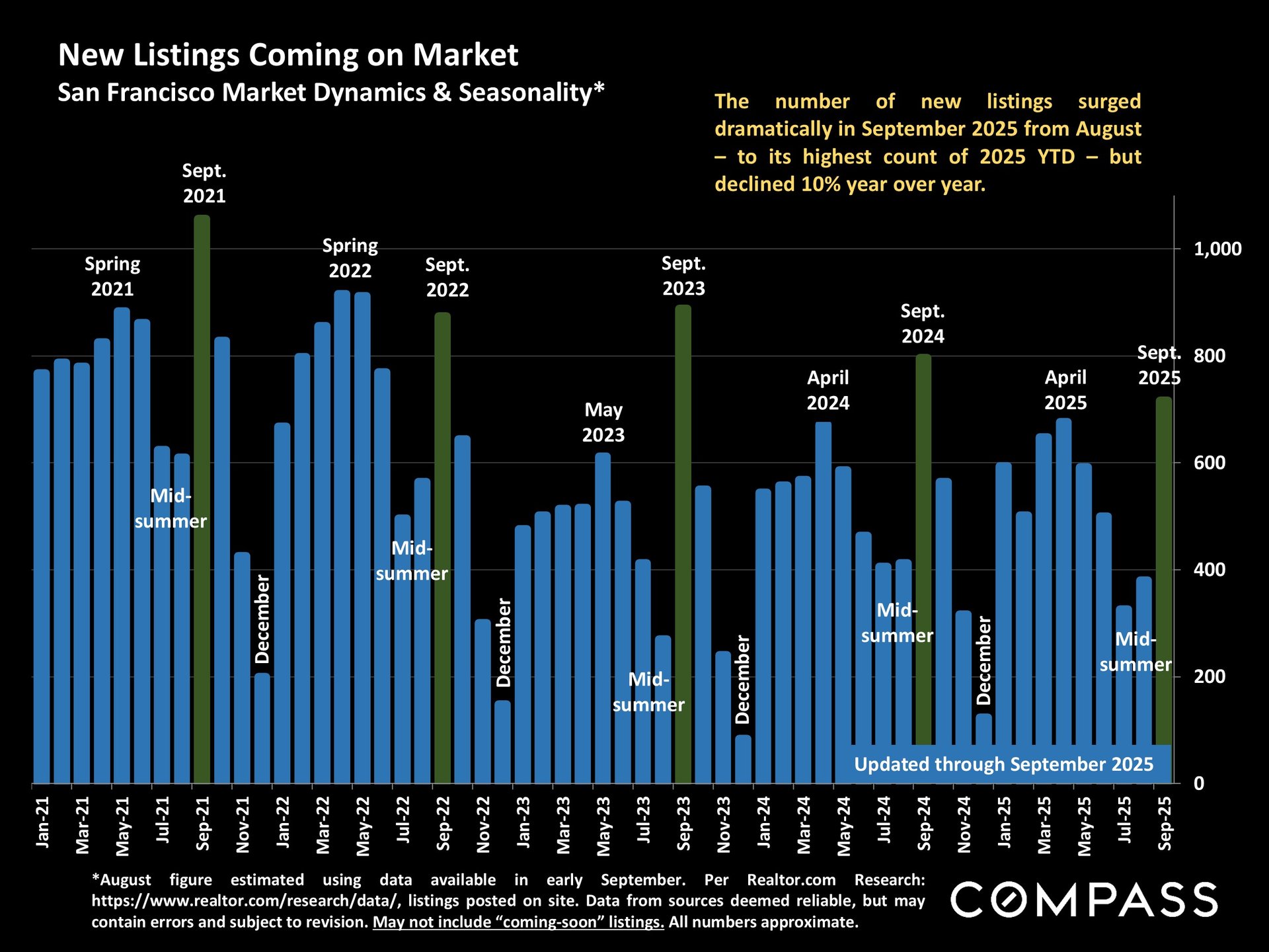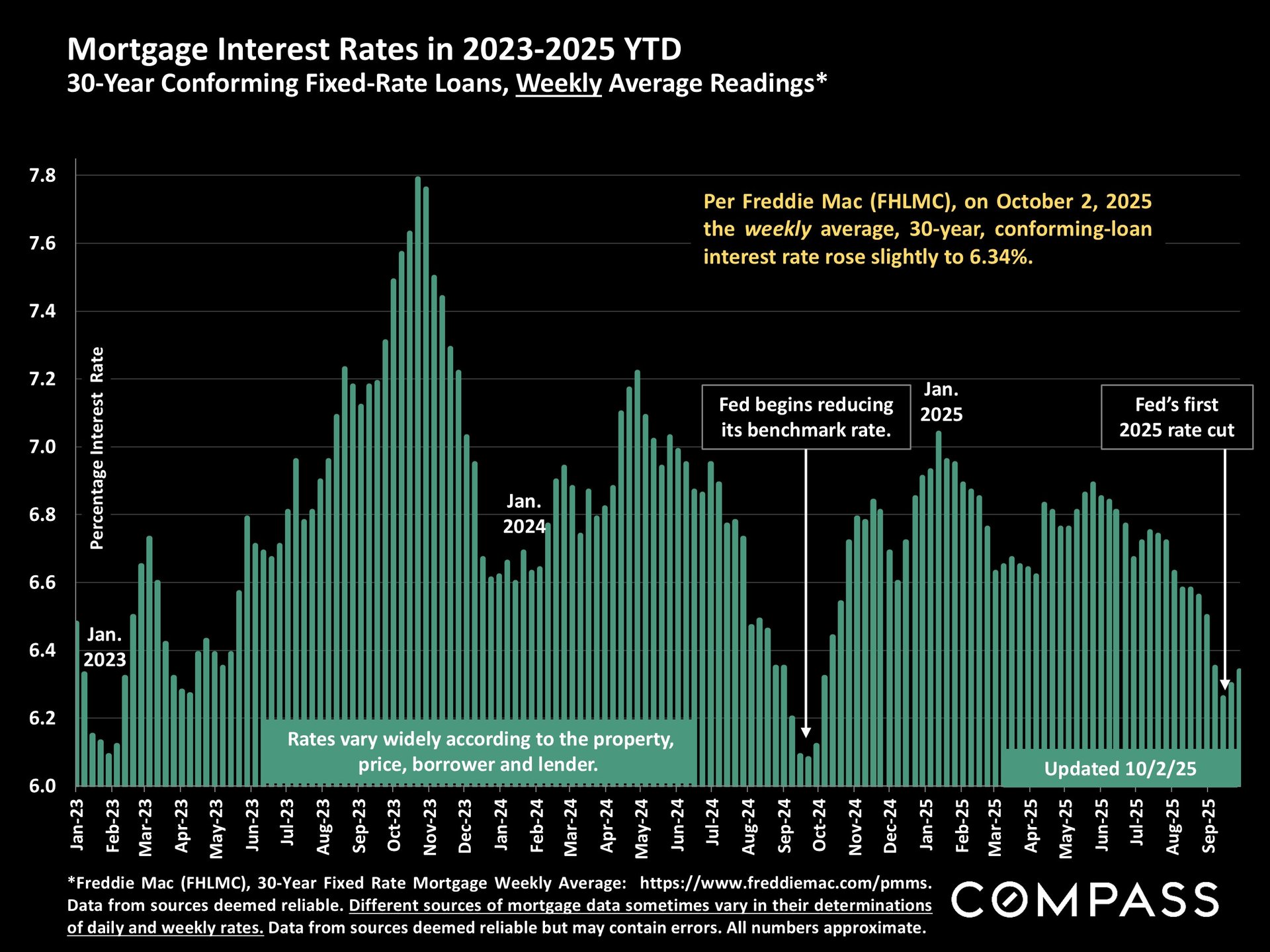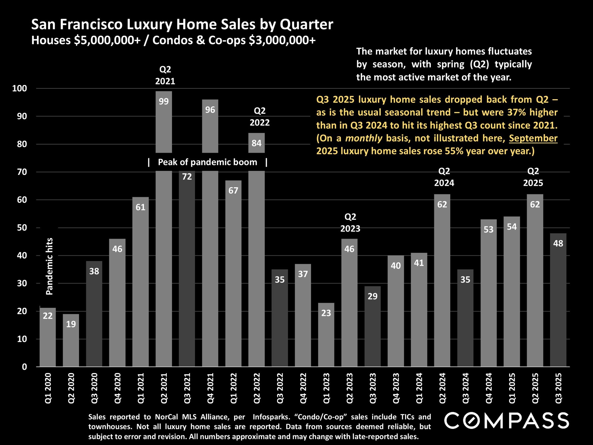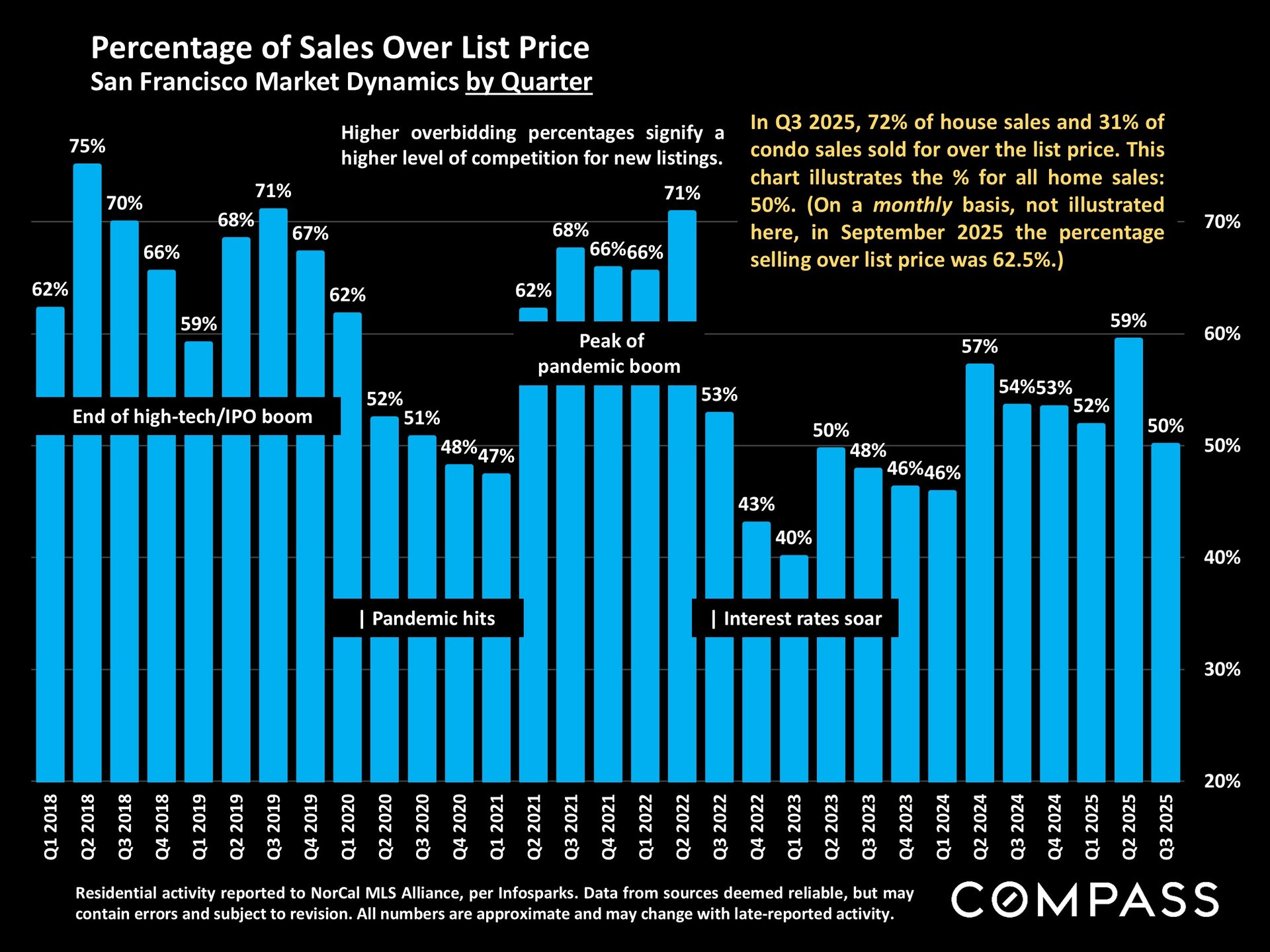 San Francisco has seen an astonishing strengthening of its real estate market in recent months, presumably due to its rapidly accelerating AI start-up boom. Rents are rising at the fastest rate in the country and median sales prices have risen year over year. September sales and luxury home sales, as well the number of listings going into contract, all soared higher than in September 2024. New-listing activity almost doubled from August, but year-over-year, the number of active listings as well as the quantity of price reductions plunged. Increasing demand coupled with declining supply has added enormous pressure to the city’s market. October sales data will give us further insight into the autumn selling season, before activity typically begins to slow down in November for the mid-winter holidays. As of early October, 30-year mortgage rates, at about 6.3%, were essentially unchanged from early September (but well down from 7% in early 2025): The Fed’s first 2025 reduction of its benchmark rate, of .25%, had little effect, though consensus opinion is that further cuts are probably coming before the end of the year. Inflation continued to tick up slightly, while stock markets hit new all-time highs. Nationally, consumer confidence remained low, with significant concerns regarding personal finances, employment and inflation – though affluent consumers deeply invested in stock markets were less concerned than low and middle income segments.
