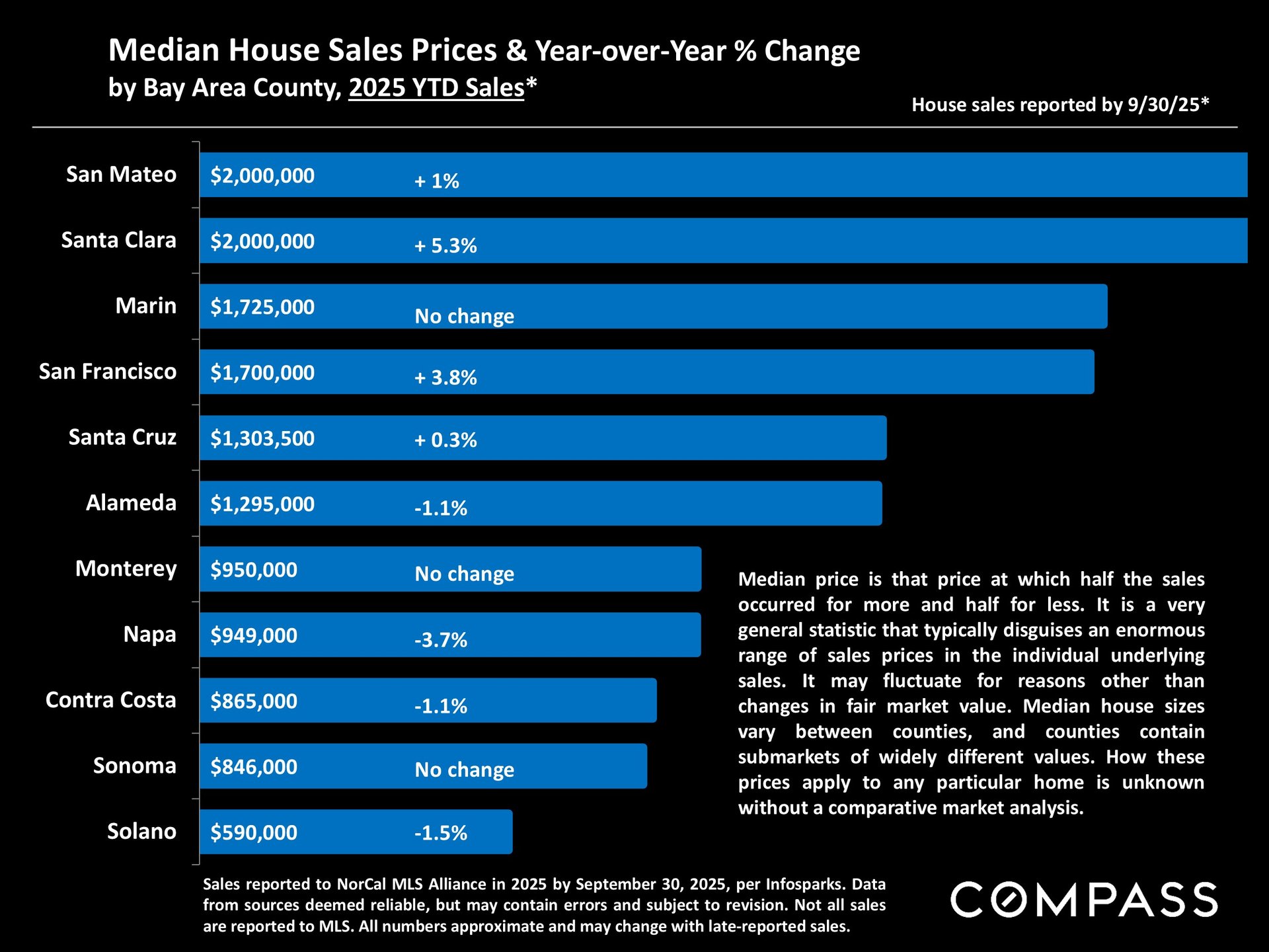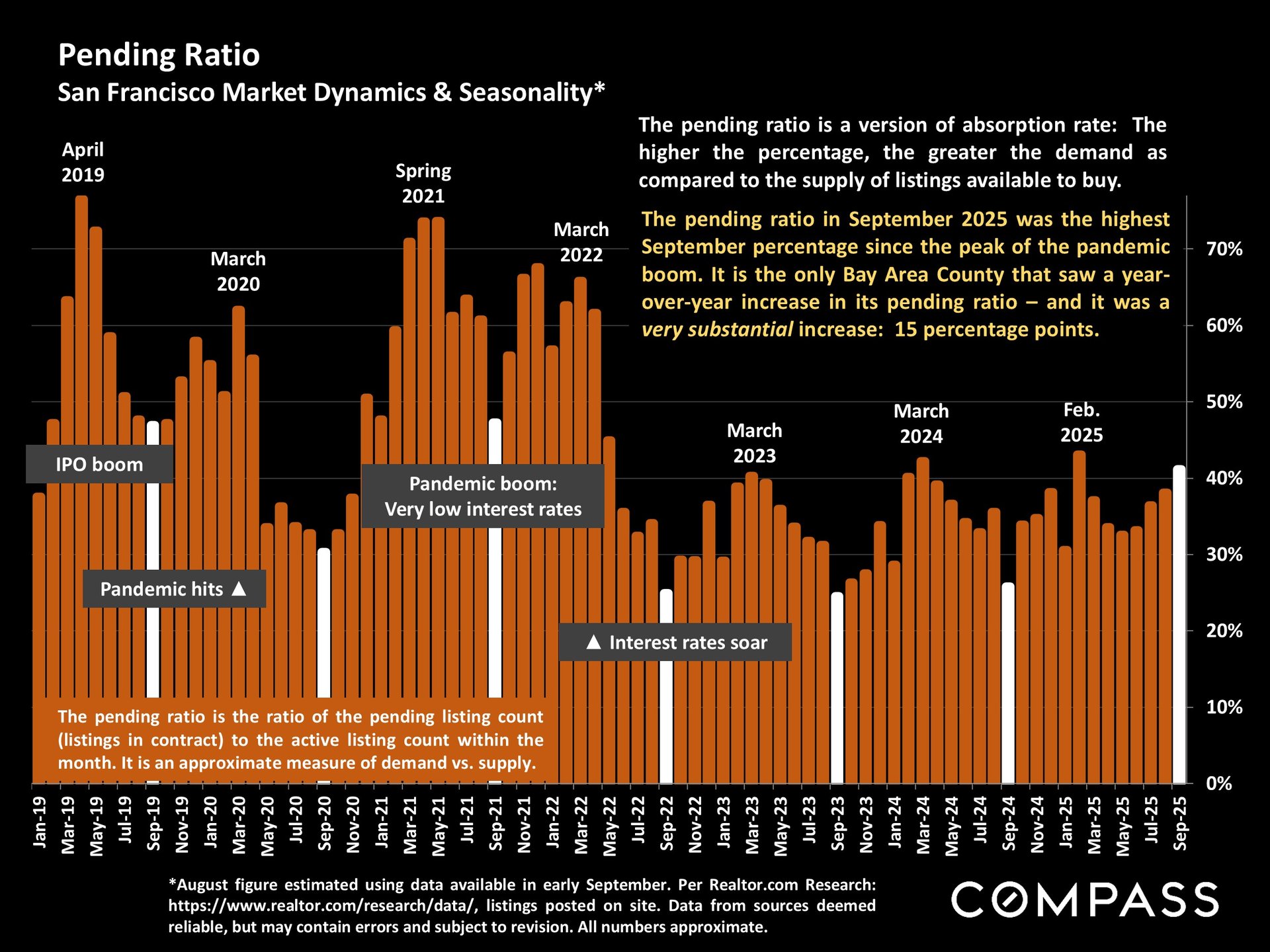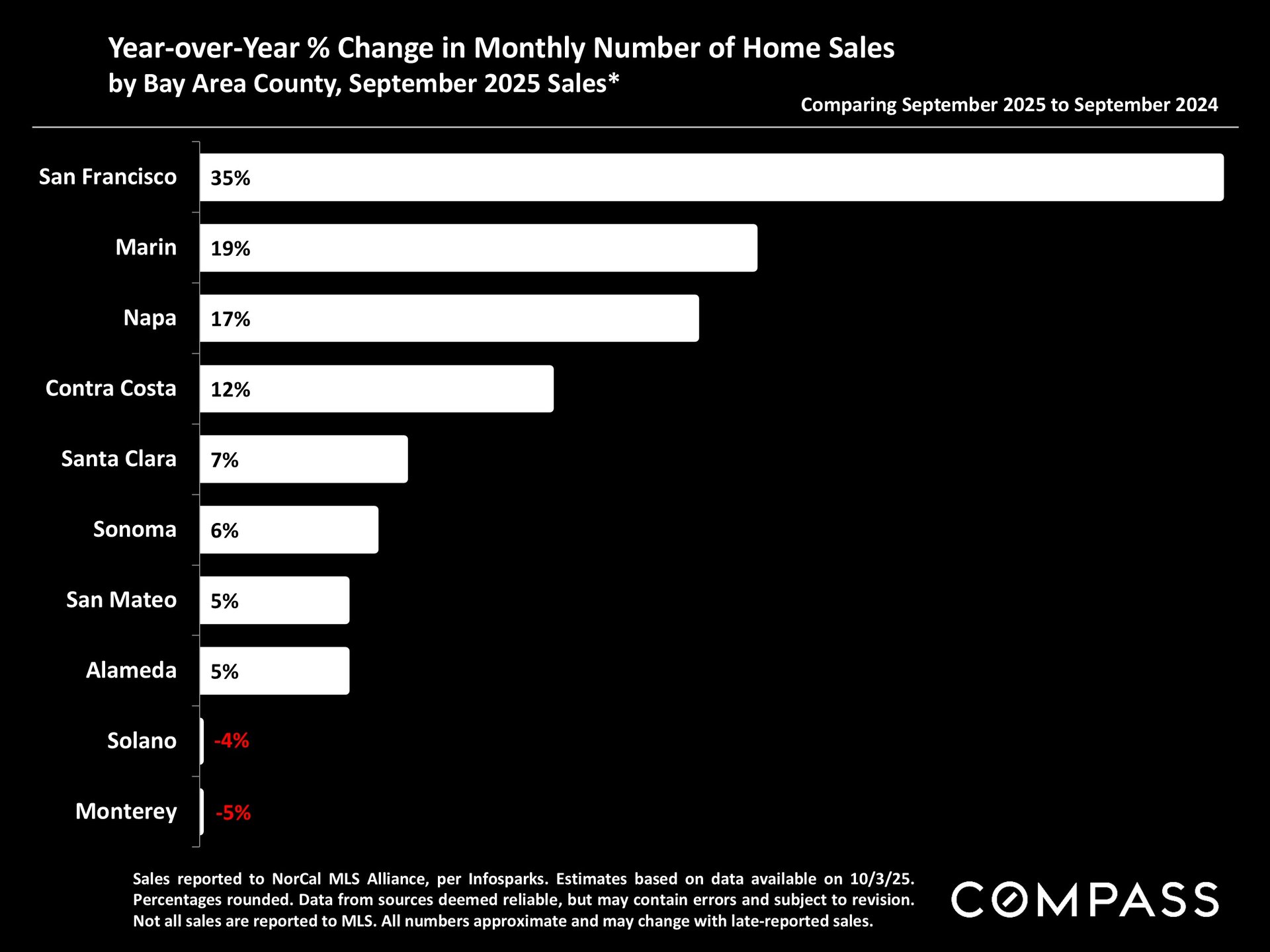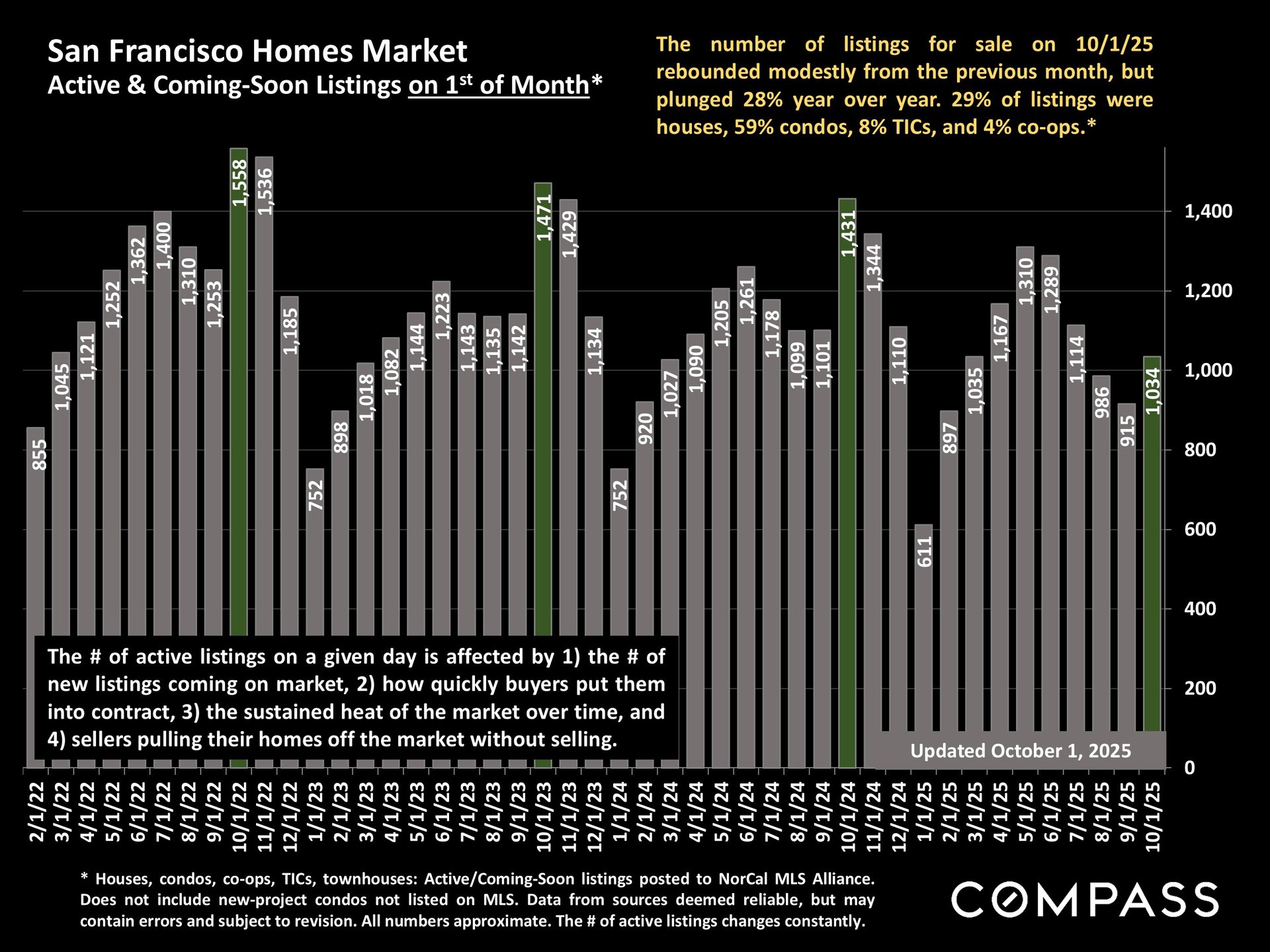San Francisco has seen an astonishing strengthening of its real estate market in recent months, presumably due to its rapidly accelerating AI start-up boom. Rents are rising at the fastest rate in the country and median sales prices have risen year over year. September sales and luxury home sales, as well the number of listings going into contract, all soared higher than in September 2024. New-listing activity almost doubled from August, but year-over-year, the number of active listings as well as the quantity of price reductions plunged. Increasing demand coupled with declining supply has added enormous pressure to the city’s market. October sales data will give us further insight into the autumn selling season, before activity typically begins to slow down in November for the mid-winter holidays. As of early October, 30-year mortgage rates, at about 6.3%, were essentially unchanged from early September (but well down from 7% in early 2025): The Fed’s first 2025 reduction of its benchmark rate, of .25%, had little effect, though consensus opinion is that further cuts are probably coming before the end of the year. Inflation continued to tick up slightly, while stock markets hit new all-time highs. Nationally, consumer confidence remained low, with significant concerns regarding personal finances, employment and inflation – though affluent consumers deeply invested in stock markets were less concerned than low and middle income segments.