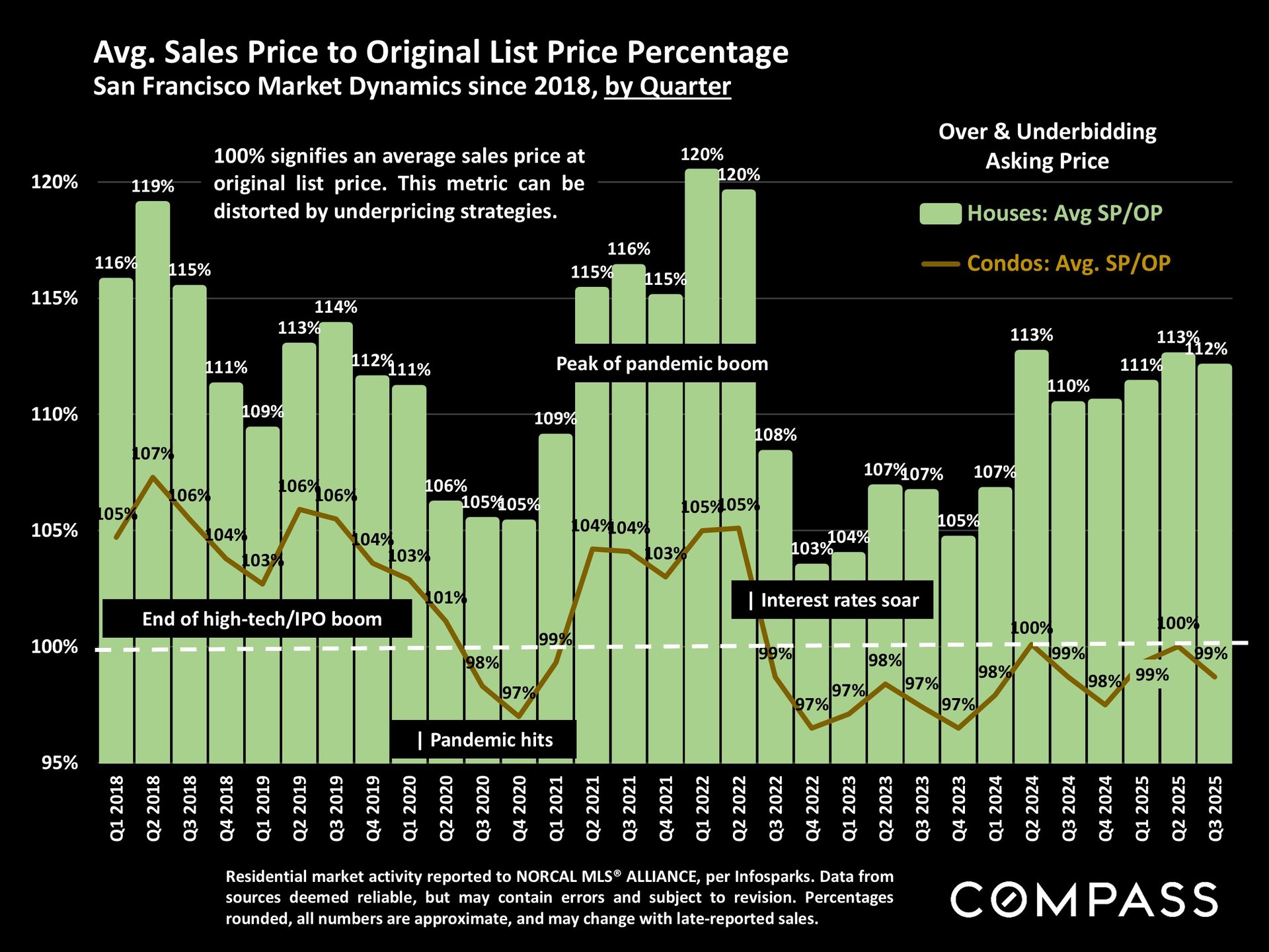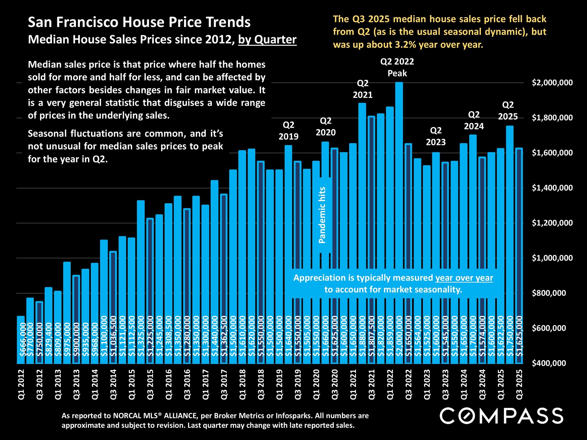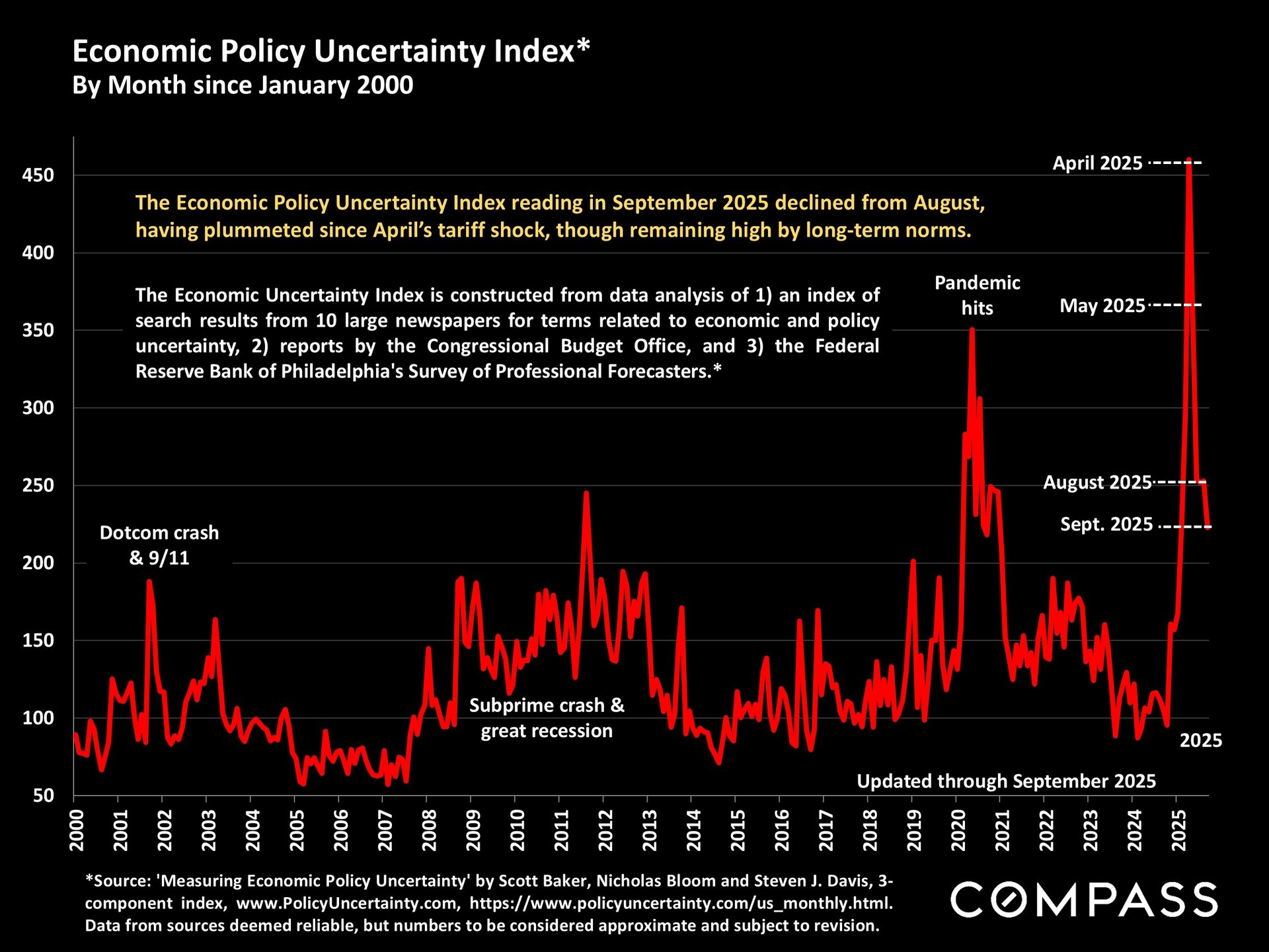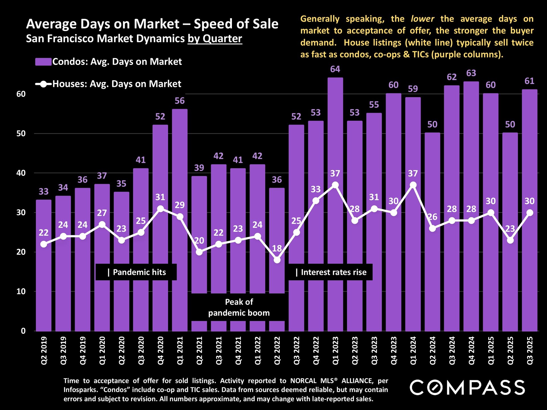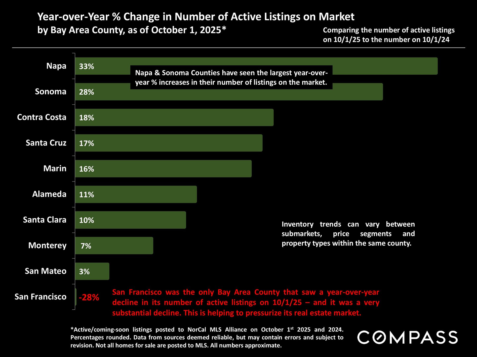 San Francisco has seen an astonishing strengthening of its real estate market in recent months, presumably due to its rapidly accelerating AI start-up boom. Rents are rising at the fastest rate in the country and median sales prices have risen year over year. September sales and luxury home sales, as well the number of listings going into contract, all soared higher than in September 2024. New-listing activity almost doubled from August, but year-over-year, the number of active listings as well as the quantity of price reductions plunged. Increasing demand coupled with declining supply has added enormous pressure to the city’s market. October sales data will give us further insight into the autumn selling season, before activity typically begins to slow down in November for the mid-winter holidays. As of early October, 30-year mortgage rates, at about 6.3%, were essentially unchanged from early September (but well down from 7% in early 2025): The Fed’s first 2025 reduction of its benchmark rate, of .25%, had little effect, though consensus opinion is that further cuts are probably coming before the end of the year. Inflation continued to tick up slightly, while stock markets hit new all-time highs. Nationally, consumer confidence remained low, with significant concerns regarding personal finances, employment and inflation – though affluent consumers deeply invested in stock markets were less concerned than low and middle income segments.