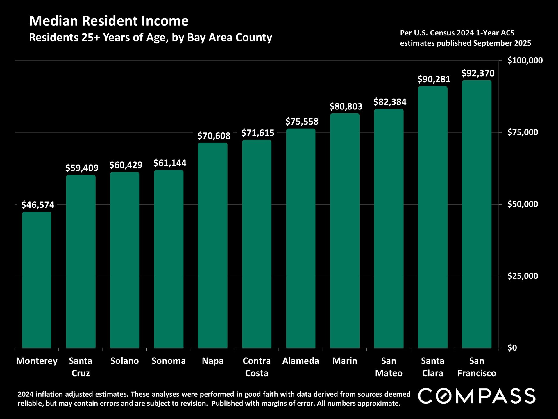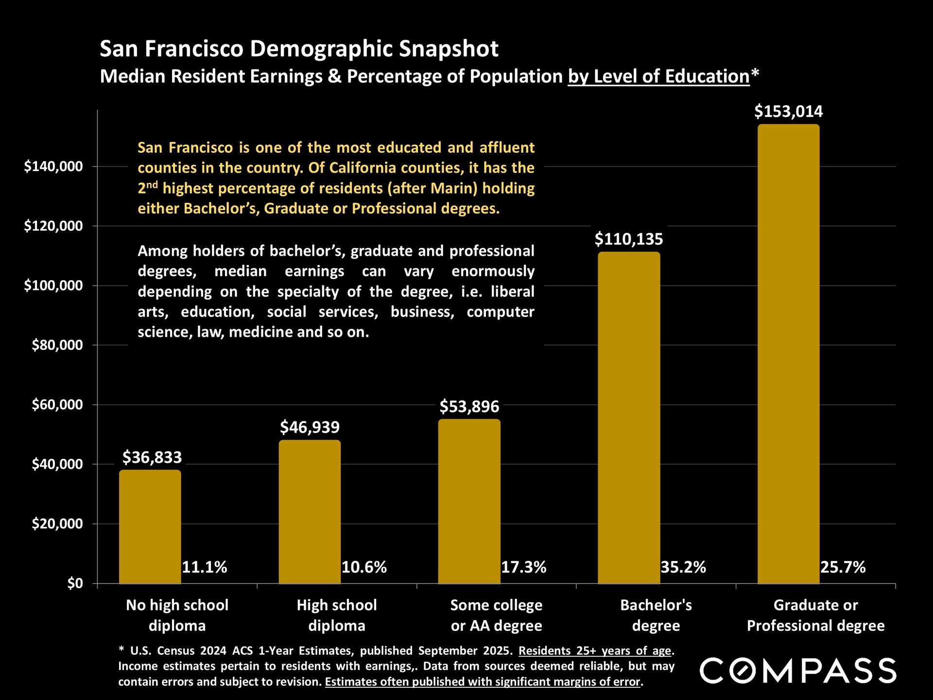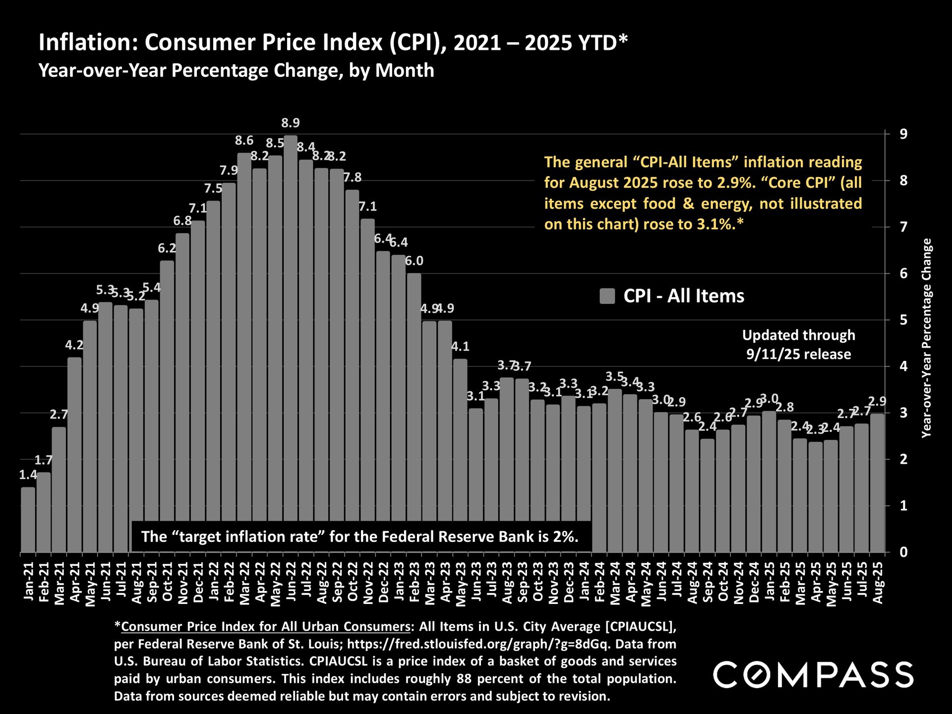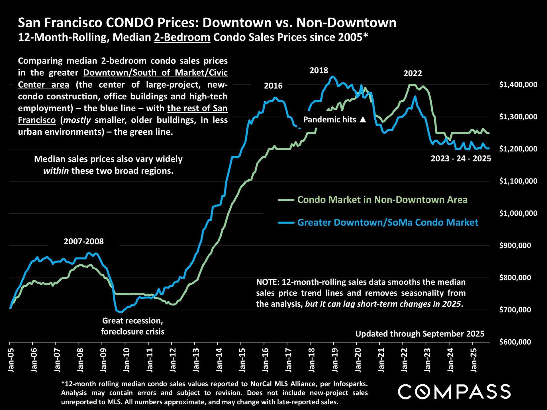 San Francisco has seen an astonishing strengthening of its real estate market in recent months, presumably due to its rapidly accelerating AI start-up boom. Rents are rising at the fastest rate in the country and median sales prices have risen year over year. September sales and luxury home sales, as well the number of listings going into contract, all soared higher than in September 2024. New-listing activity almost doubled from August, but year-over-year, the number of active listings as well as the quantity of price reductions plunged. Increasing demand coupled with declining supply has added enormous pressure to the city’s market. October sales data will give us further insight into the autumn selling season, before activity typically begins to slow down in November for the mid-winter holidays. As of early October, 30-year mortgage rates, at about 6.3%, were essentially unchanged from early September (but well down from 7% in early 2025): The Fed’s first 2025 reduction of its benchmark rate, of .25%, had little effect, though consensus opinion is that further cuts are probably coming before the end of the year. Inflation continued to tick up slightly, while stock markets hit new all-time highs. Nationally, consumer confidence remained low, with significant concerns regarding personal finances, employment and inflation – though affluent consumers deeply invested in stock markets were less concerned than low and middle income segments.