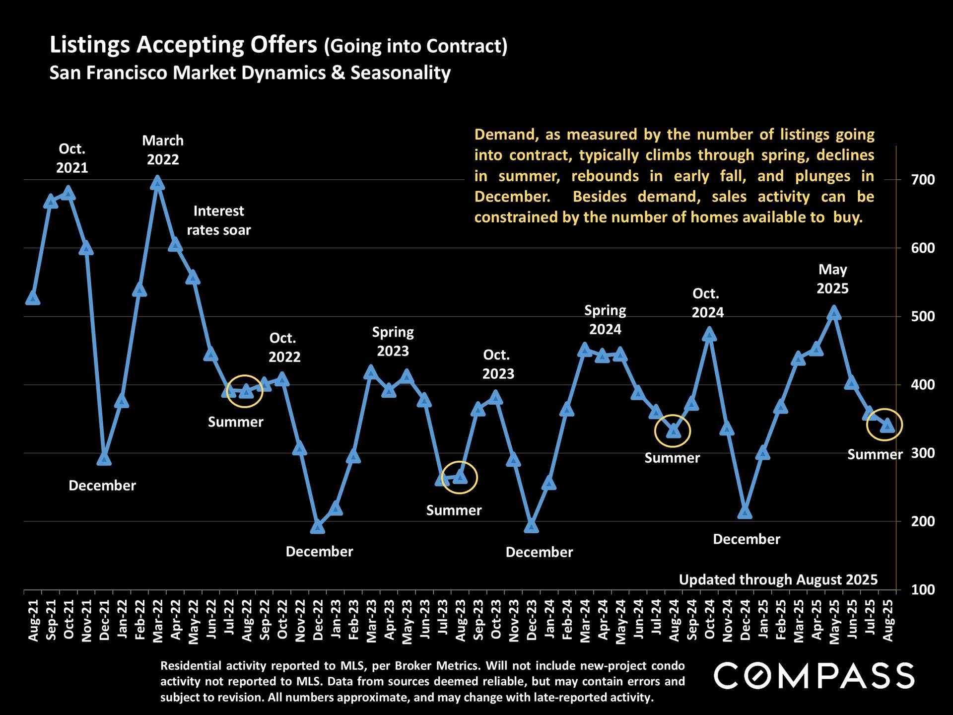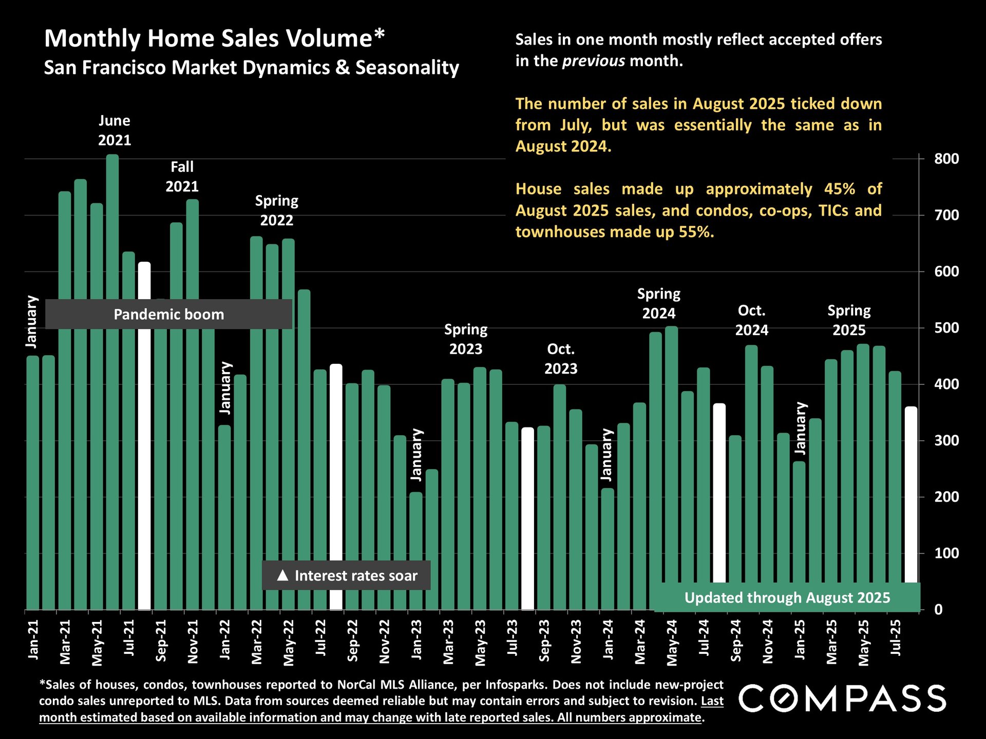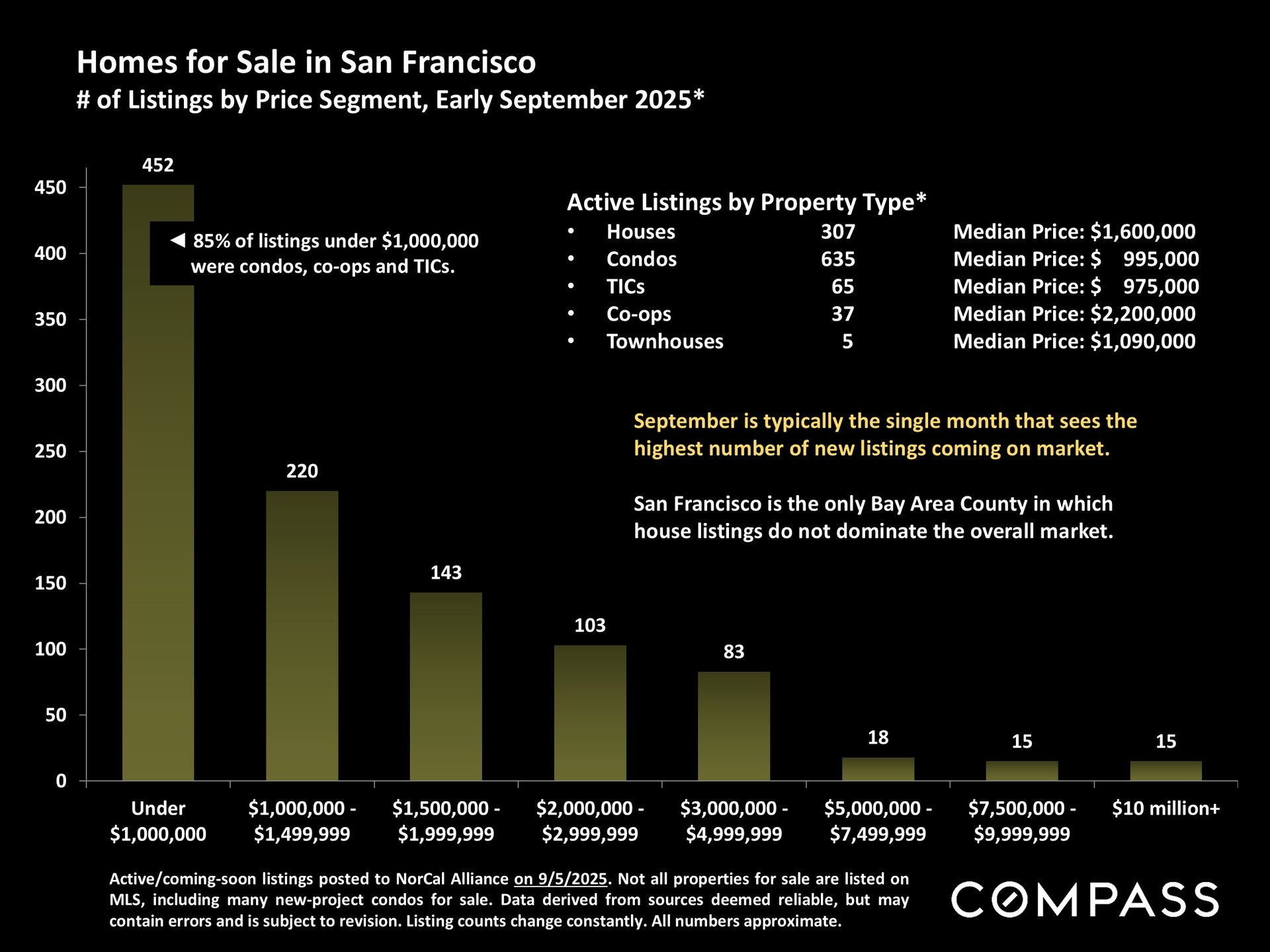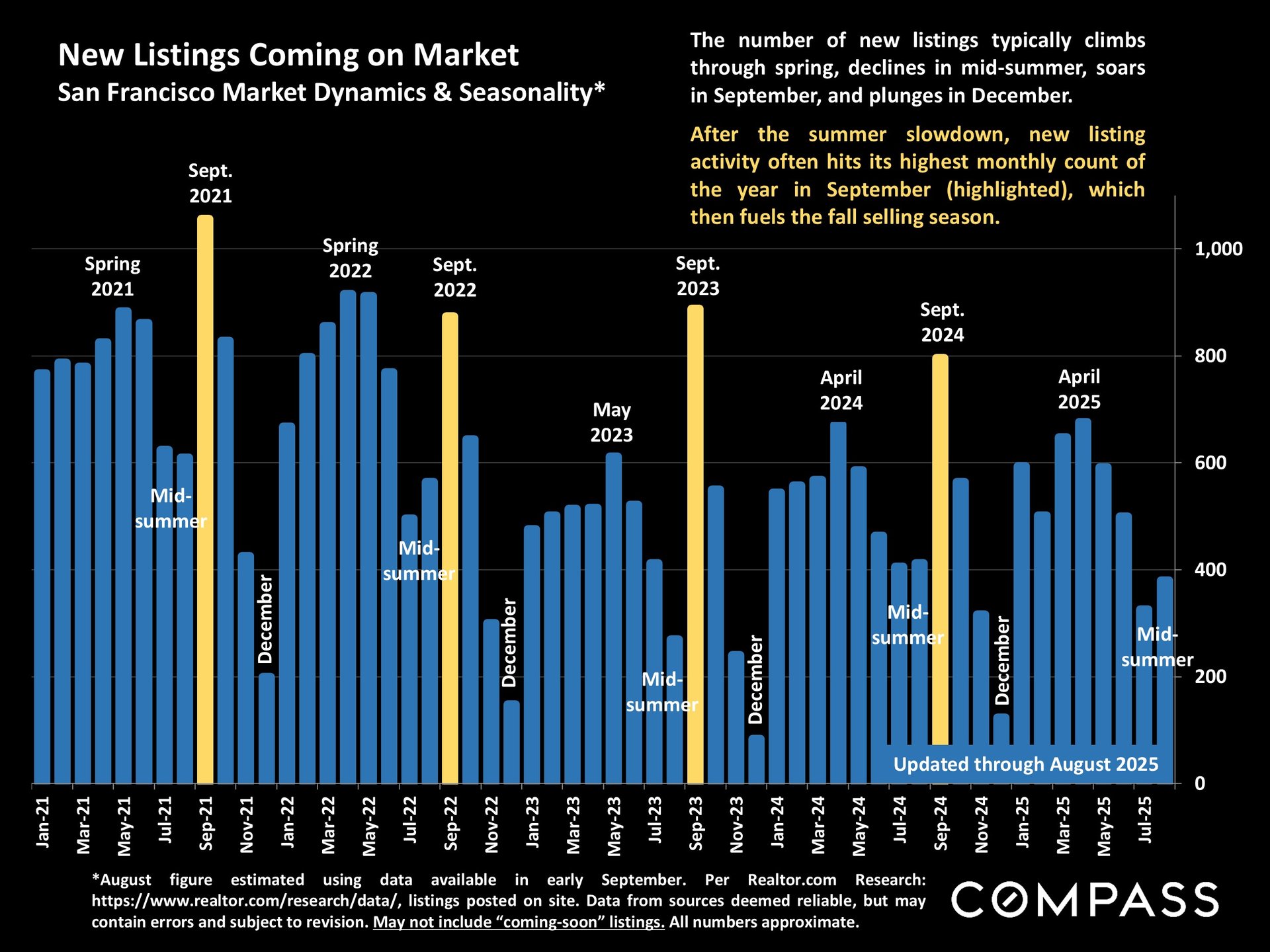 Generally speaking, this summer’s market saw no large shifts in market dynamics beyond typical seasonal changes, and due to the AI boom, San Francisco remains one of the strongest markets in the Bay Area. The focus now is on the fall selling season, which runs from early September to early November before listing and sales activity begins to plunge for the mid- winter holidays. Early fall almost always begins with a huge surge in new listings, which then provides a substantial boost to sales activity, especially in higher-price segments. Probably the biggest wild card right now is what is going to happen to interest rates, but economic indicators present a surprisingly wide range of mixed messages. As of the first week of September, mortgage rates, at slightly below 6.3%, are suddenly getting close to the 6% range many analysts believe is required to significantly boost buyer demand. But interest rates have been extremely volatile in recent years, with big, sudden changes in direction common – as occurred last year in late summer/early autumn. The AI boom continues to gain traction in San Francisco, and stock markets have hit new all-time highs in the past month, a big positive for affluent real estate markets like SF. The last inflation reading was unchanged at 2.7%, but the more recent Producer Price Index saw its largest monthly increase in over 3 years. Consumer confidence readings remain low; measures of economic uncertainty and political volatility – both national and international – remain high; and the latest jobs report was generally considered relatively dismal. Consensus opinion is predicting the Fed will drop its benchmark rate this month – for the first time in 2025 – but much depends on inflation reports due in coming weeks. Besides the usual review of standard measurements of supply and demand, this report also contains detailed information regarding San Francisco’s neighborhood markets.