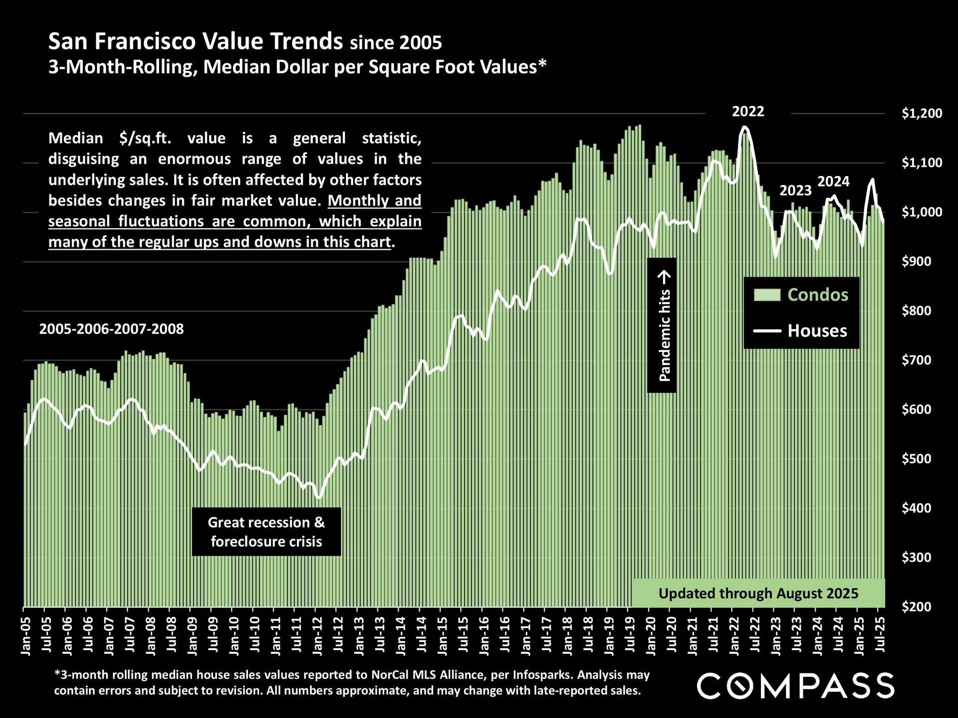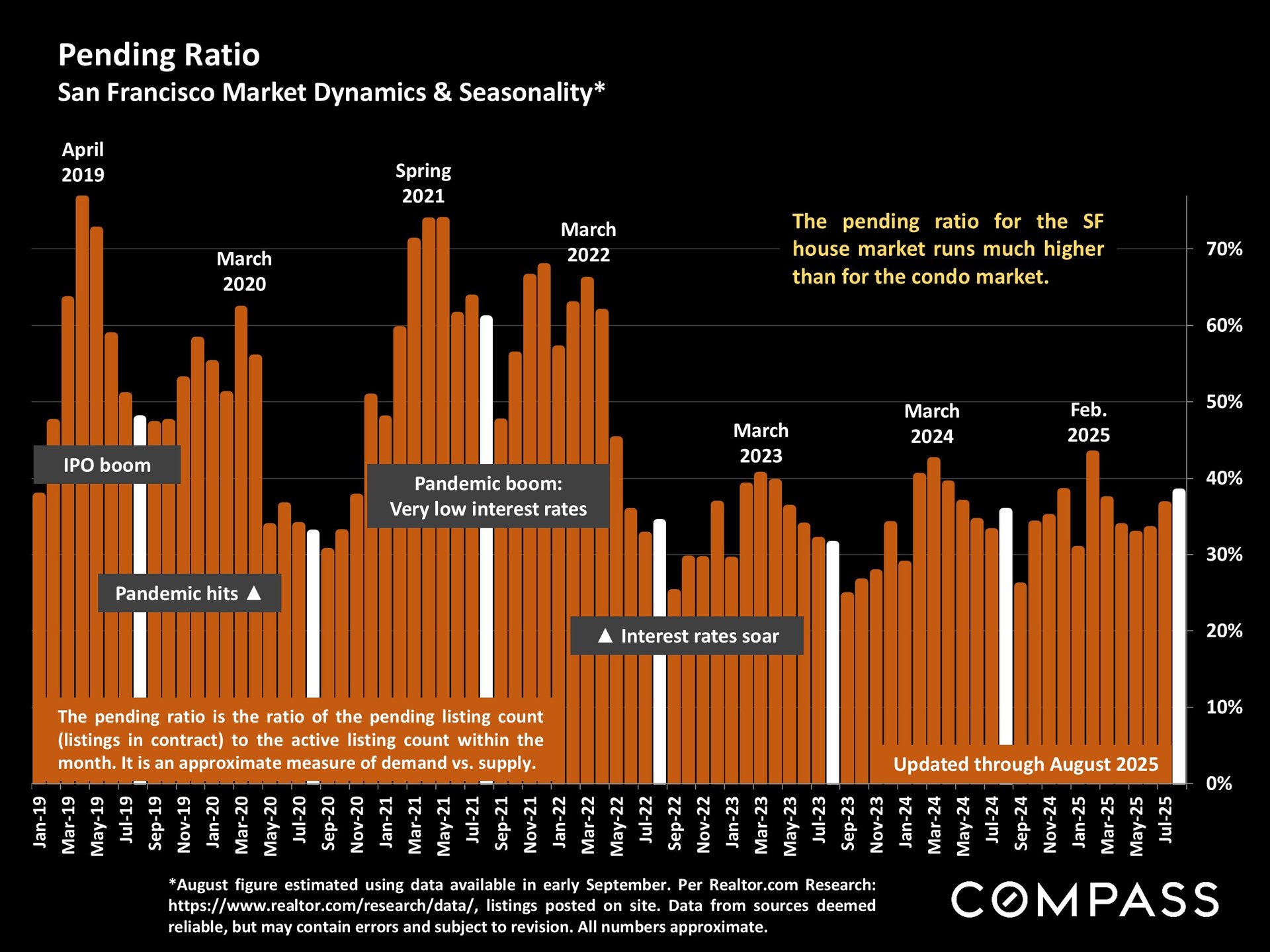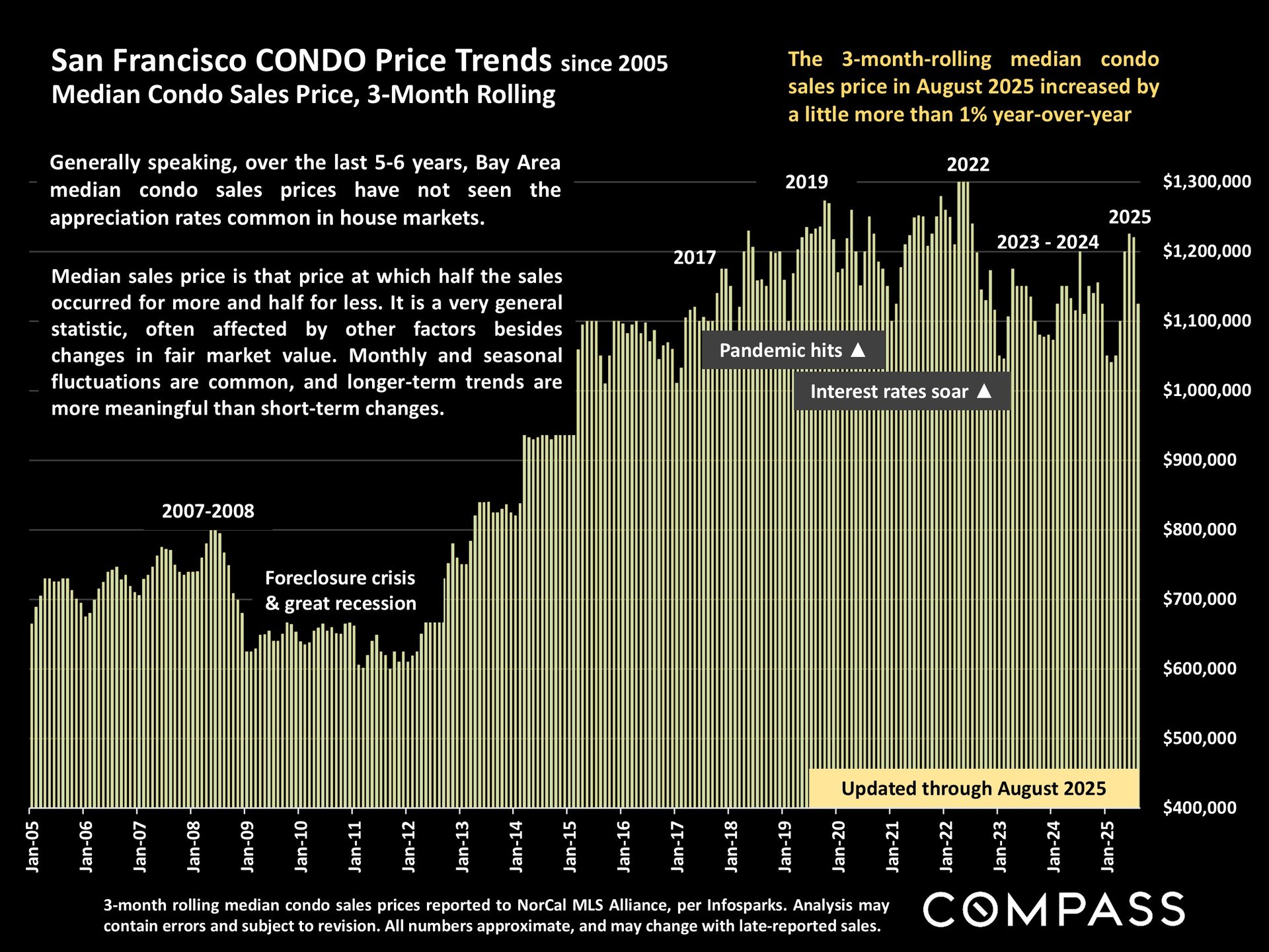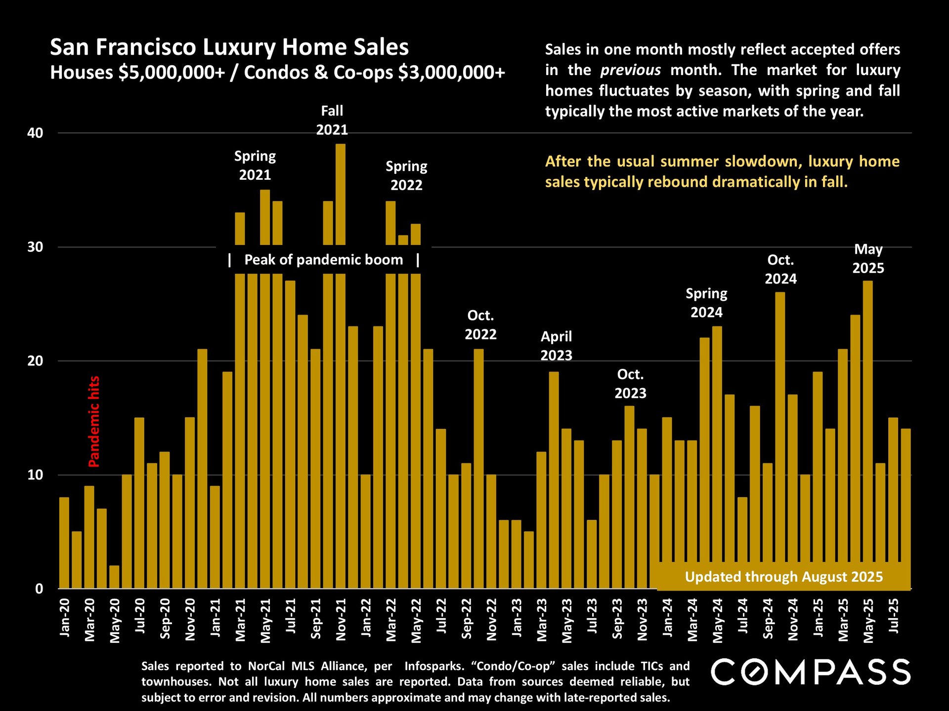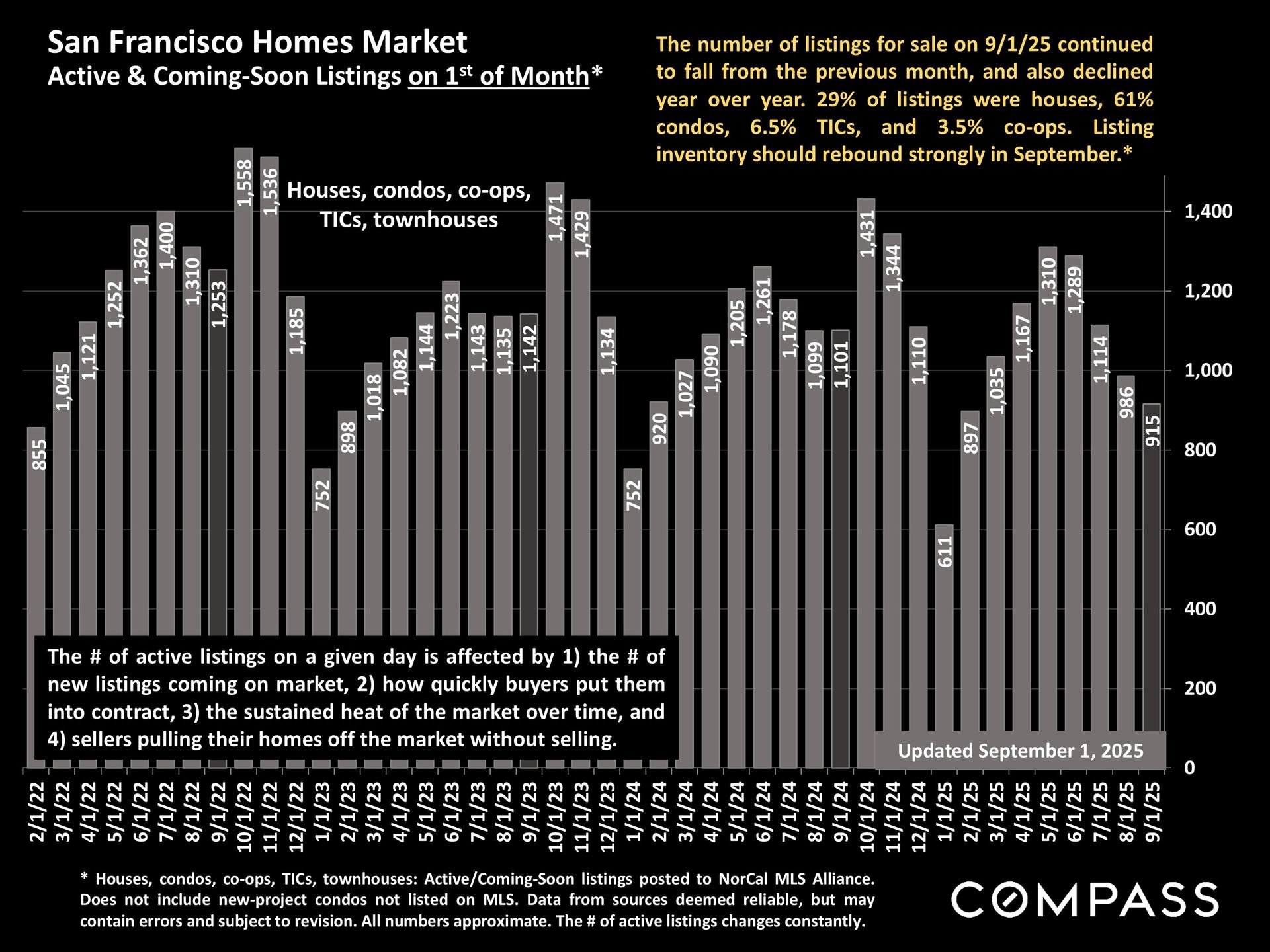 Generally speaking, this summer’s market saw no large shifts in market dynamics beyond typical seasonal changes, and due to the AI boom, San Francisco remains one of the strongest markets in the Bay Area. The focus now is on the fall selling season, which runs from early September to early November before listing and sales activity begins to plunge for the mid- winter holidays. Early fall almost always begins with a huge surge in new listings, which then provides a substantial boost to sales activity, especially in higher-price segments. Probably the biggest wild card right now is what is going to happen to interest rates, but economic indicators present a surprisingly wide range of mixed messages. As of the first week of September, mortgage rates, at slightly below 6.3%, are suddenly getting close to the 6% range many analysts believe is required to significantly boost buyer demand. But interest rates have been extremely volatile in recent years, with big, sudden changes in direction common – as occurred last year in late summer/early autumn. The AI boom continues to gain traction in San Francisco, and stock markets have hit new all-time highs in the past month, a big positive for affluent real estate markets like SF. The last inflation reading was unchanged at 2.7%, but the more recent Producer Price Index saw its largest monthly increase in over 3 years. Consumer confidence readings remain low; measures of economic uncertainty and political volatility – both national and international – remain high; and the latest jobs report was generally considered relatively dismal. Consensus opinion is predicting the Fed will drop its benchmark rate this month – for the first time in 2025 – but much depends on inflation reports due in coming weeks. Besides the usual review of standard measurements of supply and demand, this report also contains detailed information regarding San Francisco’s neighborhood markets.
