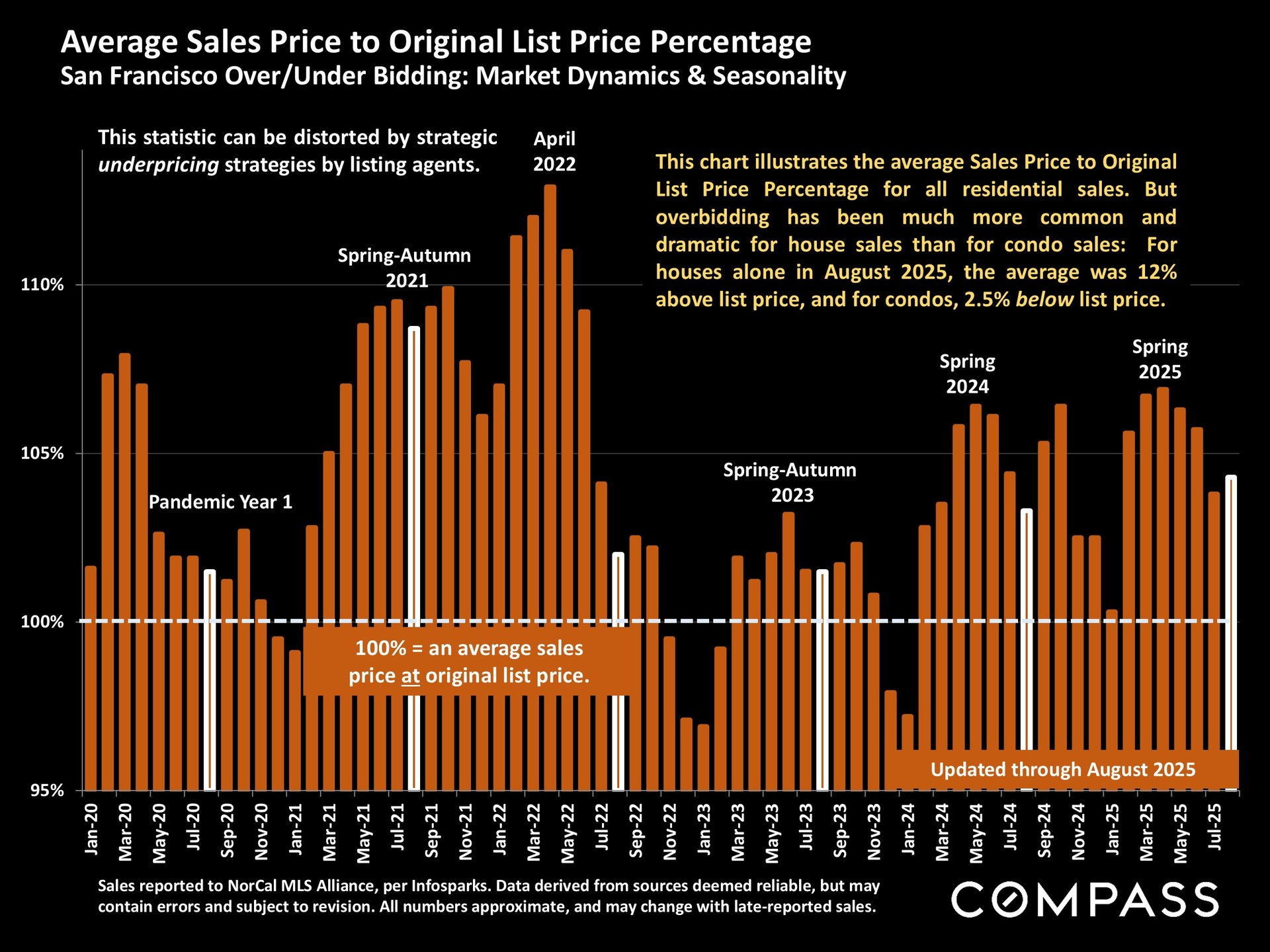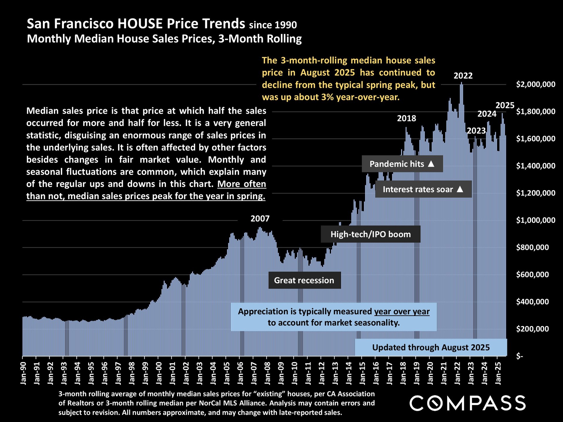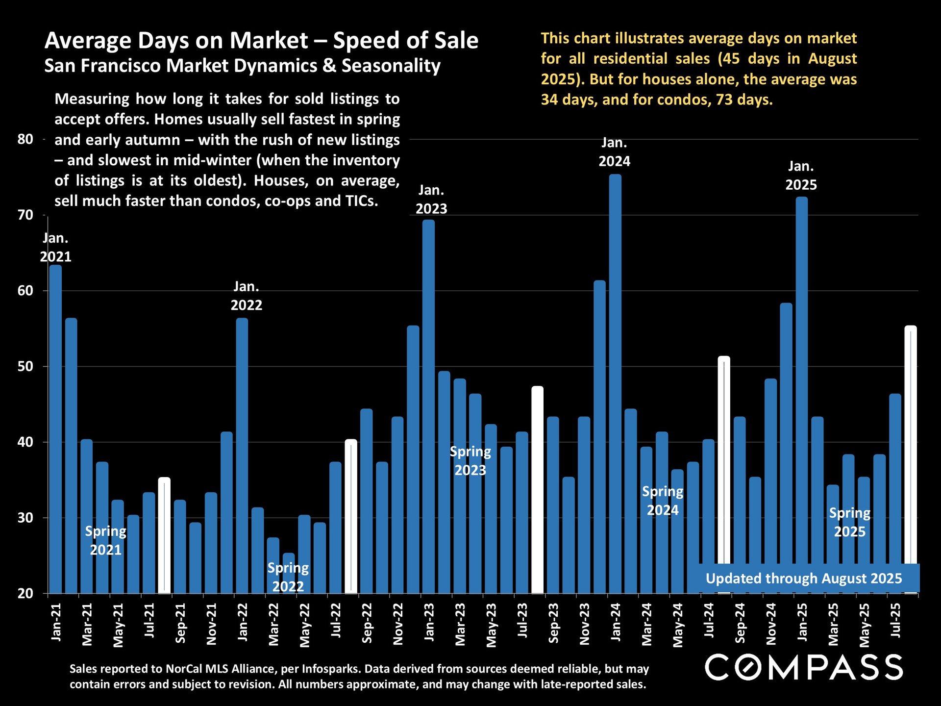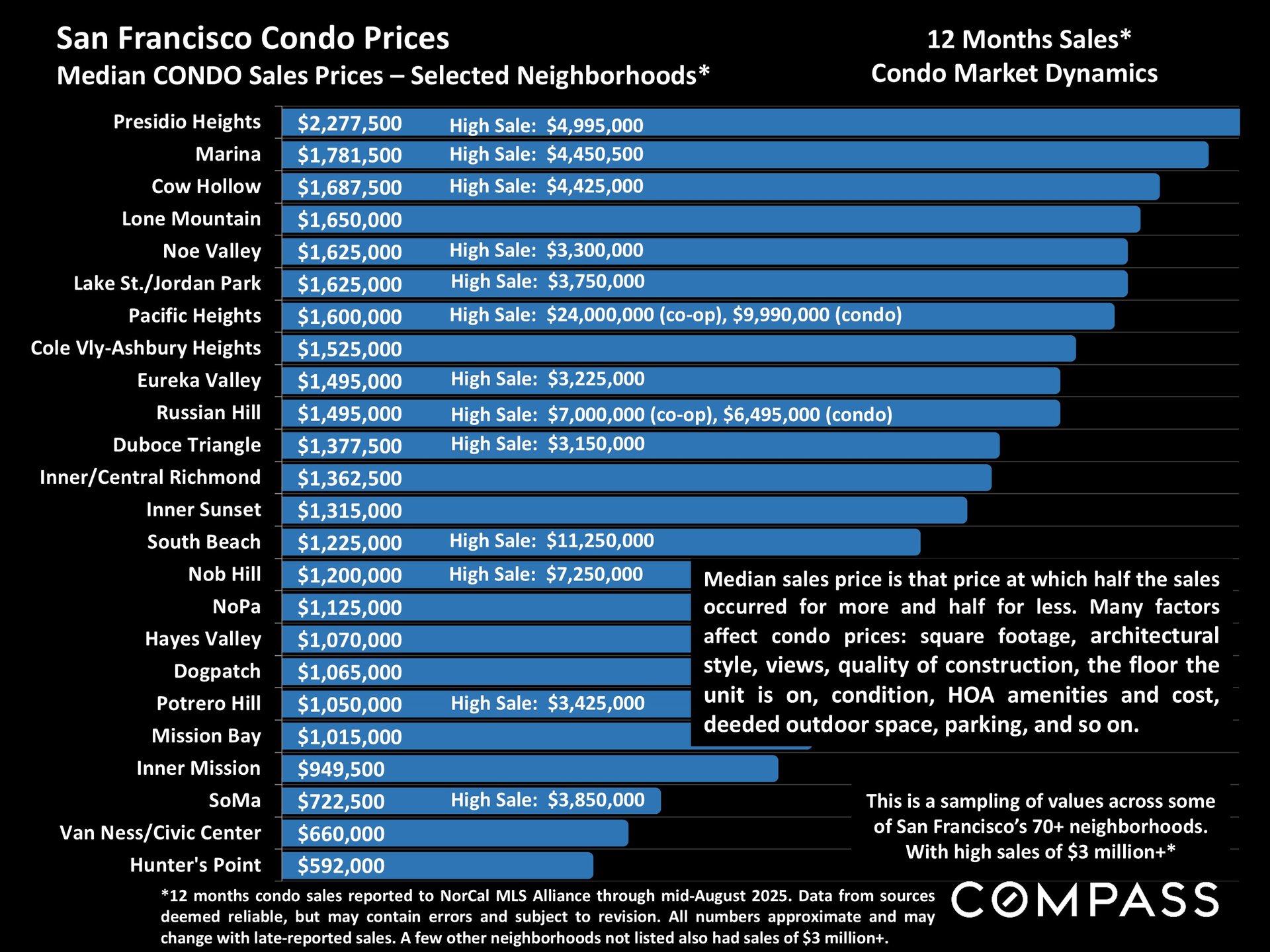 Generally speaking, this summer’s market saw no large shifts in market dynamics beyond typical seasonal changes, and due to the AI boom, San Francisco remains one of the strongest markets in the Bay Area. The focus now is on the fall selling season, which runs from early September to early November before listing and sales activity begins to plunge for the mid- winter holidays. Early fall almost always begins with a huge surge in new listings, which then provides a substantial boost to sales activity, especially in higher-price segments. Probably the biggest wild card right now is what is going to happen to interest rates, but economic indicators present a surprisingly wide range of mixed messages. As of the first week of September, mortgage rates, at slightly below 6.3%, are suddenly getting close to the 6% range many analysts believe is required to significantly boost buyer demand. But interest rates have been extremely volatile in recent years, with big, sudden changes in direction common – as occurred last year in late summer/early autumn. The AI boom continues to gain traction in San Francisco, and stock markets have hit new all-time highs in the past month, a big positive for affluent real estate markets like SF. The last inflation reading was unchanged at 2.7%, but the more recent Producer Price Index saw its largest monthly increase in over 3 years. Consumer confidence readings remain low; measures of economic uncertainty and political volatility – both national and international – remain high; and the latest jobs report was generally considered relatively dismal. Consensus opinion is predicting the Fed will drop its benchmark rate this month – for the first time in 2025 – but much depends on inflation reports due in coming weeks. Besides the usual review of standard measurements of supply and demand, this report also contains detailed information regarding San Francisco’s neighborhood markets.