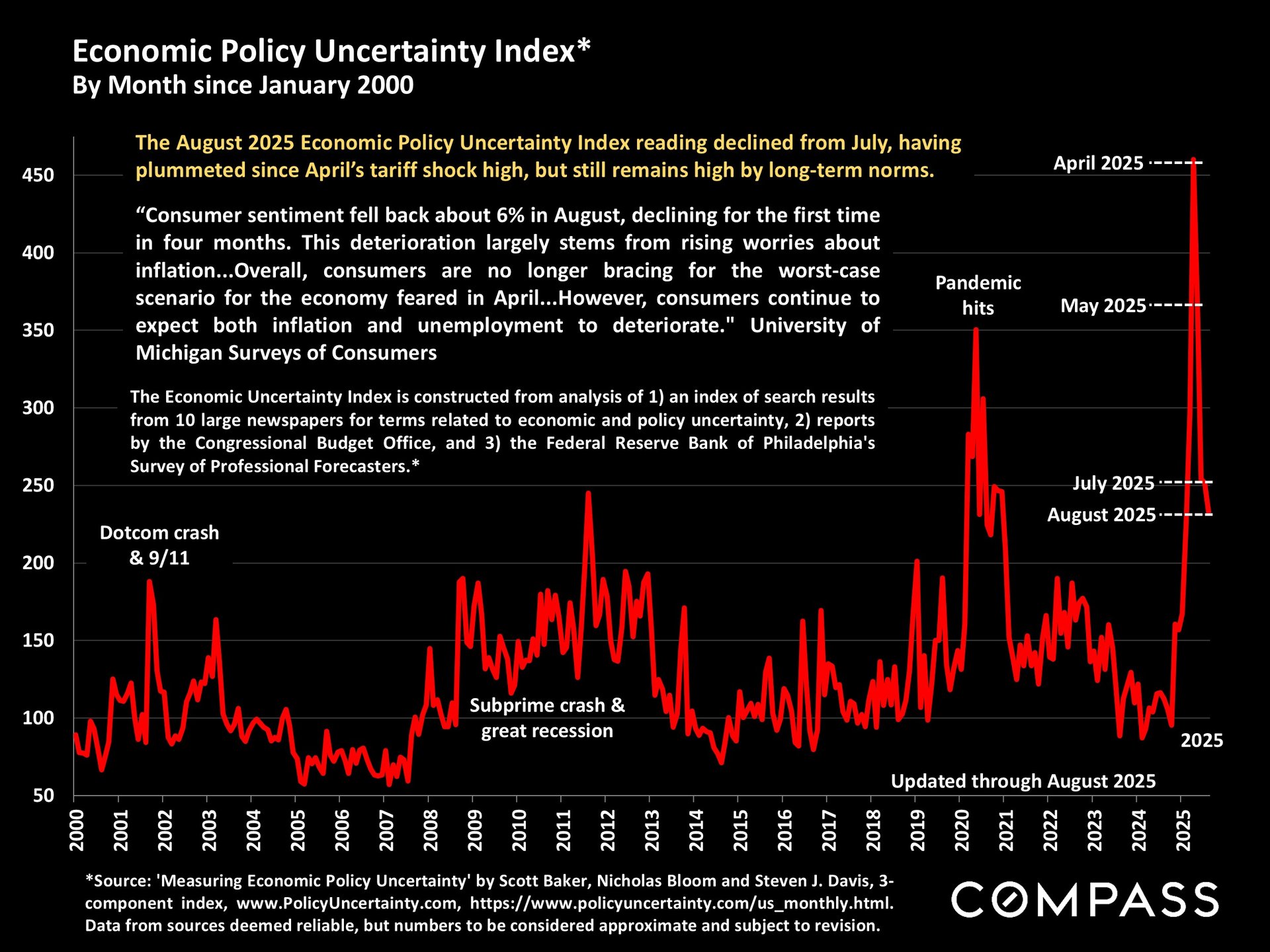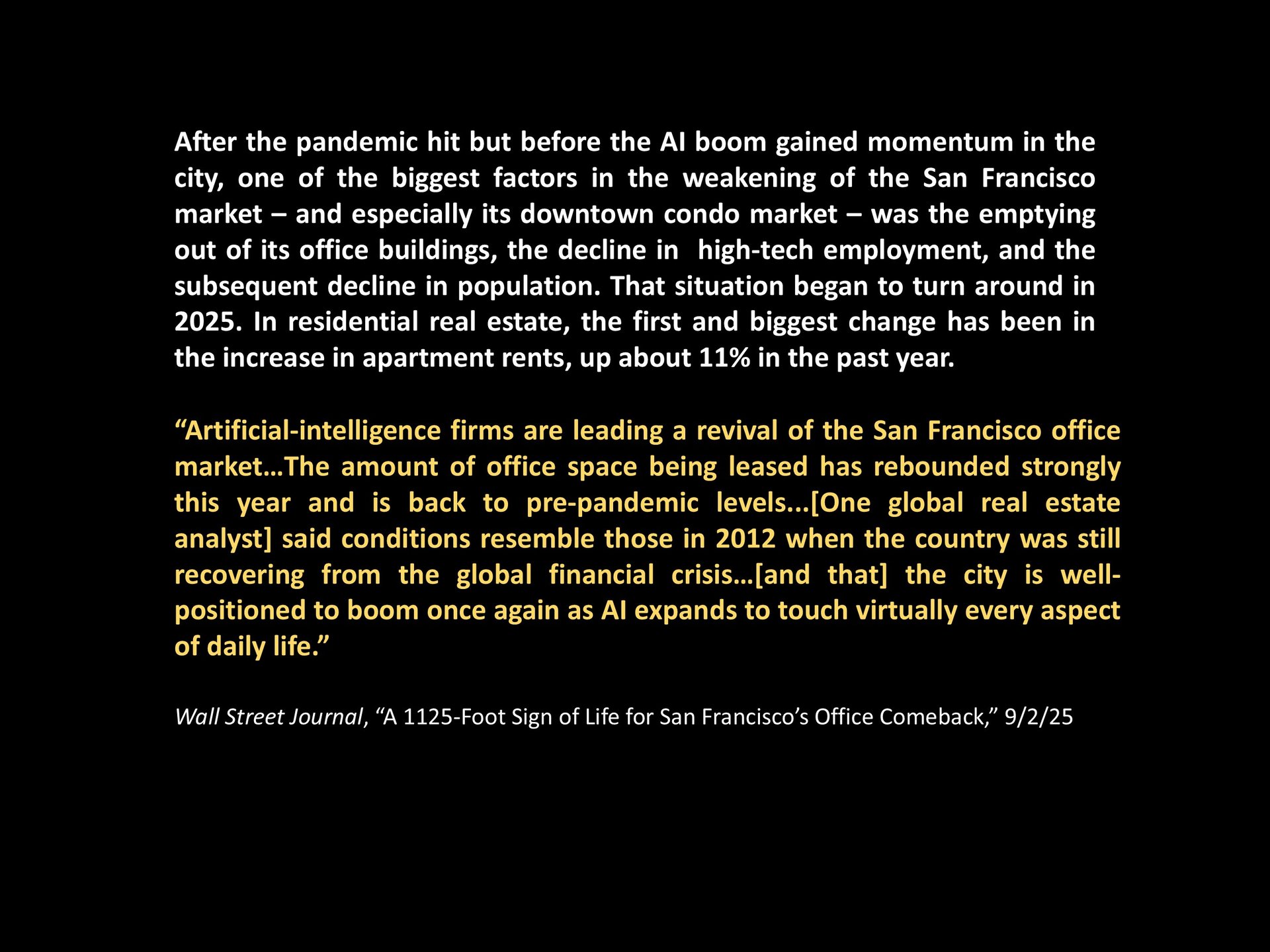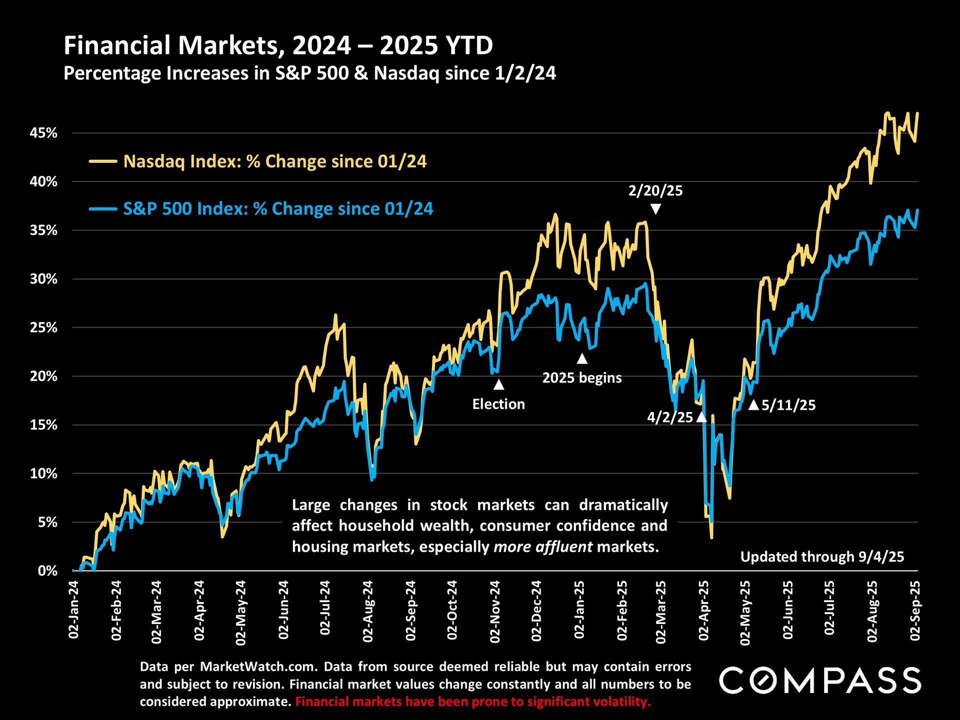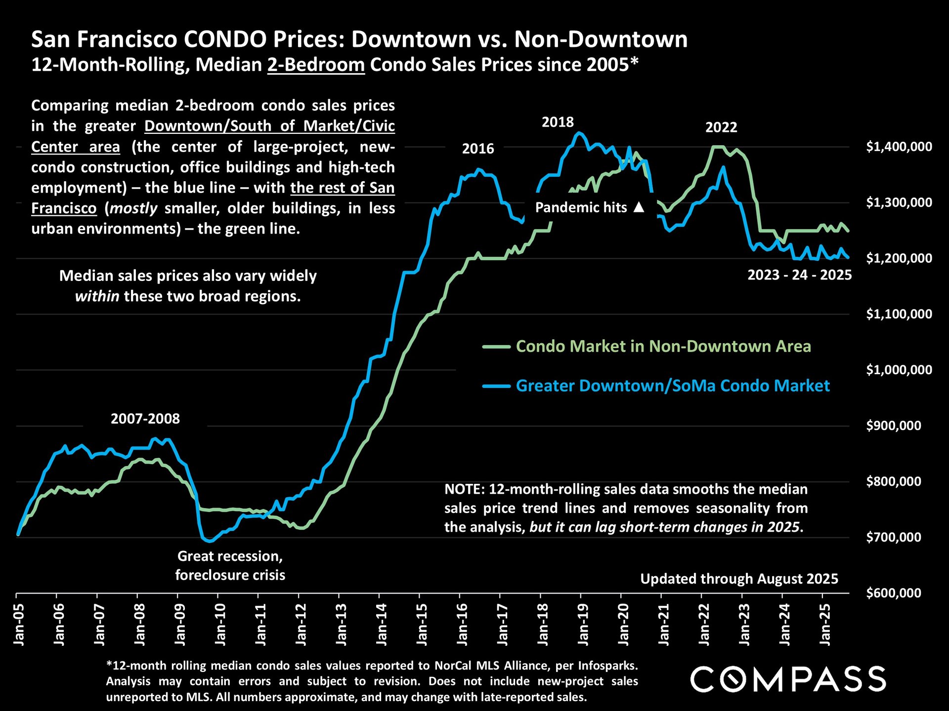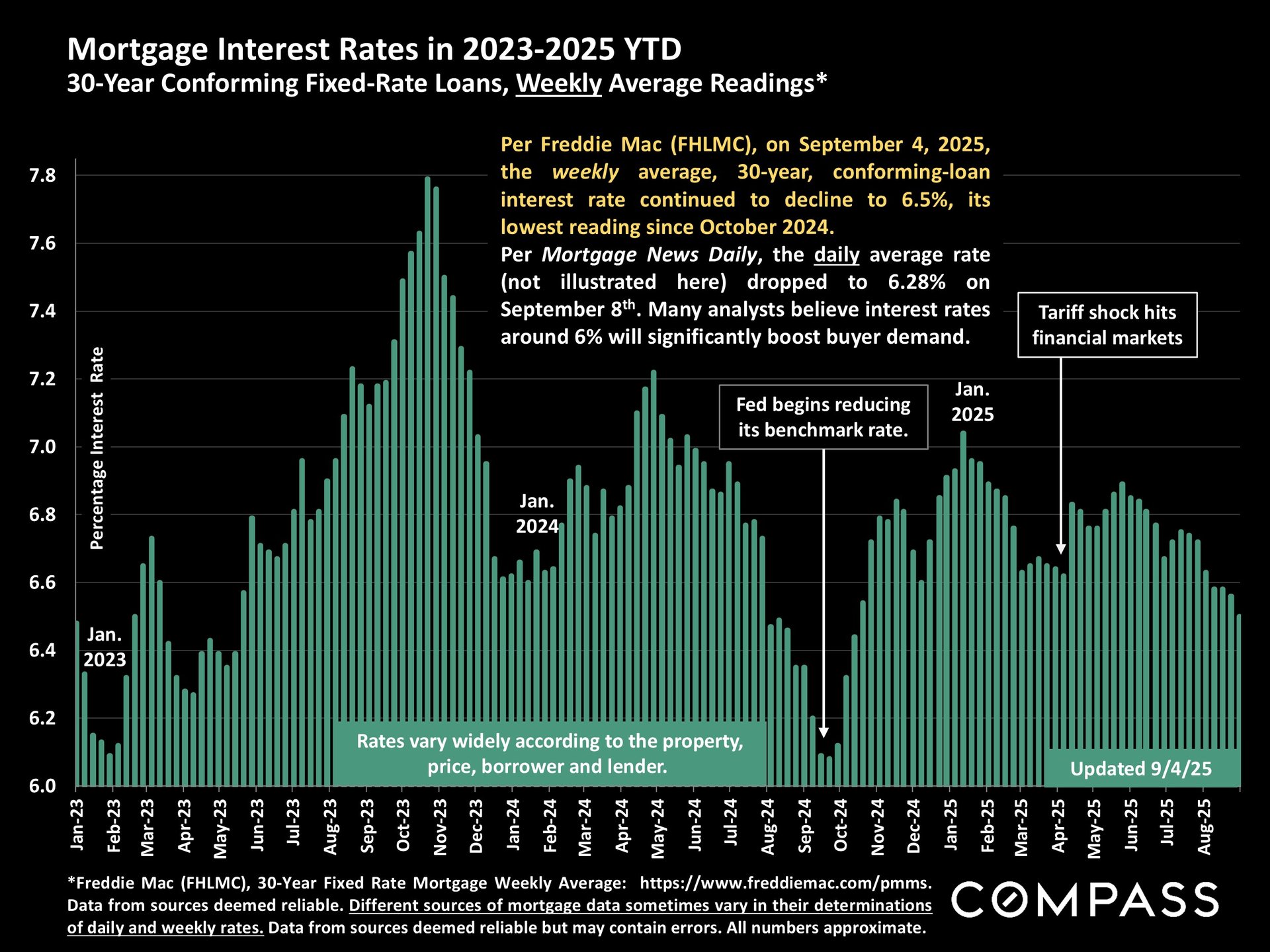 Generally speaking, this summer’s market saw no large shifts in market dynamics beyond typical seasonal changes, and due to the AI boom, San Francisco remains one of the strongest markets in the Bay Area. The focus now is on the fall selling season, which runs from early September to early November before listing and sales activity begins to plunge for the mid- winter holidays. Early fall almost always begins with a huge surge in new listings, which then provides a substantial boost to sales activity, especially in higher-price segments. Probably the biggest wild card right now is what is going to happen to interest rates, but economic indicators present a surprisingly wide range of mixed messages. As of the first week of September, mortgage rates, at slightly below 6.3%, are suddenly getting close to the 6% range many analysts believe is required to significantly boost buyer demand. But interest rates have been extremely volatile in recent years, with big, sudden changes in direction common – as occurred last year in late summer/early autumn. The AI boom continues to gain traction in San Francisco, and stock markets have hit new all-time highs in the past month, a big positive for affluent real estate markets like SF. The last inflation reading was unchanged at 2.7%, but the more recent Producer Price Index saw its largest monthly increase in over 3 years. Consumer confidence readings remain low; measures of economic uncertainty and political volatility – both national and international – remain high; and the latest jobs report was generally considered relatively dismal. Consensus opinion is predicting the Fed will drop its benchmark rate this month – for the first time in 2025 – but much depends on inflation reports due in coming weeks. Besides the usual review of standard measurements of supply and demand, this report also contains detailed information regarding San Francisco’s neighborhood markets.