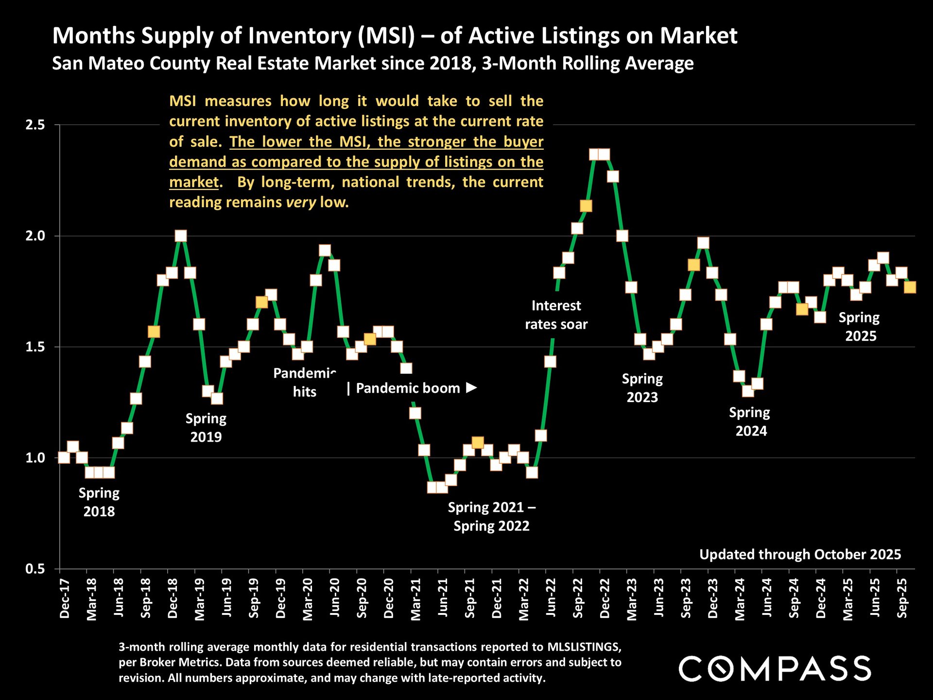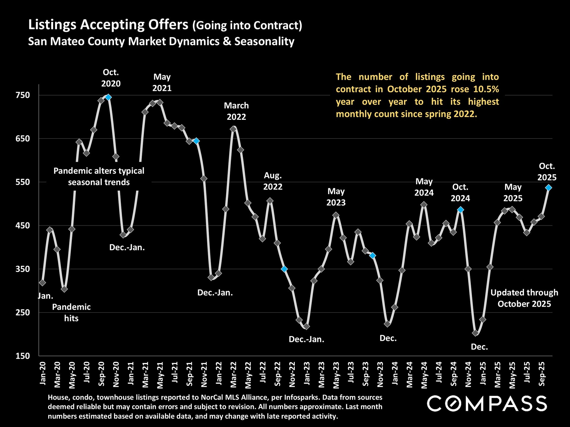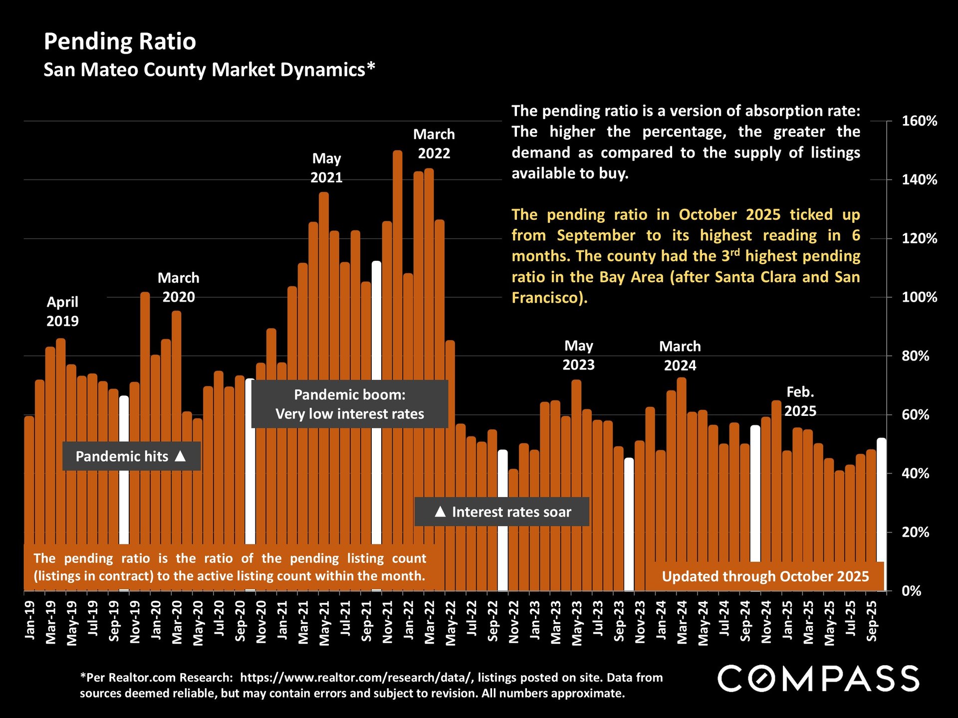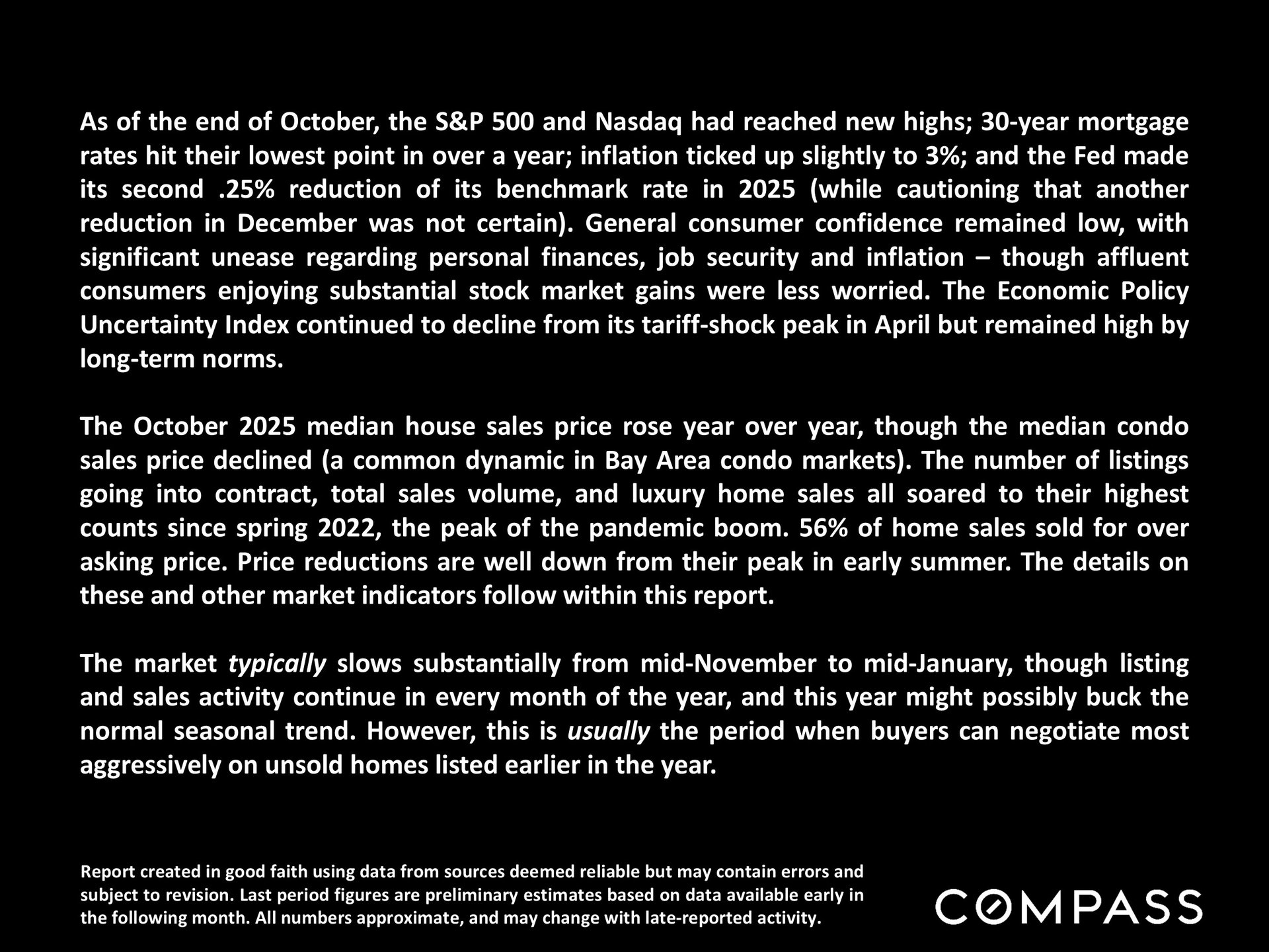 As of the end of October, the S&P 500 and Nasdaq had reached new highs; 30-year mortgage rates hit their lowest point in over a year; inflation ticked up slightly to 3%; and the Fed made its second .25% reduction of its benchmark rate in 2025 (while cautioning that another reduction in December was not certain). General consumer confidence remained low, with significant unease regarding personal finances, job security and inflation – though affluent consumers enjoying substantial stock market gains were less worried. The Economic Policy Uncertainty Index continued to decline from its tariff-shock peak in April but remained high by long-term norms. The San Francisco real estate market continues to rapidly accelerate due to the AI startup boom: October's sales hit the highest count since May 2022, while luxury home sales were the best in 4 years. The number of price reductions plummeted 46% on a year-over-year basis, while the pending ratio – a standard measure of market heat – hit its highest monthly reading since the peak of the pandemic boom. 80% of house sales and 44% of condo sales sold for over list price. Virtually all the market indicators point to a dramatic increase in buyer demand competing for a declining number of listings. The market typically slows from mid-November to mid-January, though it’s possible that this year will buck that trend. In any case, listing and sales activity continue in every month of the year – however, mid-winter is usually the period when buyers can negotiate most aggressively on unsold homes listed earlier in the year.