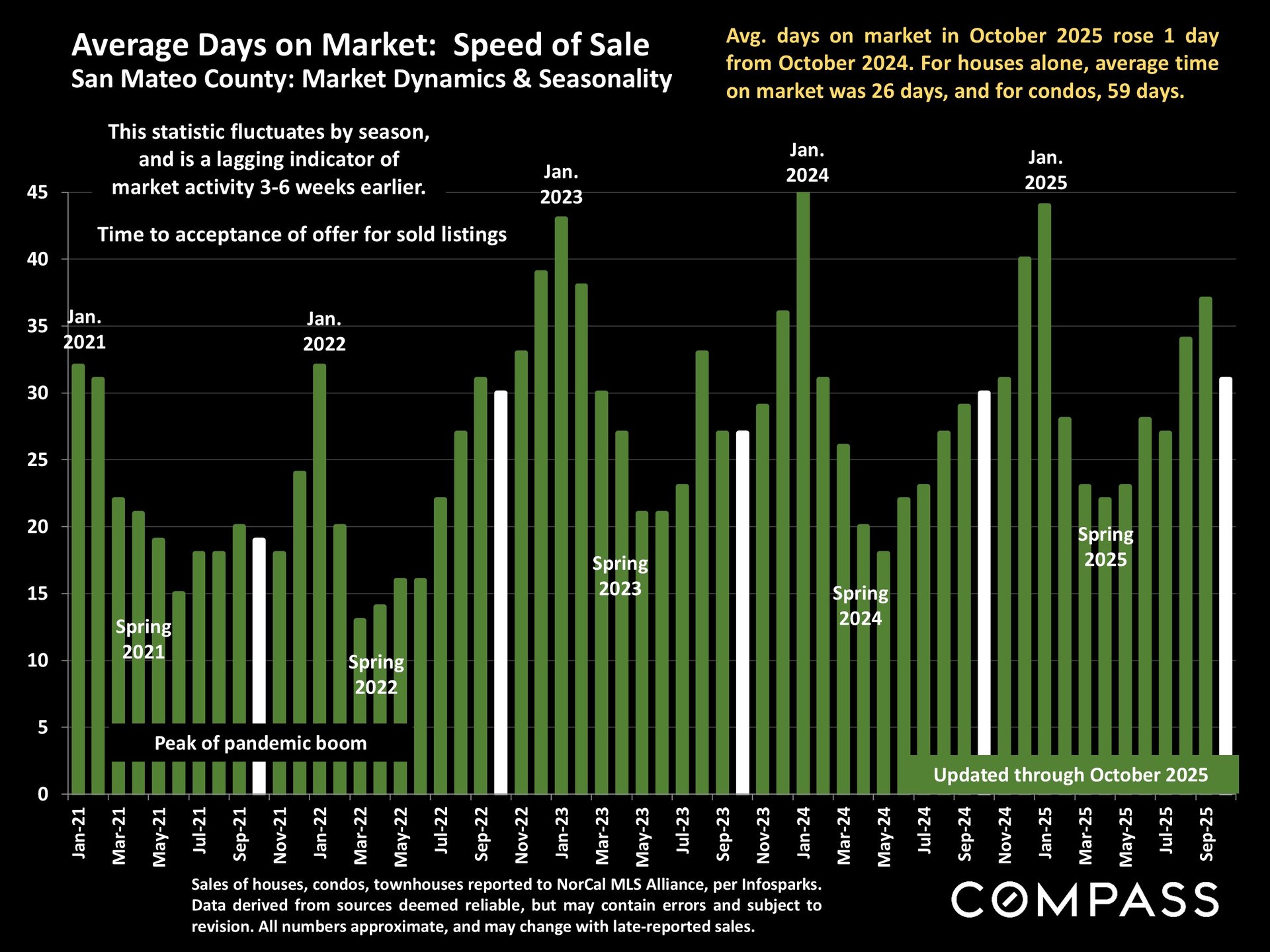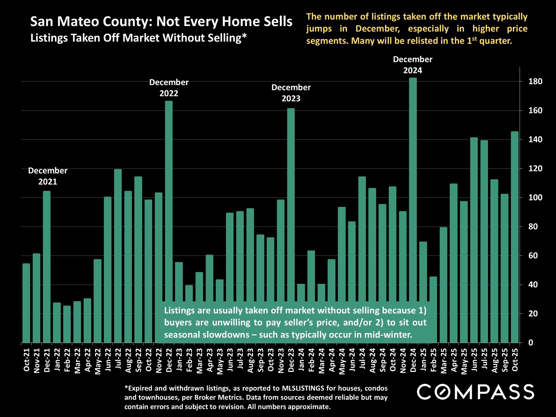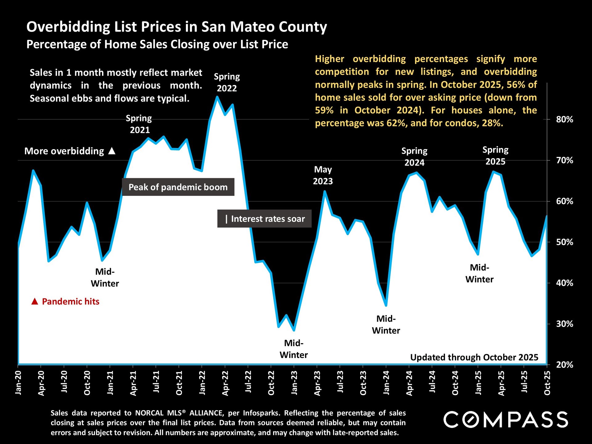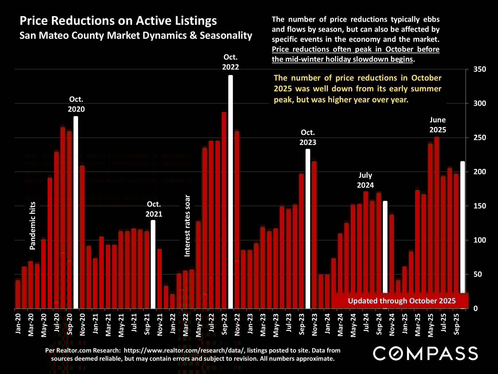 As of the end of October, the S&P 500 and Nasdaq had reached new highs; 30-year mortgage rates hit their lowest point in over a year; inflation ticked up slightly to 3%; and the Fed made its second .25% reduction of its benchmark rate in 2025 (while cautioning that another reduction in December was not certain). General consumer confidence remained low, with significant unease regarding personal finances, job security and inflation – though affluent consumers enjoying substantial stock market gains were less worried. The Economic Policy Uncertainty Index continued to decline from its tariff-shock peak in April but remained high by long-term norms. The San Francisco real estate market continues to rapidly accelerate due to the AI startup boom: October's sales hit the highest count since May 2022, while luxury home sales were the best in 4 years. The number of price reductions plummeted 46% on a year-over-year basis, while the pending ratio – a standard measure of market heat – hit its highest monthly reading since the peak of the pandemic boom. 80% of house sales and 44% of condo sales sold for over list price. Virtually all the market indicators point to a dramatic increase in buyer demand competing for a declining number of listings. The market typically slows from mid-November to mid-January, though it’s possible that this year will buck that trend. In any case, listing and sales activity continue in every month of the year – however, mid-winter is usually the period when buyers can negotiate most aggressively on unsold homes listed earlier in the year.