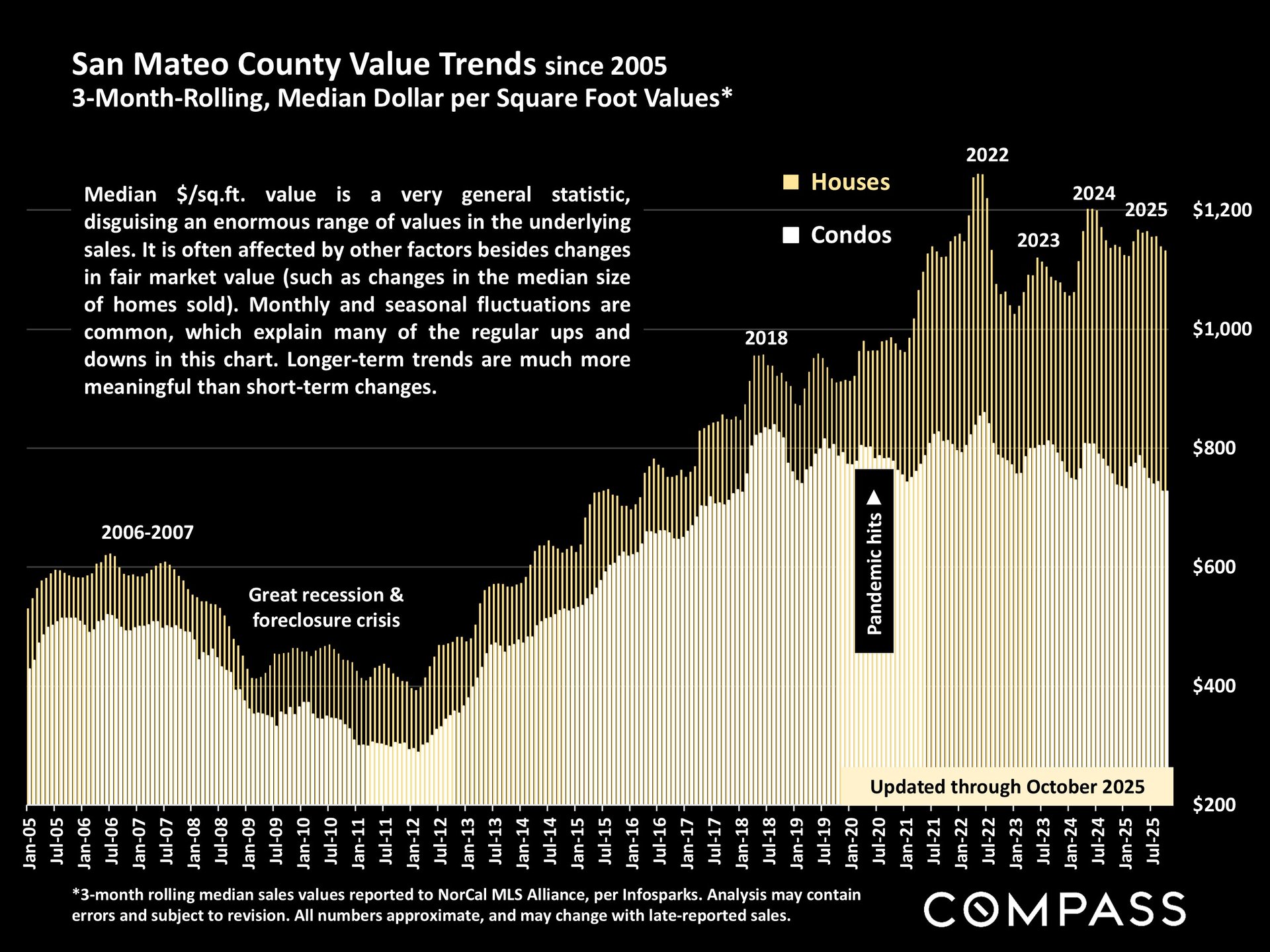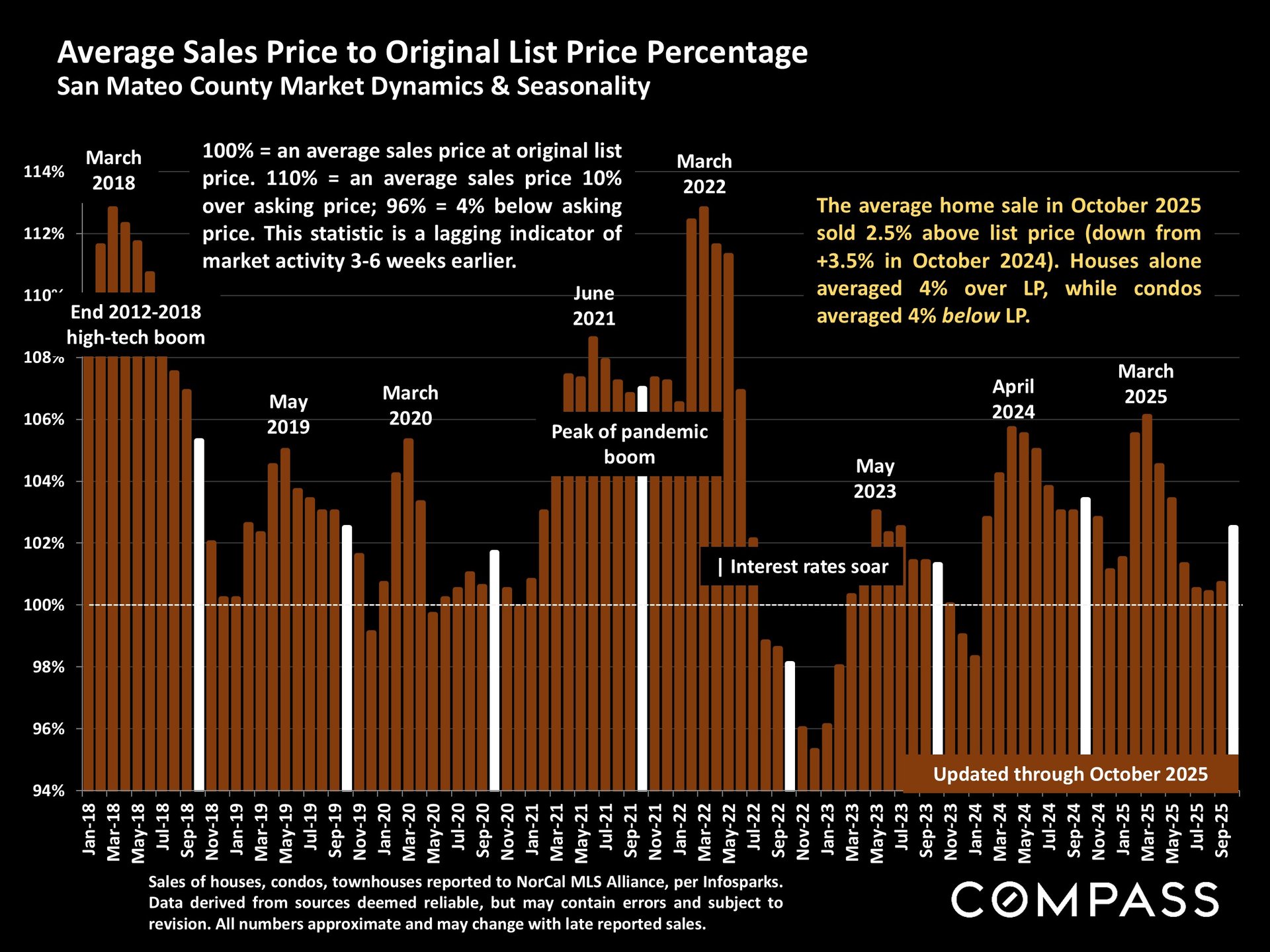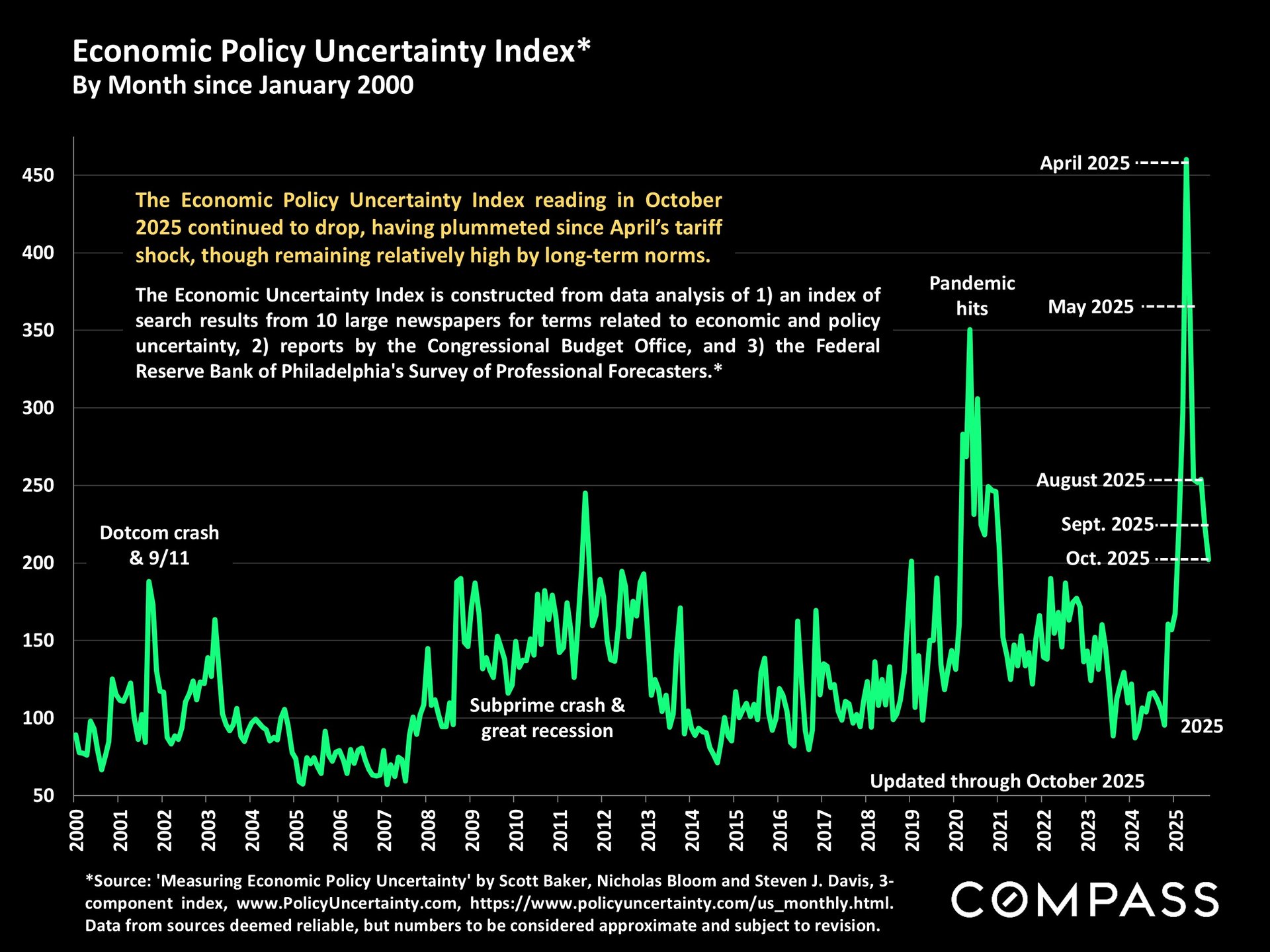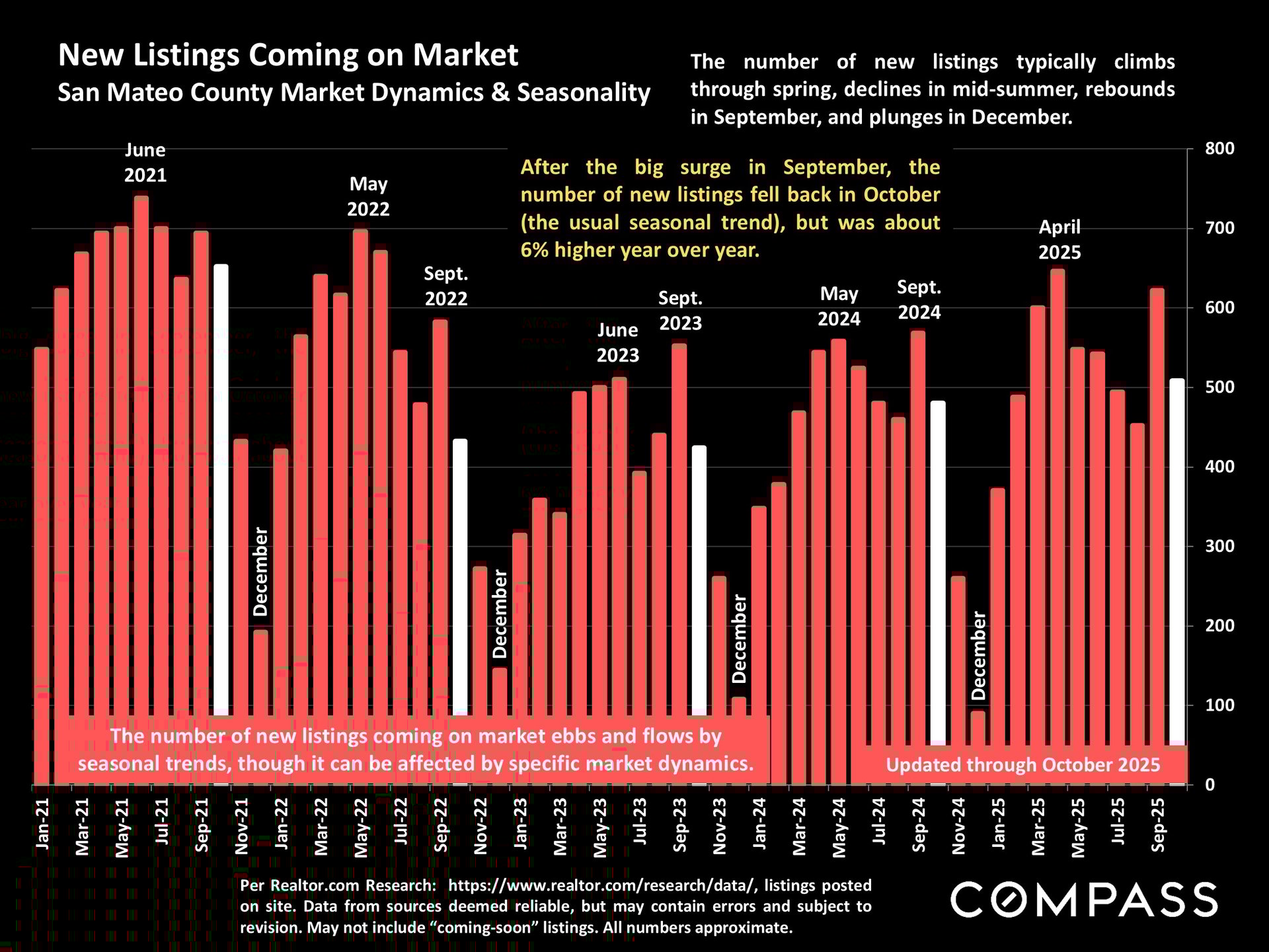 As of the end of October, the S&P 500 and Nasdaq had reached new highs; 30-year mortgage rates hit their lowest point in over a year; inflation ticked up slightly to 3%; and the Fed made its second .25% reduction of its benchmark rate in 2025 (while cautioning that another reduction in December was not certain). General consumer confidence remained low, with significant unease regarding personal finances, job security and inflation – though affluent consumers enjoying substantial stock market gains were less worried. The Economic Policy Uncertainty Index continued to decline from its tariff-shock peak in April but remained high by long-term norms. The San Francisco real estate market continues to rapidly accelerate due to the AI startup boom: October's sales hit the highest count since May 2022, while luxury home sales were the best in 4 years. The number of price reductions plummeted 46% on a year-over-year basis, while the pending ratio – a standard measure of market heat – hit its highest monthly reading since the peak of the pandemic boom. 80% of house sales and 44% of condo sales sold for over list price. Virtually all the market indicators point to a dramatic increase in buyer demand competing for a declining number of listings. The market typically slows from mid-November to mid-January, though it’s possible that this year will buck that trend. In any case, listing and sales activity continue in every month of the year – however, mid-winter is usually the period when buyers can negotiate most aggressively on unsold homes listed earlier in the year.