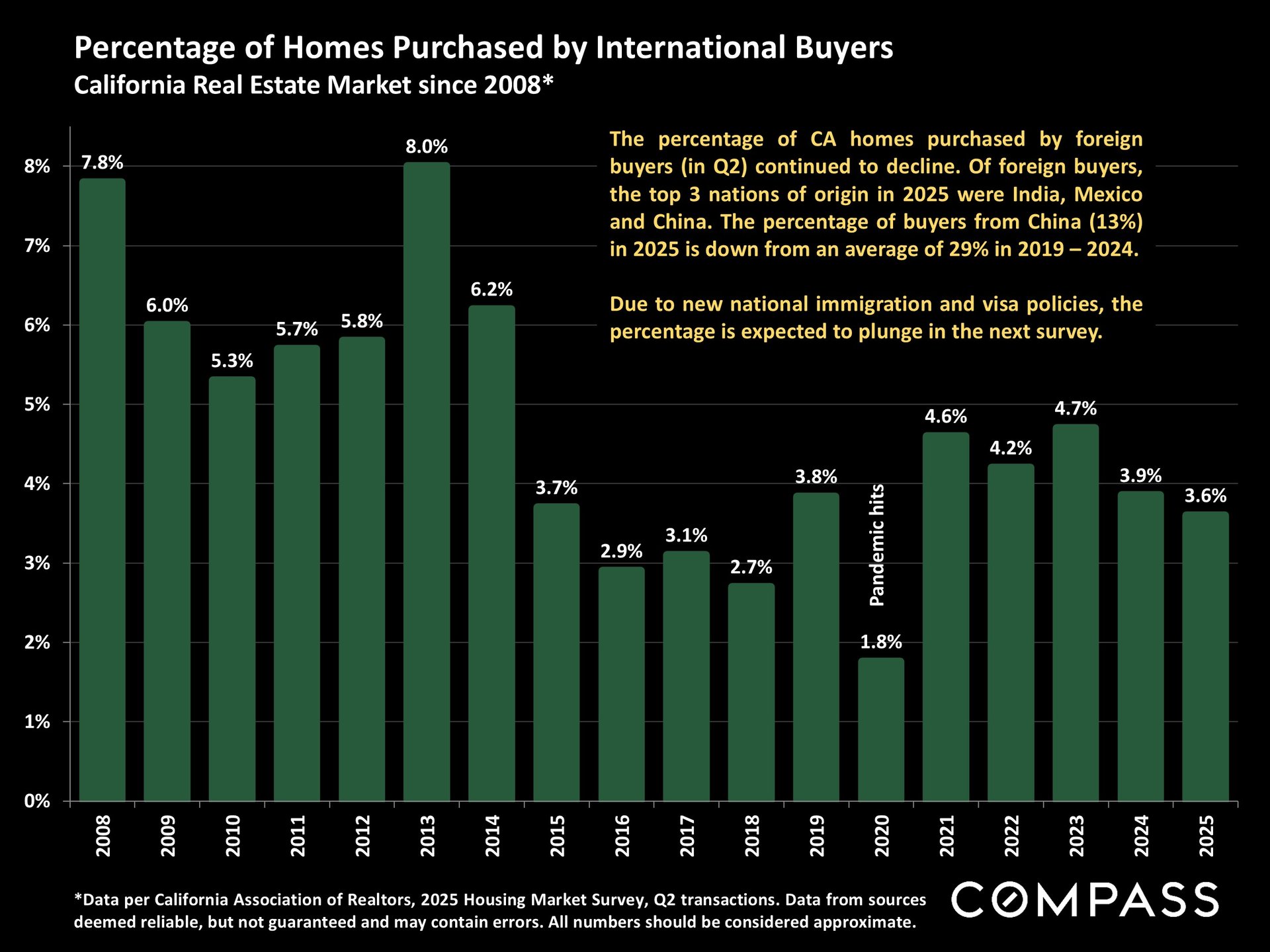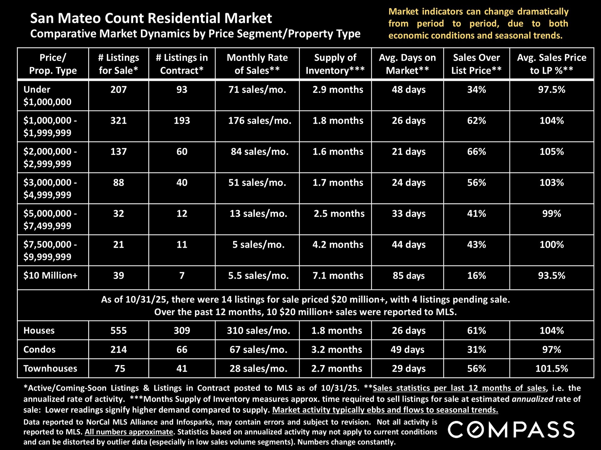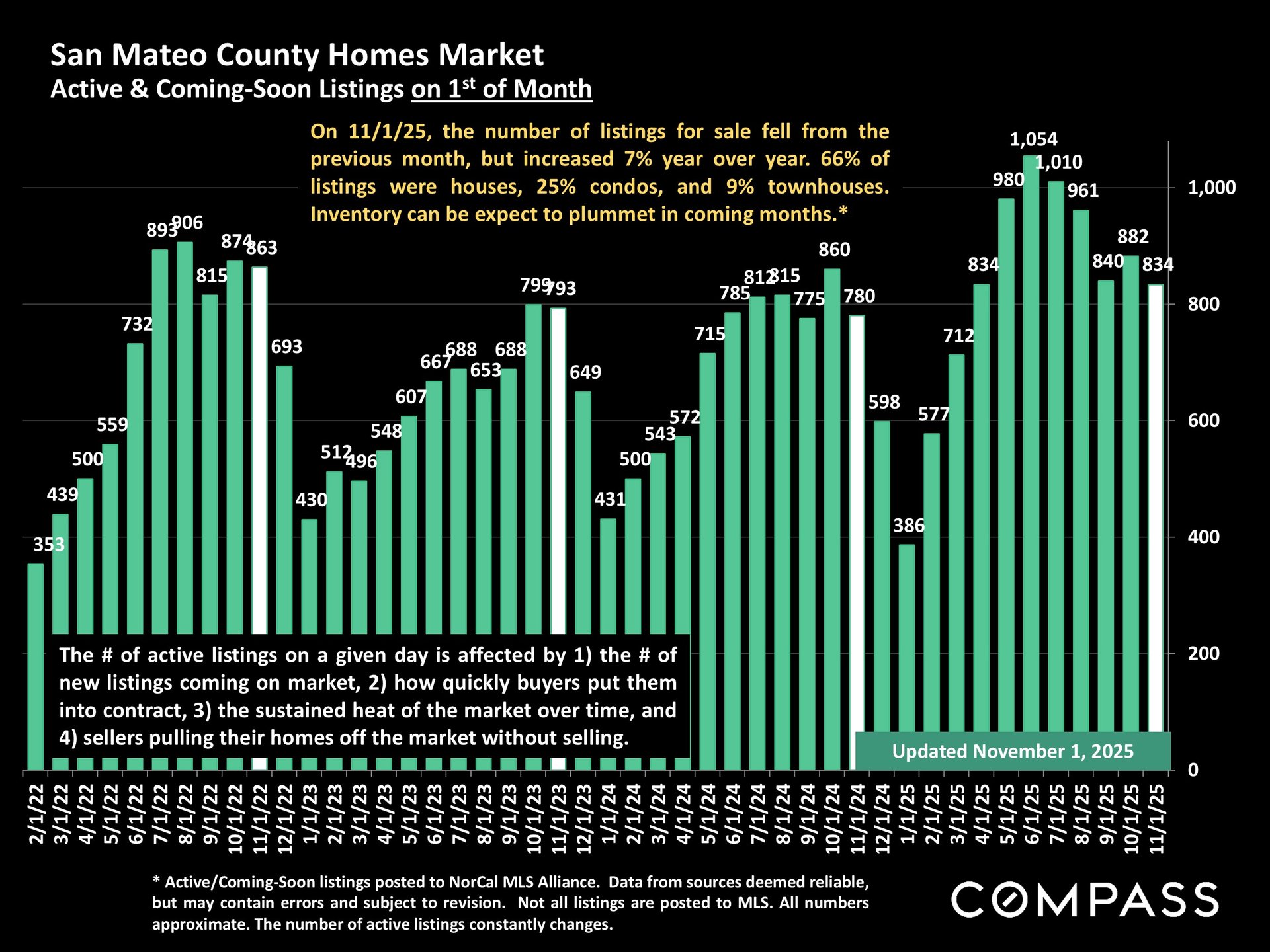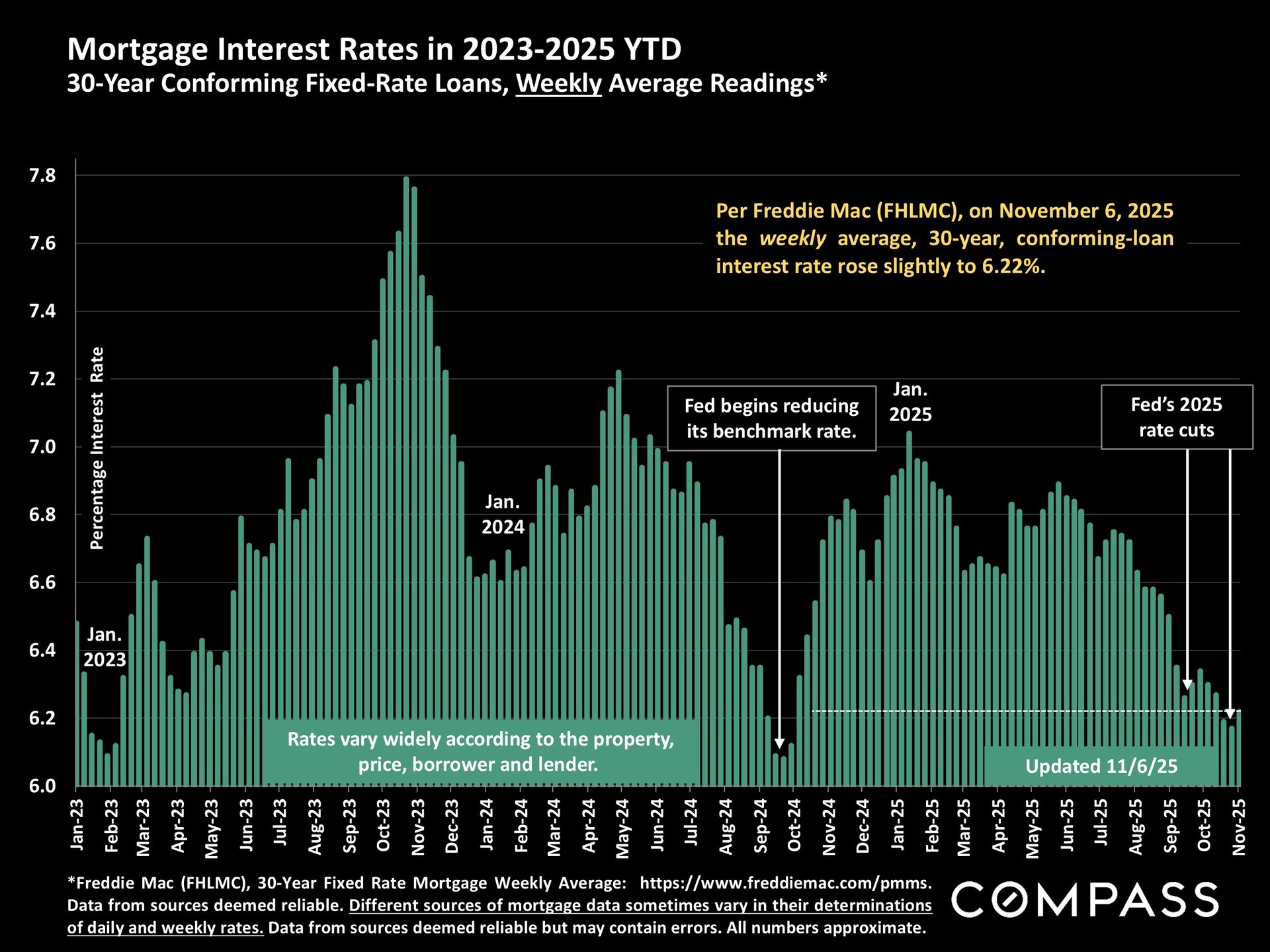 As of the end of October, the S&P 500 and Nasdaq had reached new highs; 30-year mortgage rates hit their lowest point in over a year; inflation ticked up slightly to 3%; and the Fed made its second .25% reduction of its benchmark rate in 2025 (while cautioning that another reduction in December was not certain). General consumer confidence remained low, with significant unease regarding personal finances, job security and inflation – though affluent consumers enjoying substantial stock market gains were less worried. The Economic Policy Uncertainty Index continued to decline from its tariff-shock peak in April but remained high by long-term norms. The San Francisco real estate market continues to rapidly accelerate due to the AI startup boom: October's sales hit the highest count since May 2022, while luxury home sales were the best in 4 years. The number of price reductions plummeted 46% on a year-over-year basis, while the pending ratio – a standard measure of market heat – hit its highest monthly reading since the peak of the pandemic boom. 80% of house sales and 44% of condo sales sold for over list price. Virtually all the market indicators point to a dramatic increase in buyer demand competing for a declining number of listings. The market typically slows from mid-November to mid-January, though it’s possible that this year will buck that trend. In any case, listing and sales activity continue in every month of the year – however, mid-winter is usually the period when buyers can negotiate most aggressively on unsold homes listed earlier in the year.
