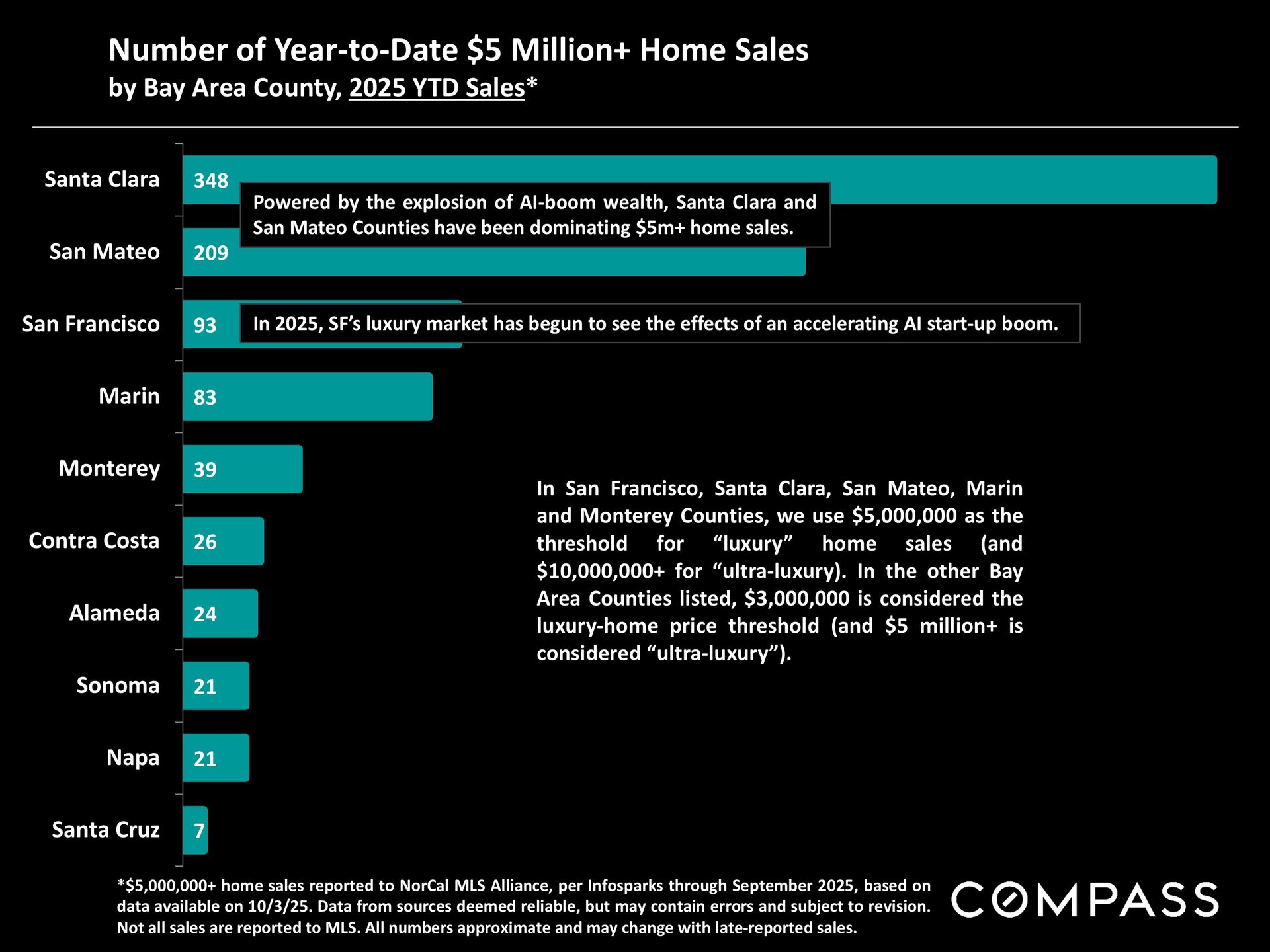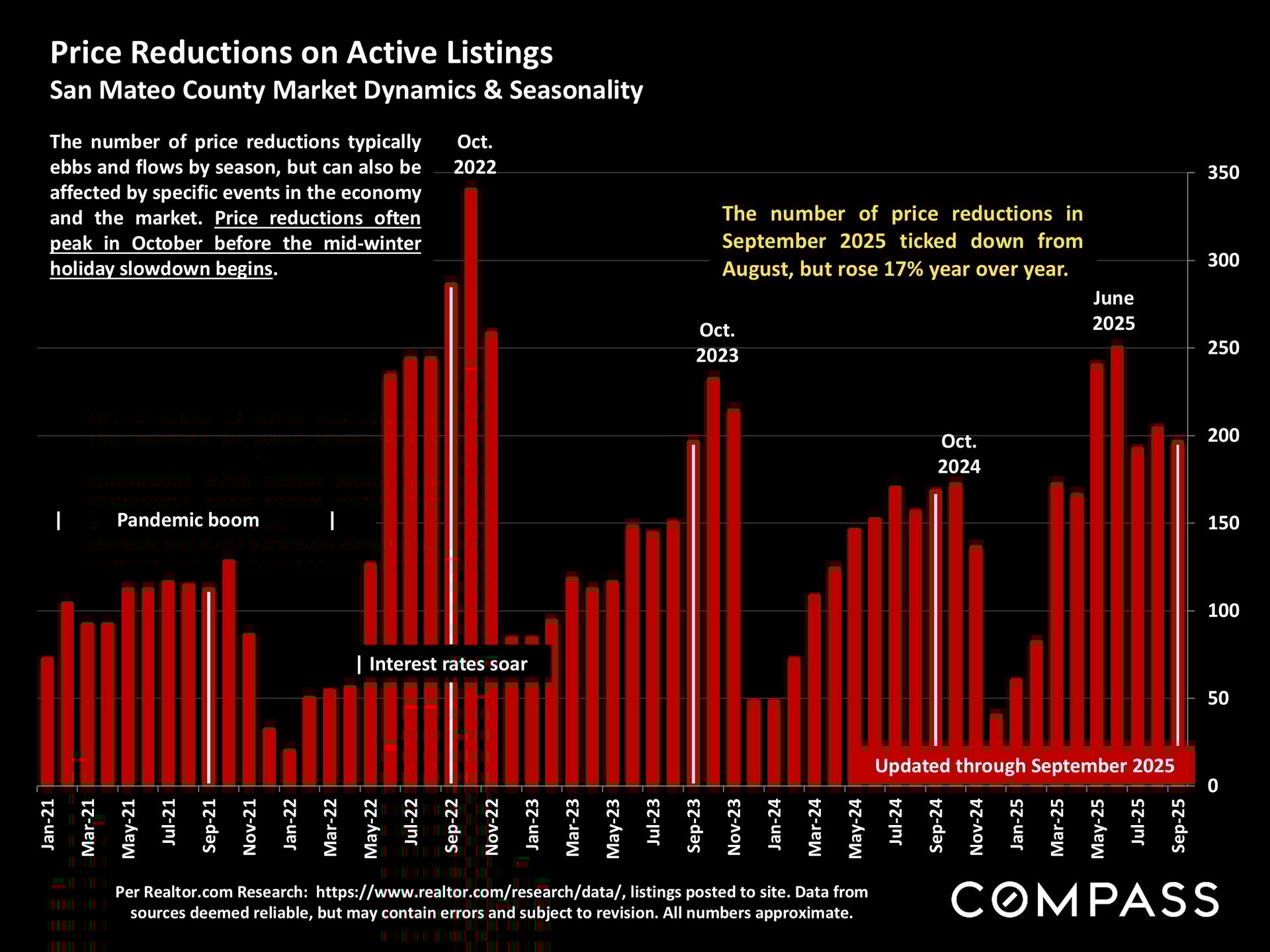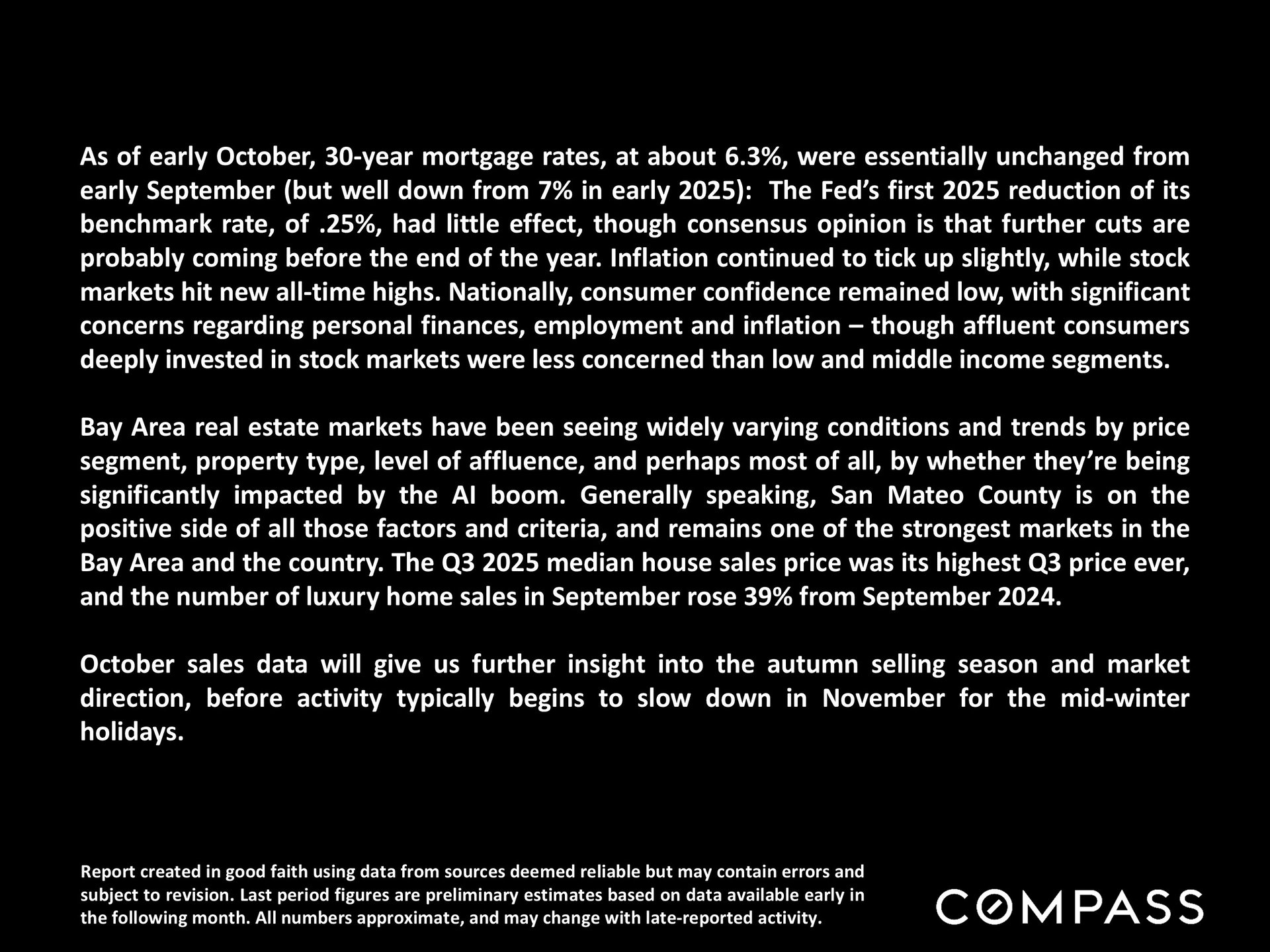 As of early October, 30-year mortgage rates, at about 6.3%, were essentially unchanged from early September (but well down from 7% in early 2025): The Fed’s first 2025 reduction of its benchmark rate, of .25%, had little effect, though consensus opinion is that further cuts are probably coming before the end of the year. Inflation continued to tick up slightly, while stock markets hit new all-time highs. Nationally, consumer confidence remained low, with significant concerns regarding personal finances, employment and inflation – though affluent consumers deeply invested in stock markets were less concerned than low and middle income segments.