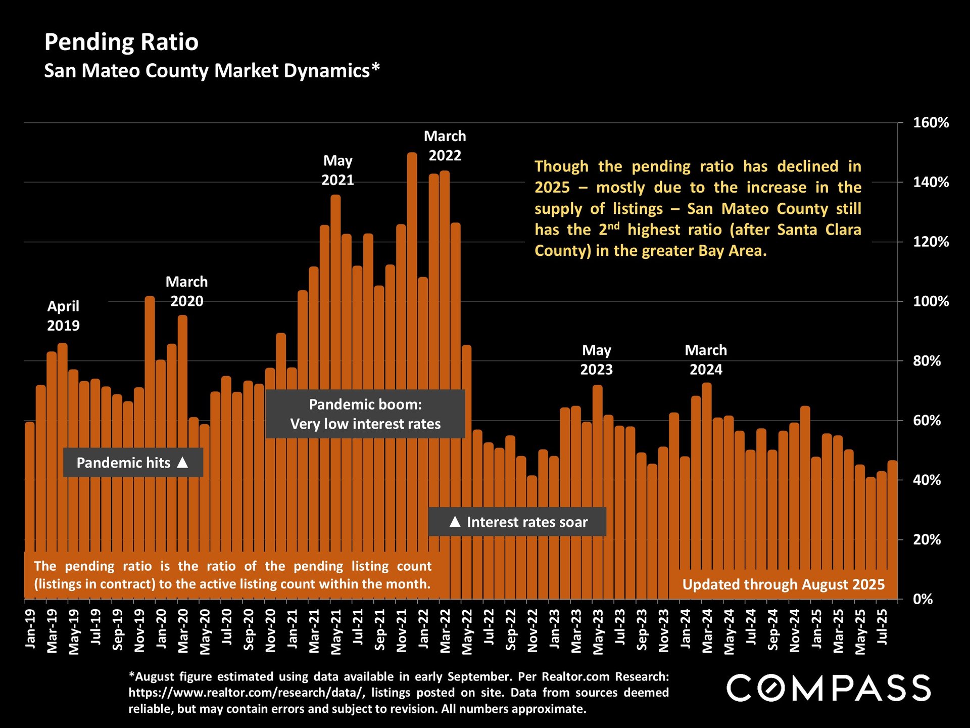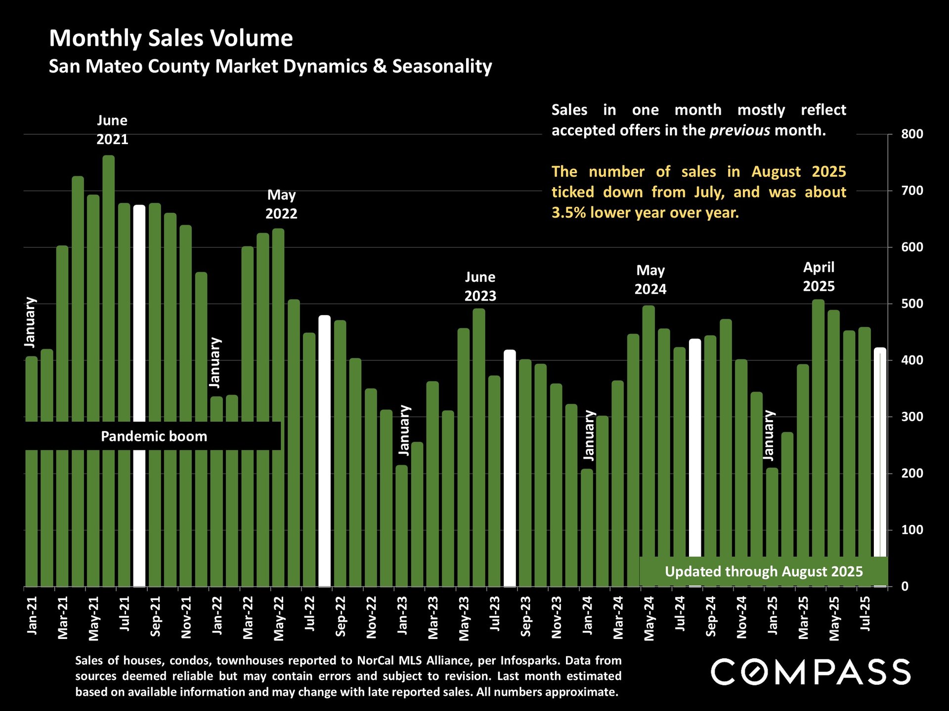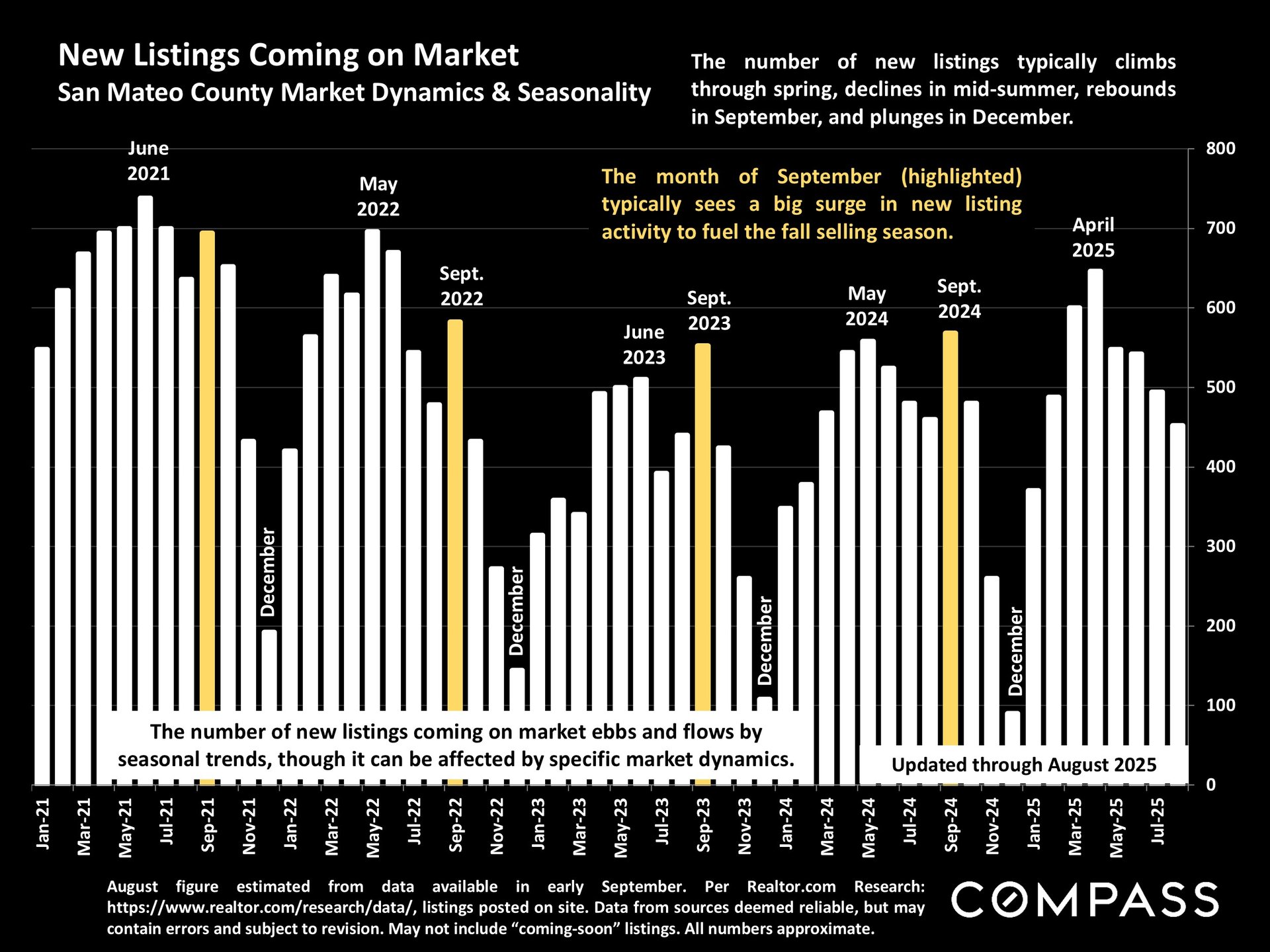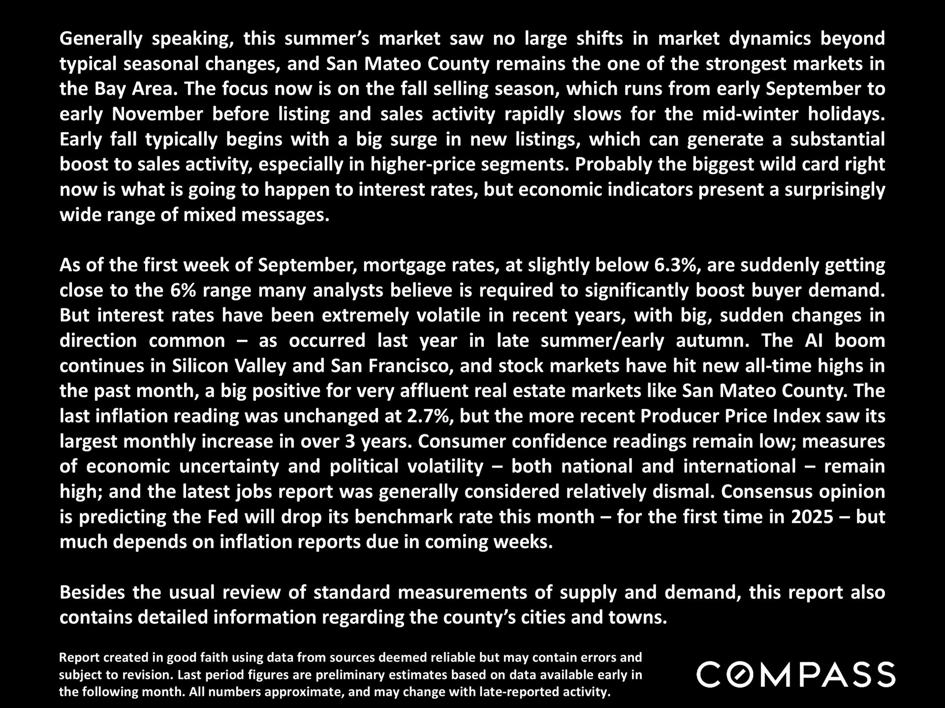 Generally speaking, this summer’s market saw no large shifts in market dynamics beyond typical seasonal changes, and due to the AI boom, San Francisco remains one of the strongest markets in the Bay Area. The focus now is on the fall selling season, which runs from early September to early November before listing and sales activity begins to plunge for the mid- winter holidays. Early fall almost always begins with a huge surge in new listings, which then provides a substantial boost to sales activity, especially in higher-price segments. Probably the biggest wild card right now is what is going to happen to interest rates, but economic indicators present a surprisingly wide range of mixed messages. As of the first week of September, mortgage rates, at slightly below 6.3%, are suddenly getting close to the 6% range many analysts believe is required to significantly boost buyer demand. But interest rates have been extremely volatile in recent years, with big, sudden changes in direction common – as occurred last year in late summer/early autumn. The AI boom continues to gain traction in San Francisco, and stock markets have hit new all-time highs in the past month, a big positive for affluent real estate markets like SF. The last inflation reading was unchanged at 2.7%, but the more recent Producer Price Index saw its largest monthly increase in over 3 years. Consumer confidence readings remain low; measures of economic uncertainty and political volatility – both national and international – remain high; and the latest jobs report was generally considered relatively dismal. Consensus opinion is predicting the Fed will drop its benchmark rate this month – for the first time in 2025 – but much depends on inflation reports due in coming weeks. Besides the usual review of standard measurements of supply and demand, this report also contains detailed information regarding San Francisco’s neighborhood markets.