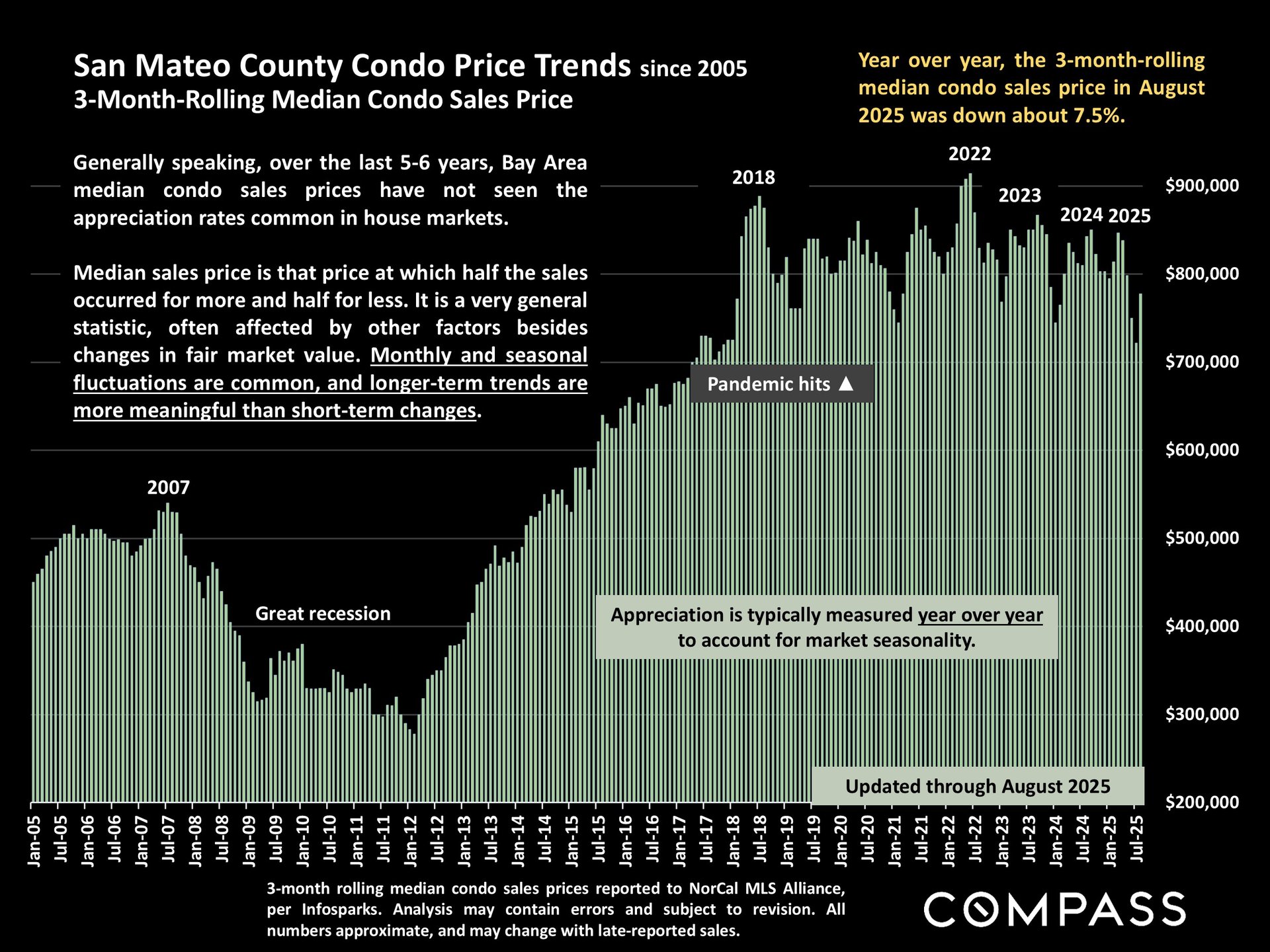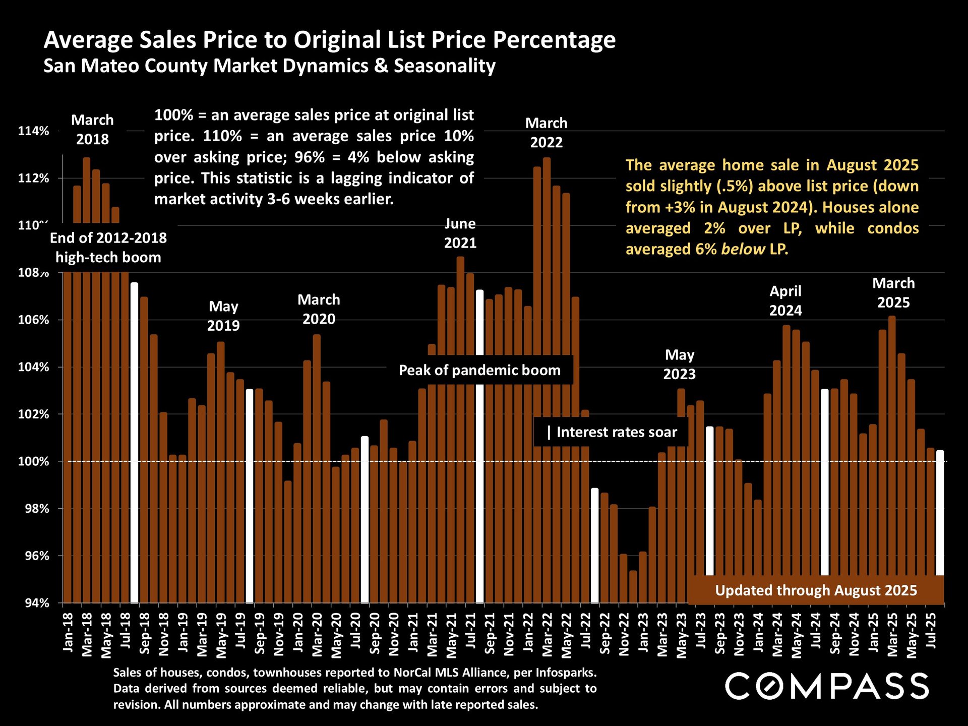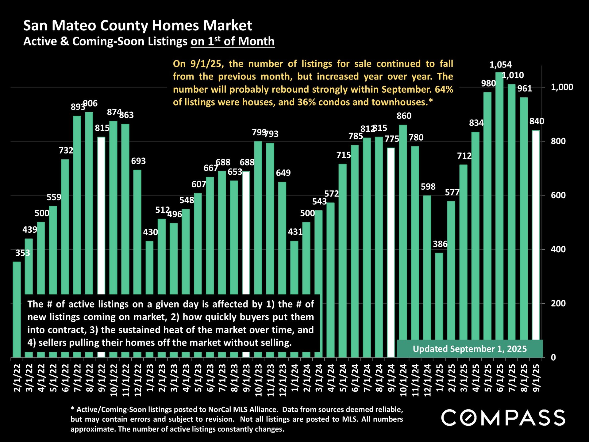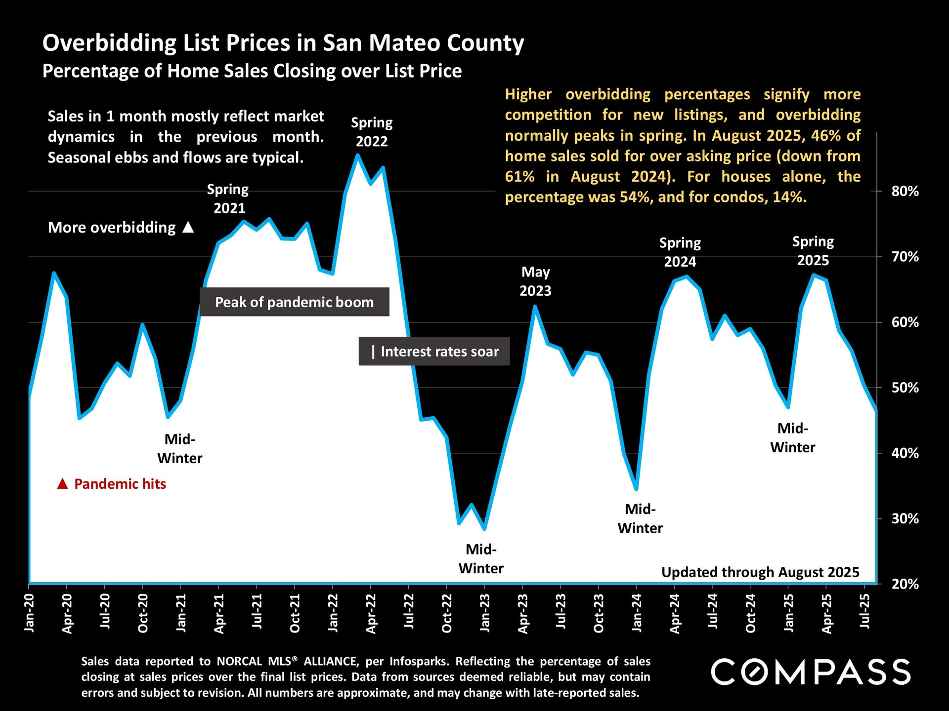 Generally speaking, this summer’s market saw no large shifts in market dynamics beyond typical seasonal changes, and due to the AI boom, San Francisco remains one of the strongest markets in the Bay Area. The focus now is on the fall selling season, which runs from early September to early November before listing and sales activity begins to plunge for the mid- winter holidays. Early fall almost always begins with a huge surge in new listings, which then provides a substantial boost to sales activity, especially in higher-price segments. Probably the biggest wild card right now is what is going to happen to interest rates, but economic indicators present a surprisingly wide range of mixed messages. As of the first week of September, mortgage rates, at slightly below 6.3%, are suddenly getting close to the 6% range many analysts believe is required to significantly boost buyer demand. But interest rates have been extremely volatile in recent years, with big, sudden changes in direction common – as occurred last year in late summer/early autumn. The AI boom continues to gain traction in San Francisco, and stock markets have hit new all-time highs in the past month, a big positive for affluent real estate markets like SF. The last inflation reading was unchanged at 2.7%, but the more recent Producer Price Index saw its largest monthly increase in over 3 years. Consumer confidence readings remain low; measures of economic uncertainty and political volatility – both national and international – remain high; and the latest jobs report was generally considered relatively dismal. Consensus opinion is predicting the Fed will drop its benchmark rate this month – for the first time in 2025 – but much depends on inflation reports due in coming weeks. Besides the usual review of standard measurements of supply and demand, this report also contains detailed information regarding San Francisco’s neighborhood markets.