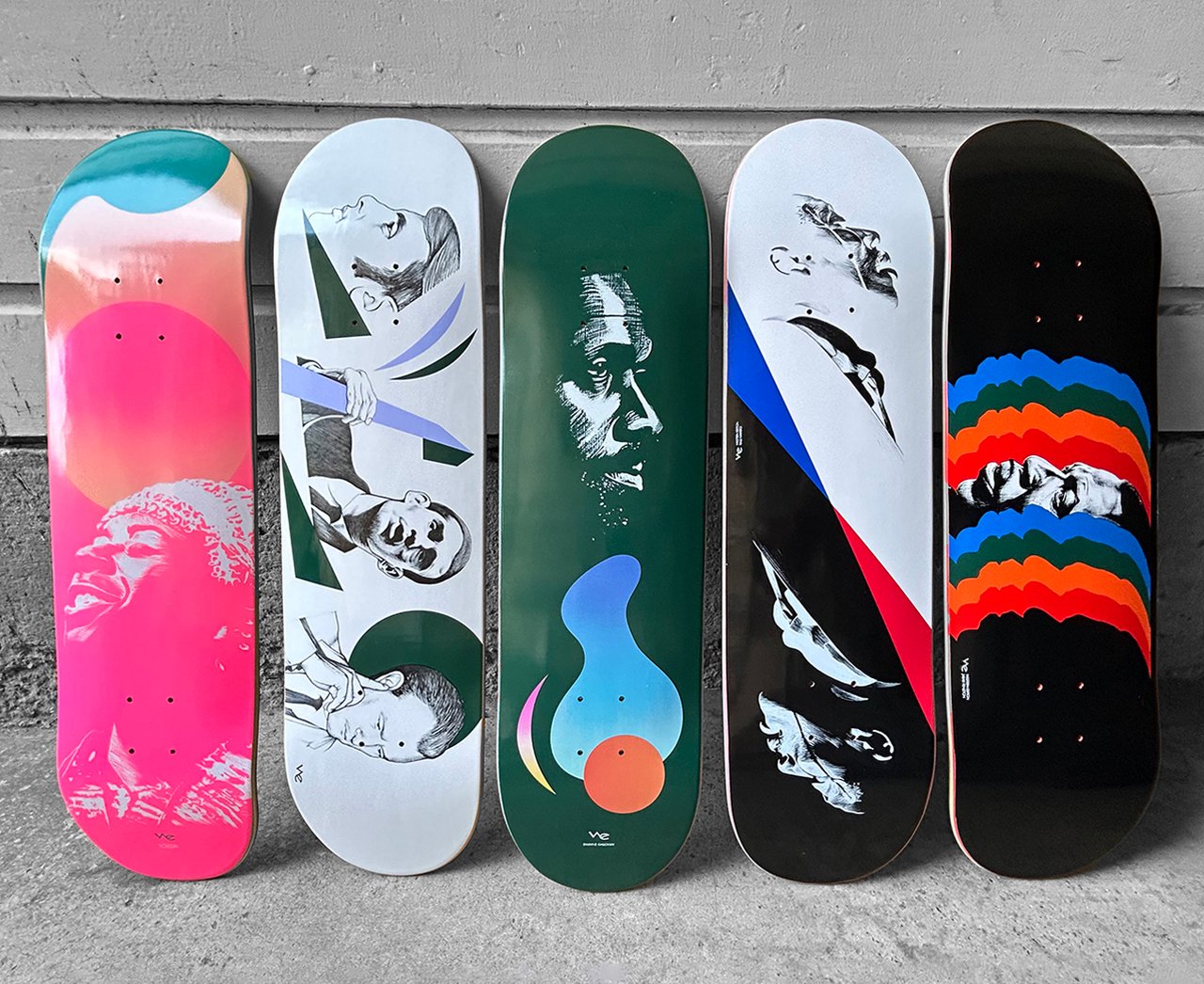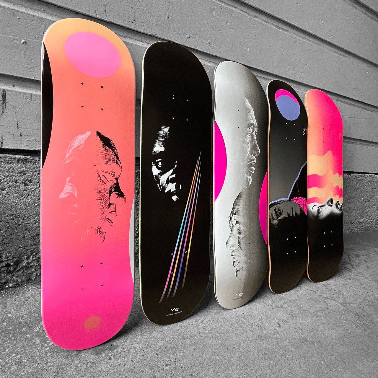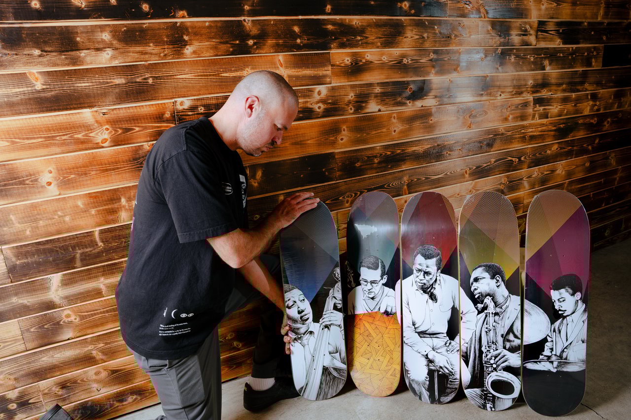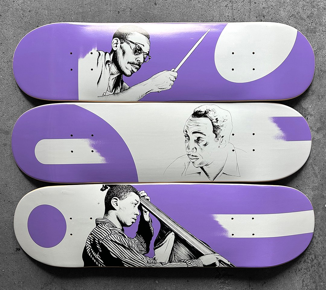 Ian Johnson is a painter, freelance illustrator and graphic designer. Music inspires his portraits of jazz musicians rendered on skateboards, murals, and other mediums. He notes the similarities of jazz music and skating as both use frameworks but allow for improvisation and flow.