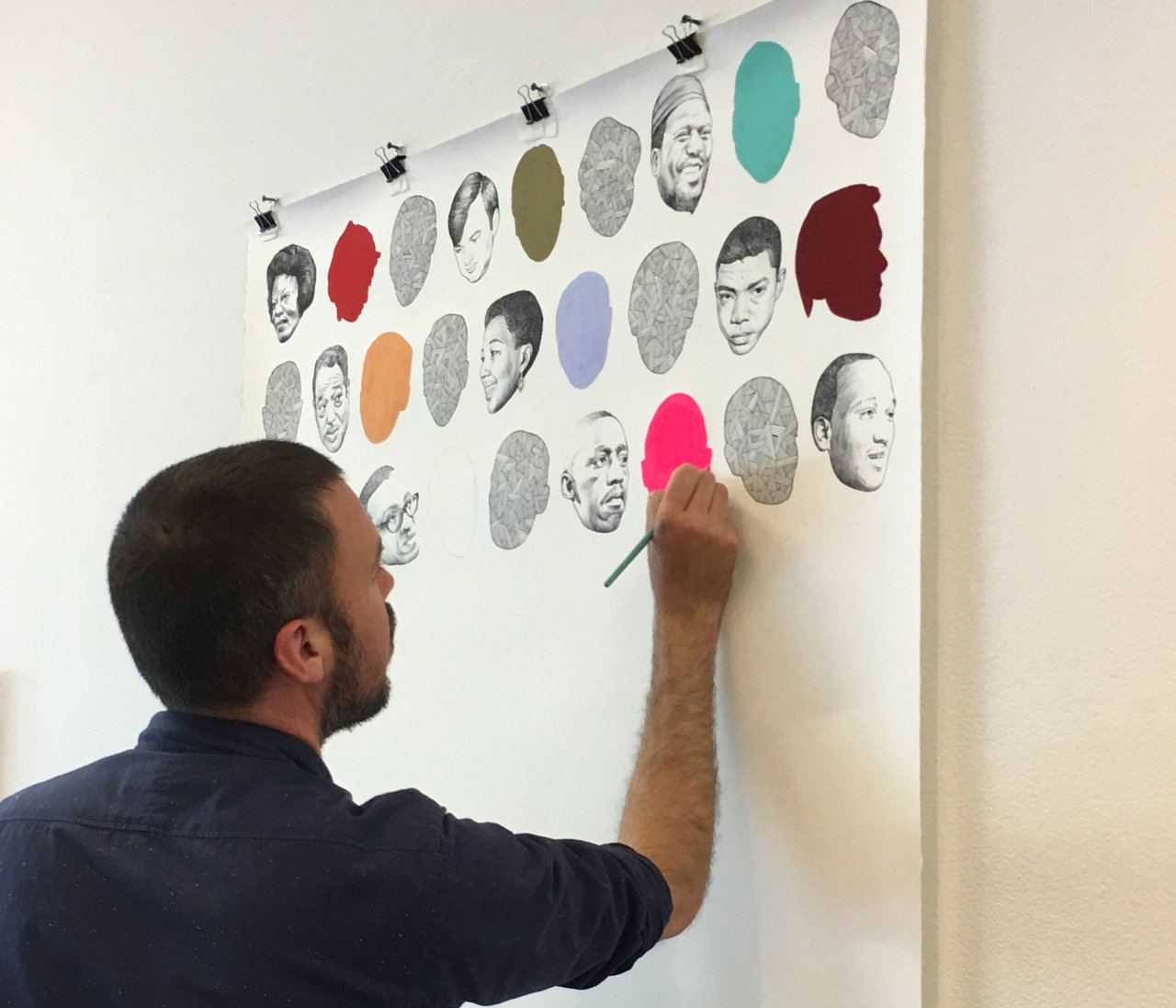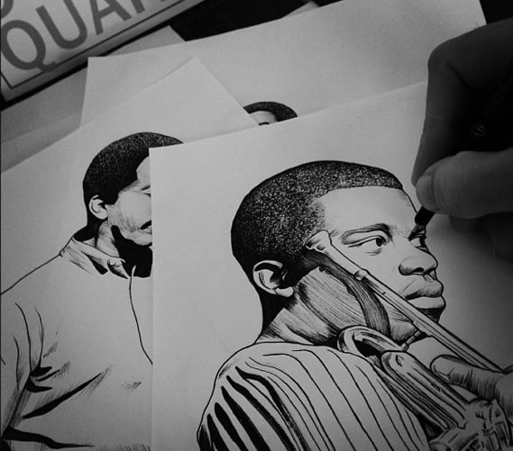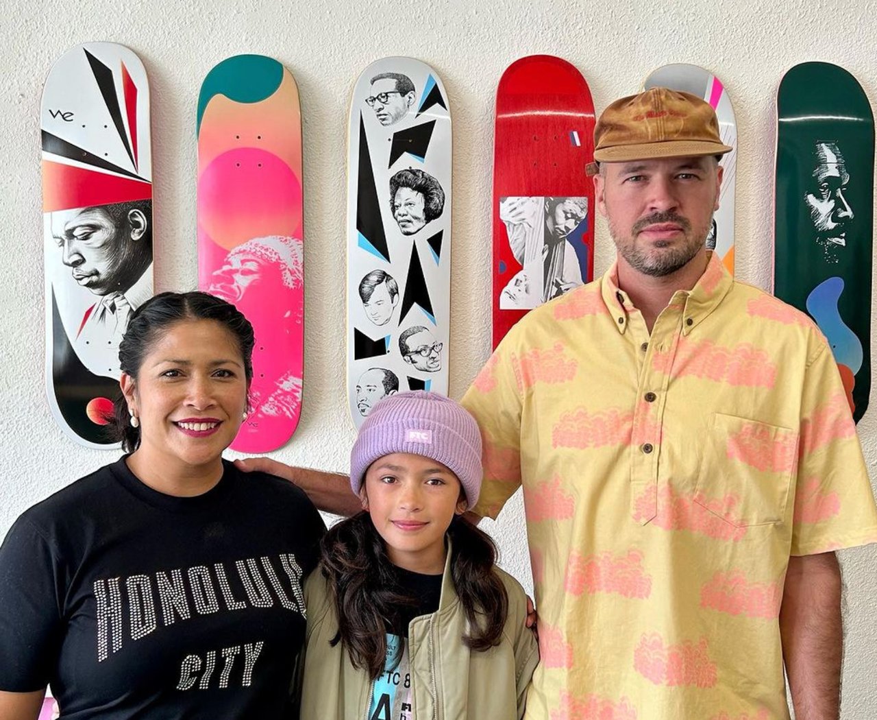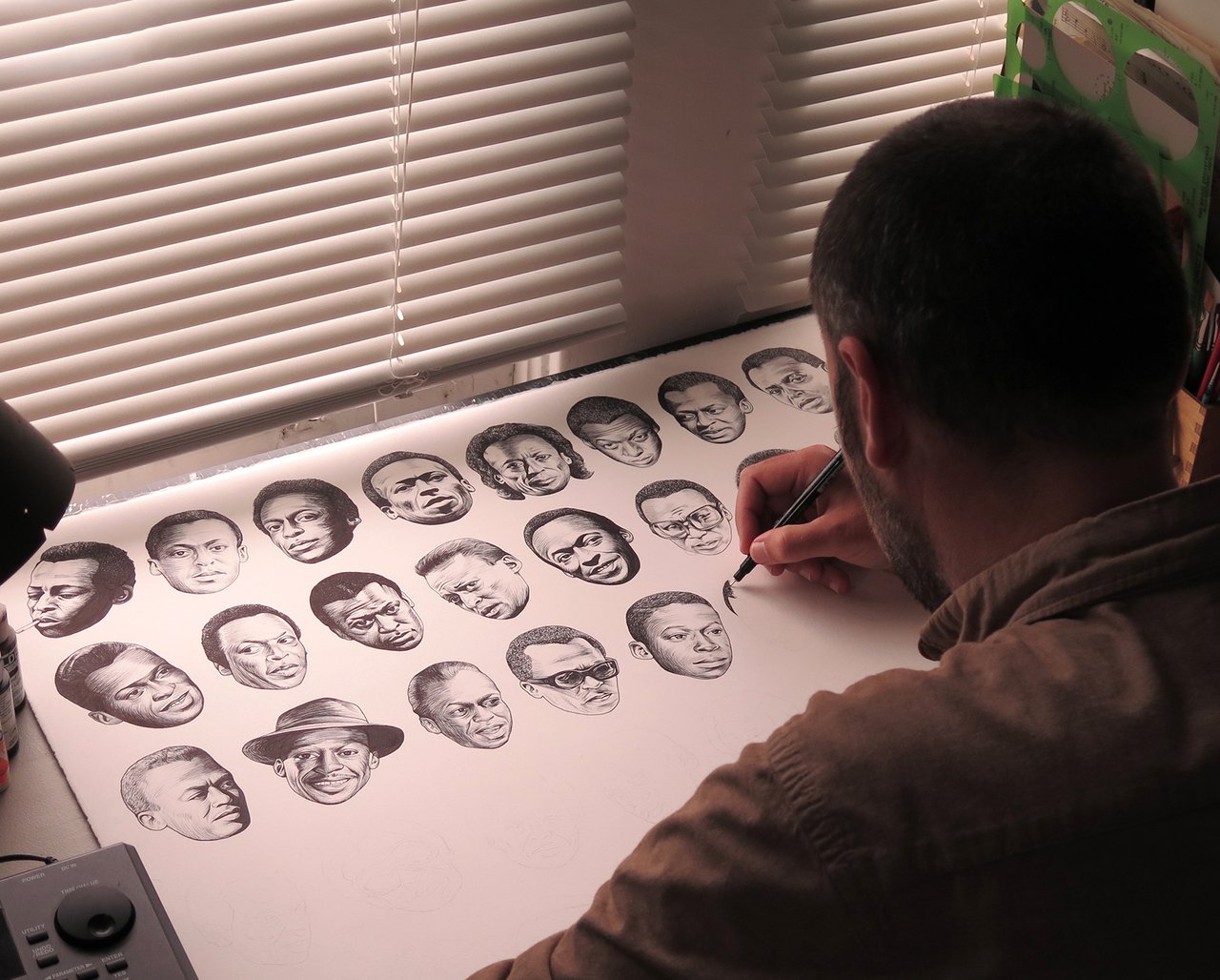 Ian Johnson is a painter, freelance illustrator and graphic designer. Music inspires his portraits of jazz musicians rendered on skateboards, murals, and other mediums. He notes the similarities of jazz music and skating as both use frameworks but allow for improvisation and flow.